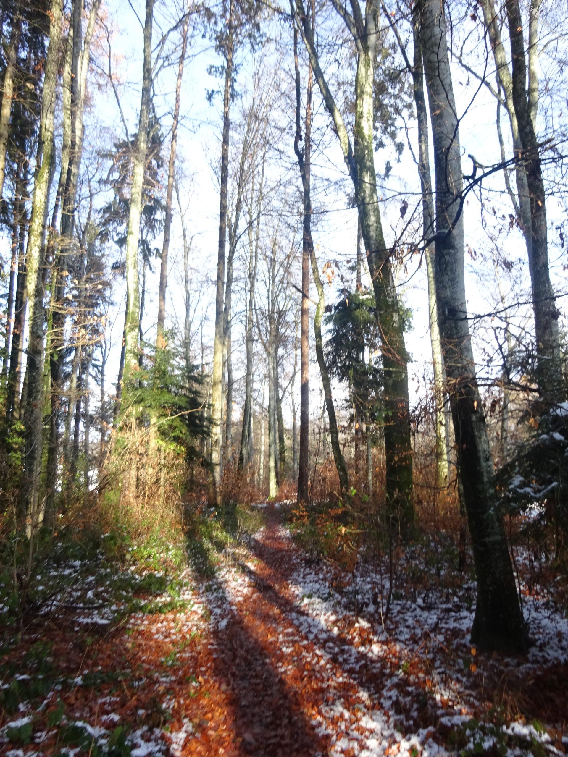 Une fois passée la croix, on devrait bifurquer en direction E quelques part, mais on a raté le balisage et suivi des traces qui continuaient tout droit. Rien de grave, on regarder la carte et décidons de pousser la ballade jusqu’à Montricher. C’est l’avantage des sorties en transports publics : pas besoin de nécessairement faire une boucle pour retrouver sa voiture. Descente donc dans la forêt en suivant les indicateurs de randonnée pédestre.