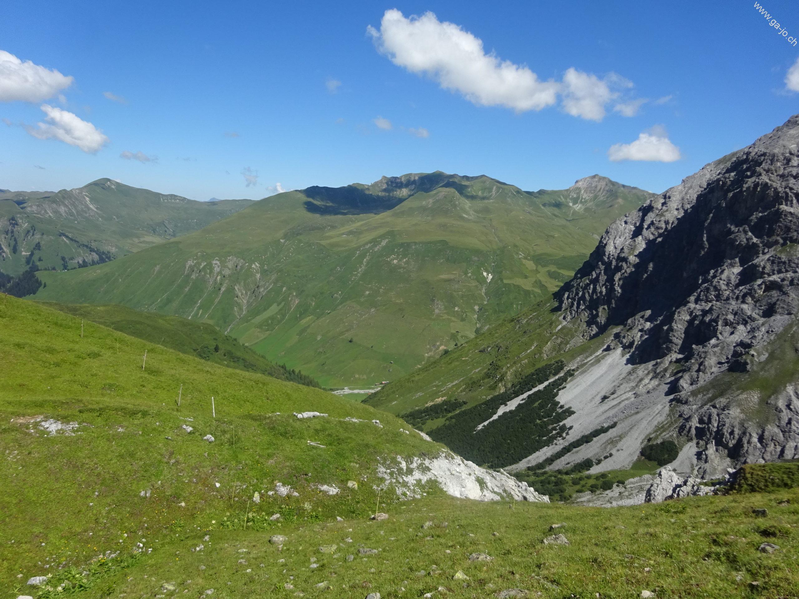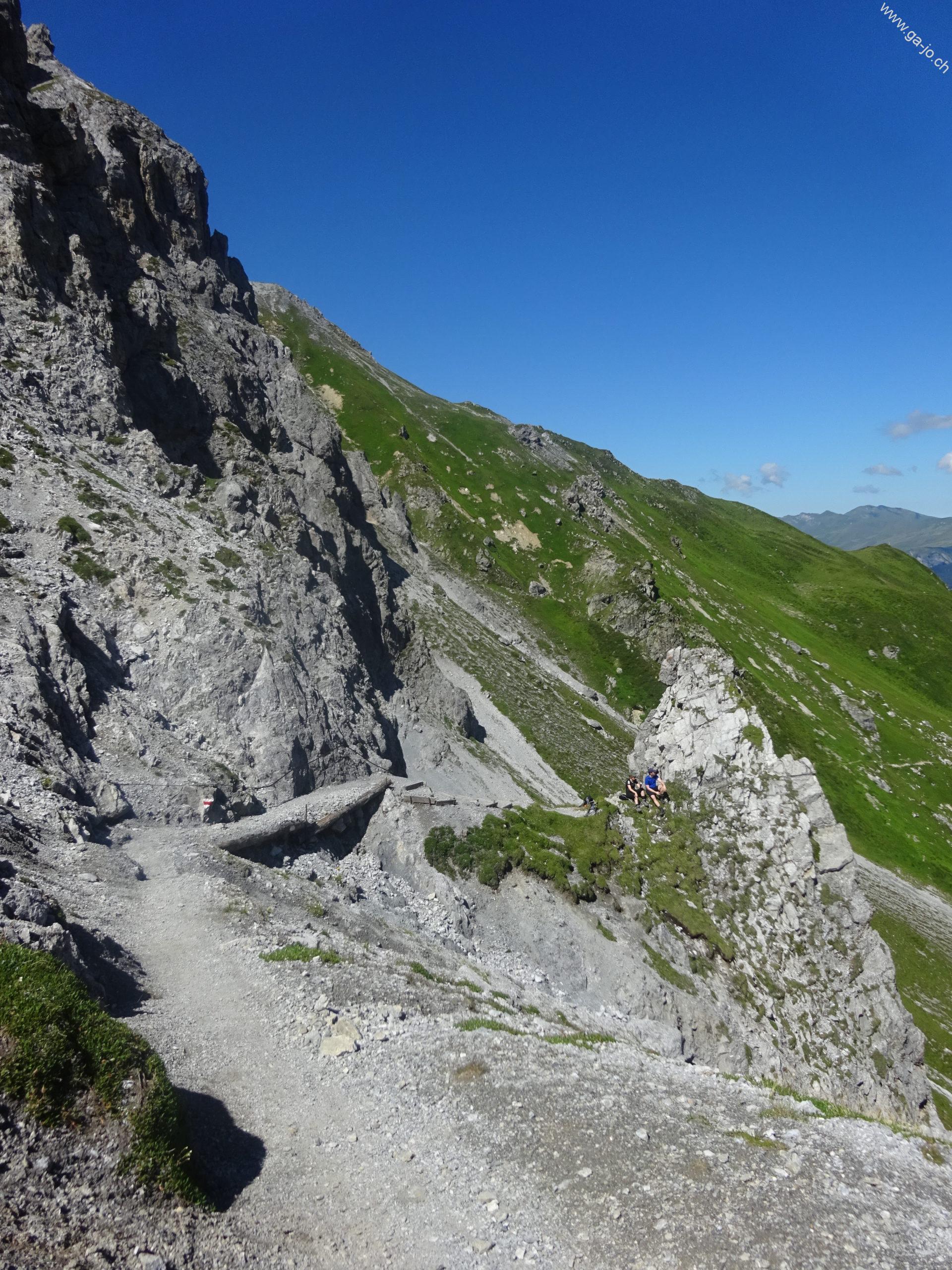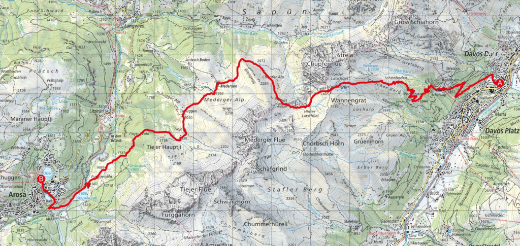 Il y a de nombreuses possibilités de relier Davos et Arosa. Nous avons décidé de suivre l’itinéraire “Mittelbünden-Panoramaweg” (54) principalement pour son passage vertigineux par le “Tritt” peu après le col de Lätschüelfurgga. Equipé de chaines et escaliers en métal, ce passage ne présente pas de grandes difficultés en soit mais n’est clairement pas recommandé pour les personnes sujettes au vertige. C’est uniquement ce court passage qui vaut à cet itinéraire la cotation T3. Le départ de Davos Dorf peut-être légèrement raccourci en empruntant le funiculaire montant à Schatzalp en début de parcours.