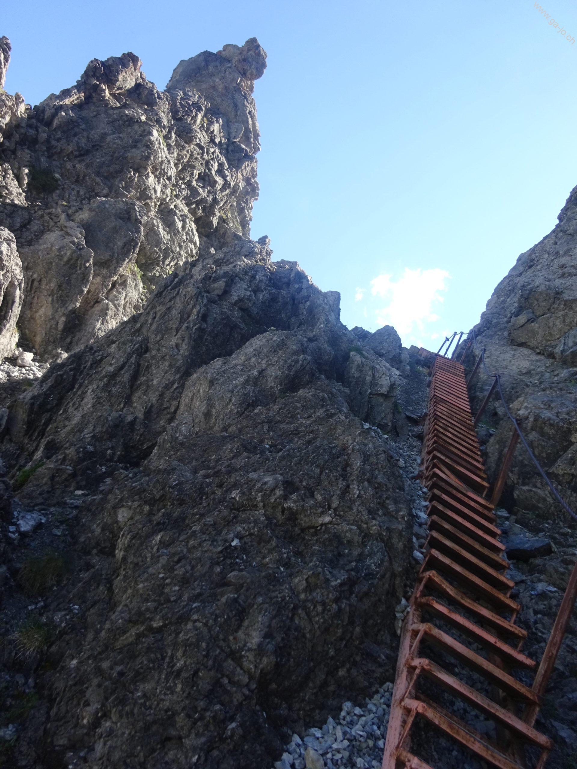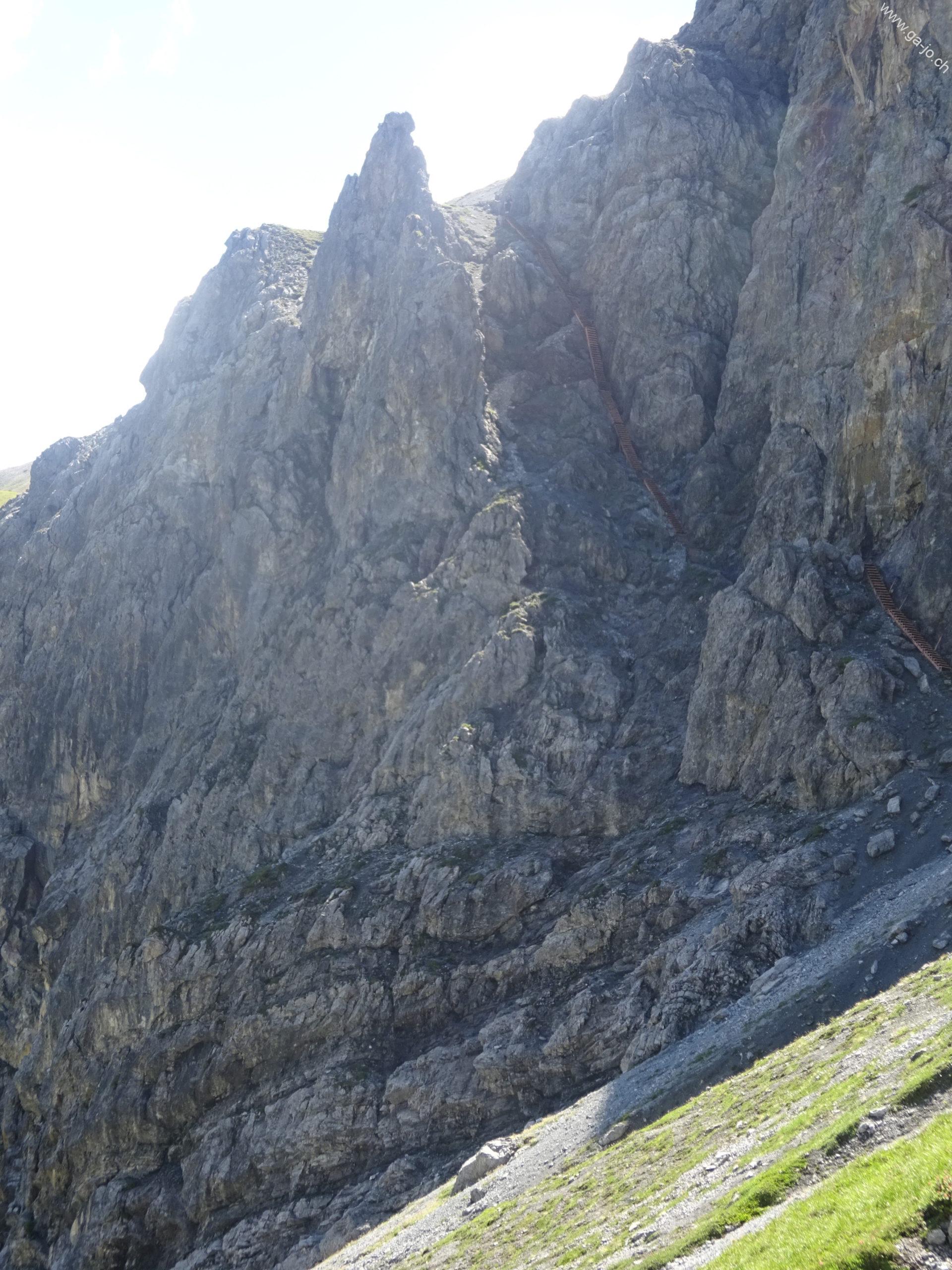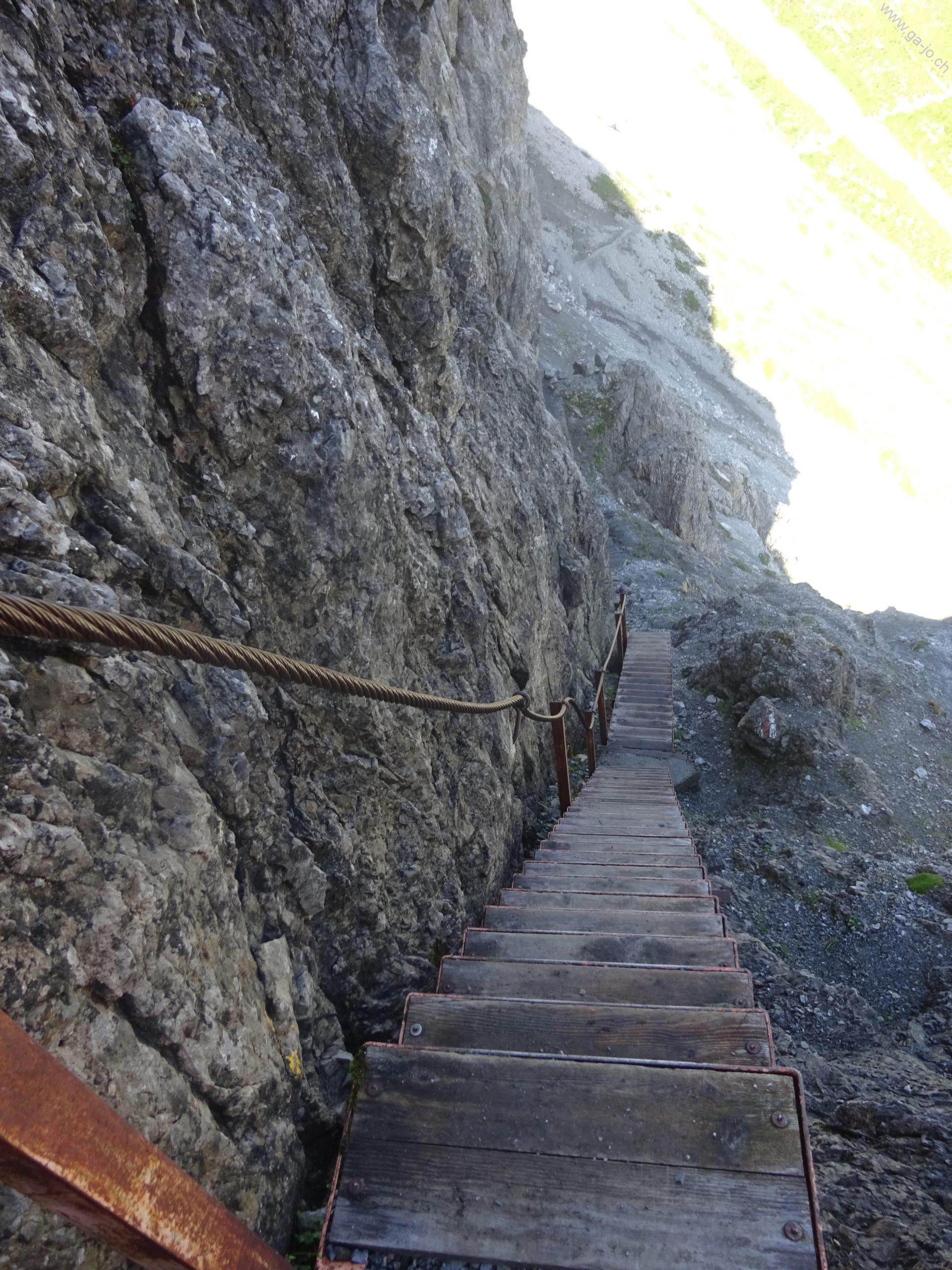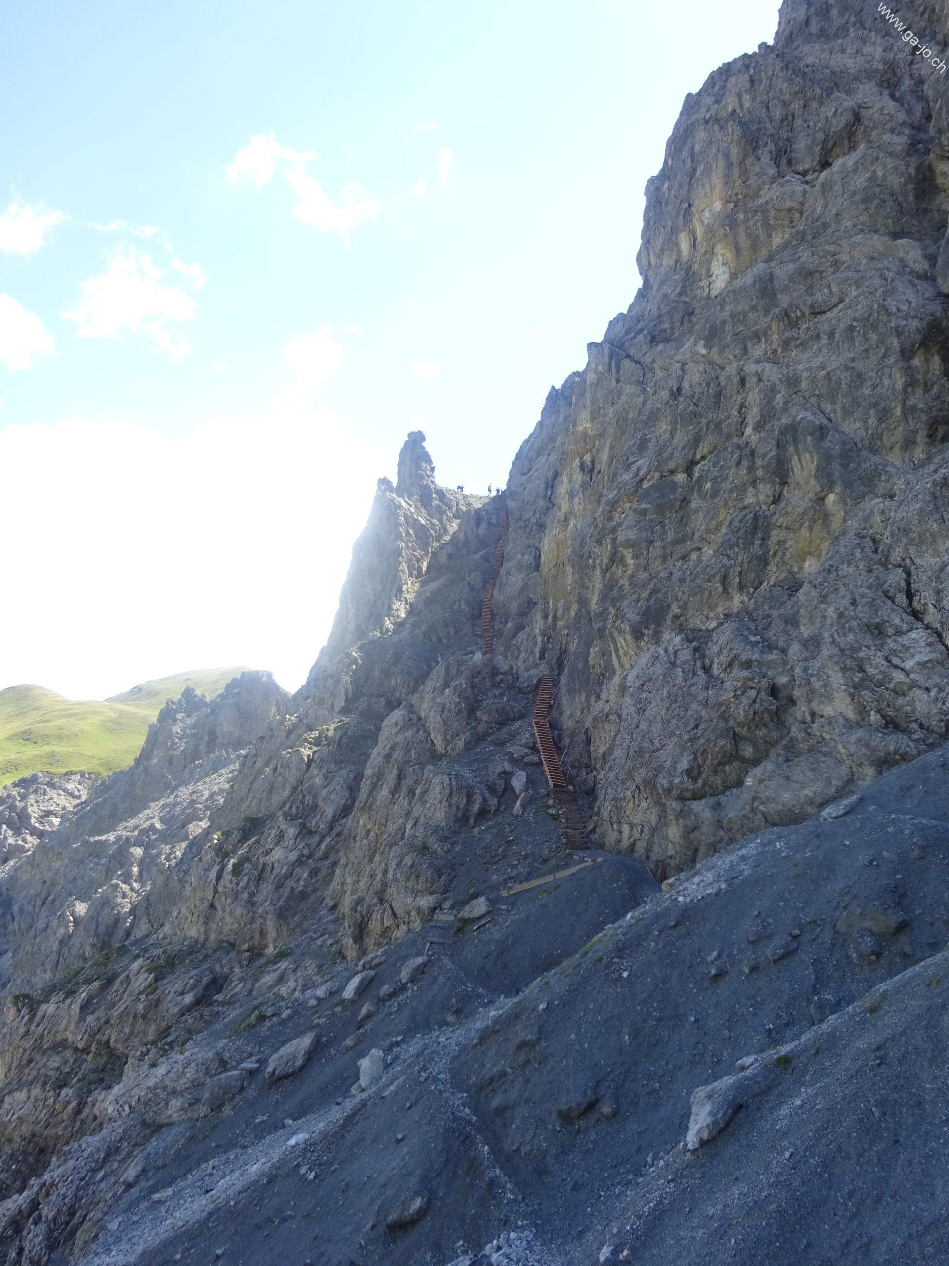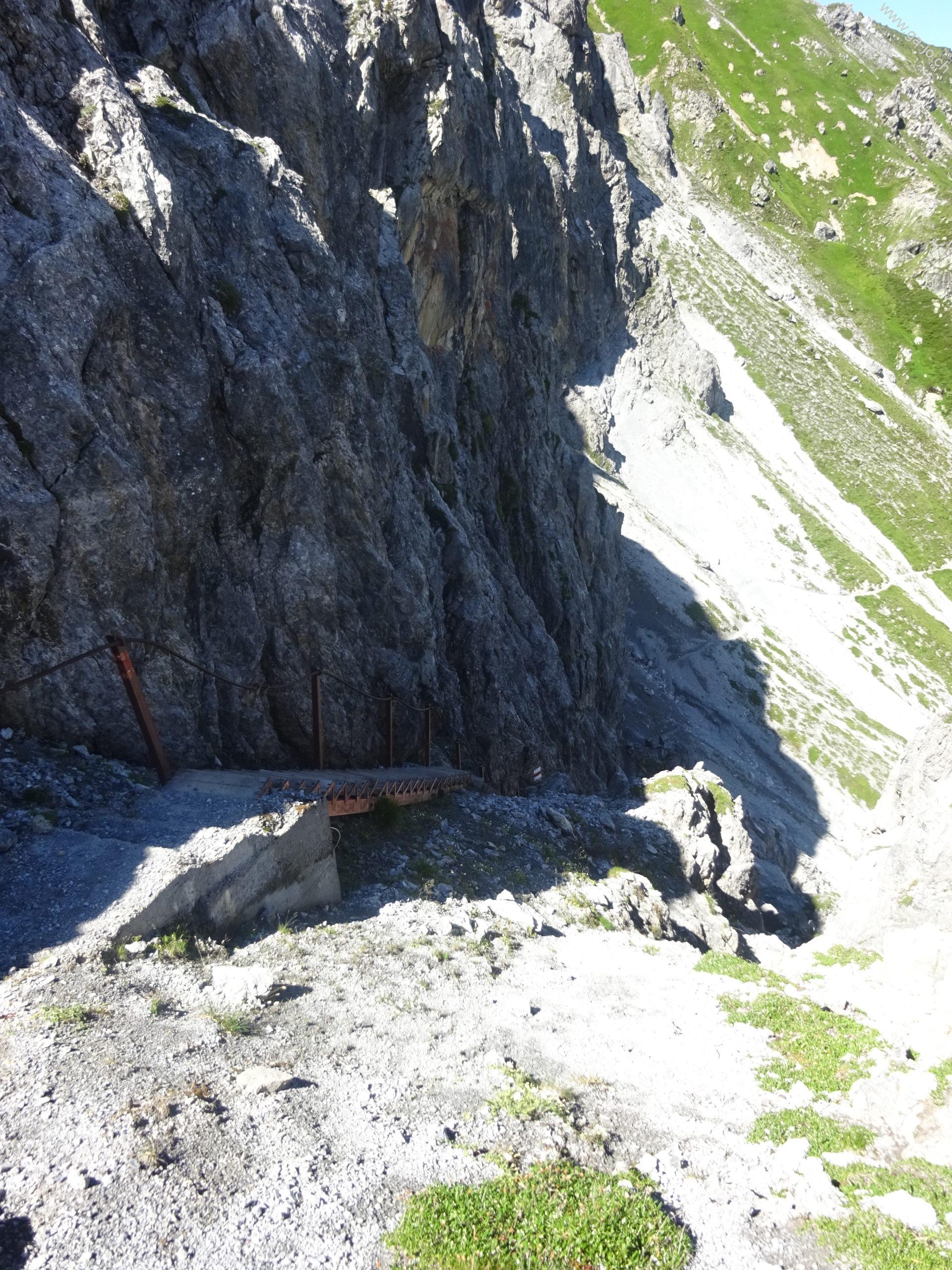 Une fois le col passé on redescend en pente assez douce, en direction du joli hameau de Medergen. Le passage à travers la barre rocheuse est assez vertigineux, et même si des câbles et escaliers sont là pour aider, il faut avoir le pieds sûr.