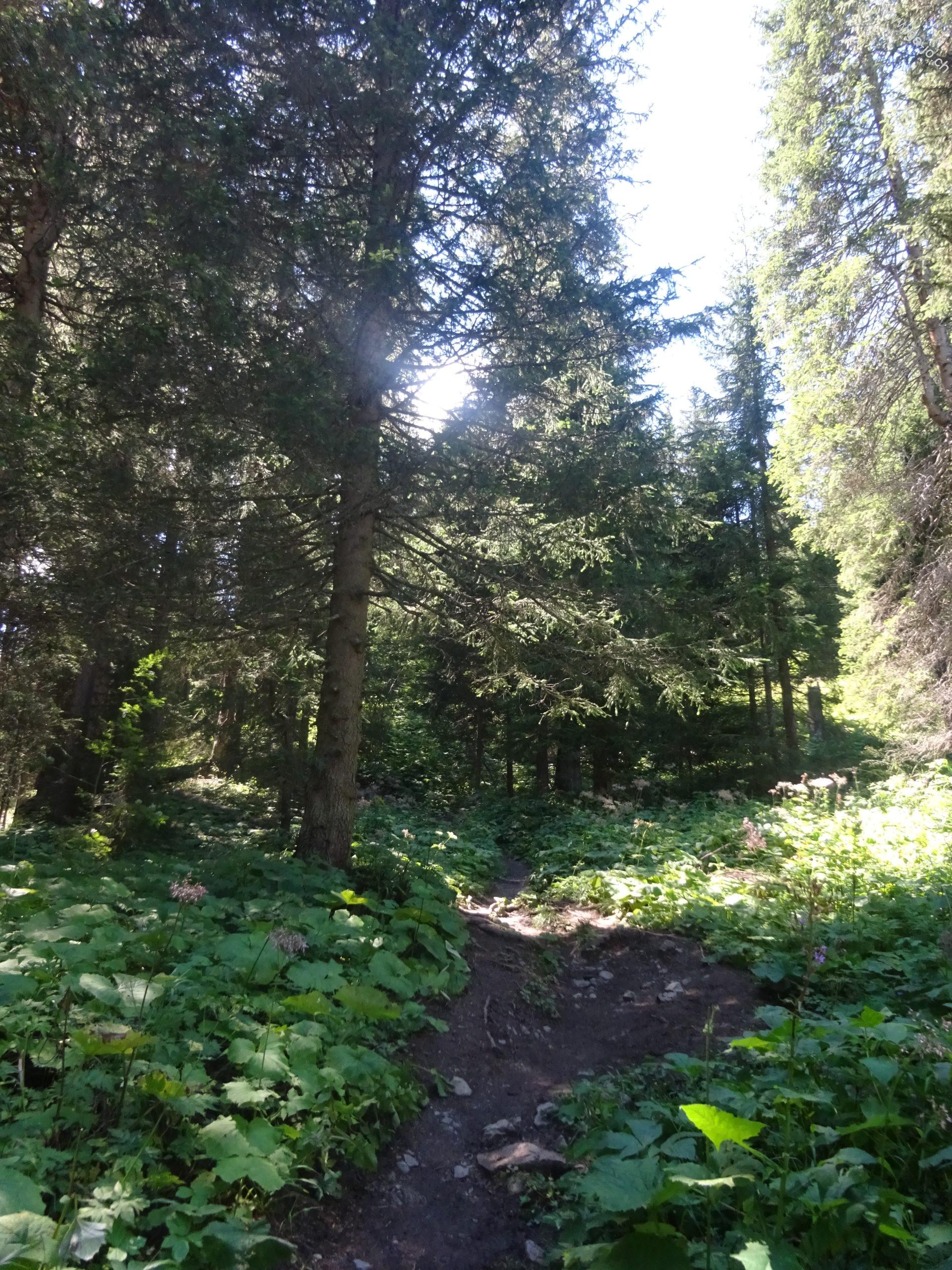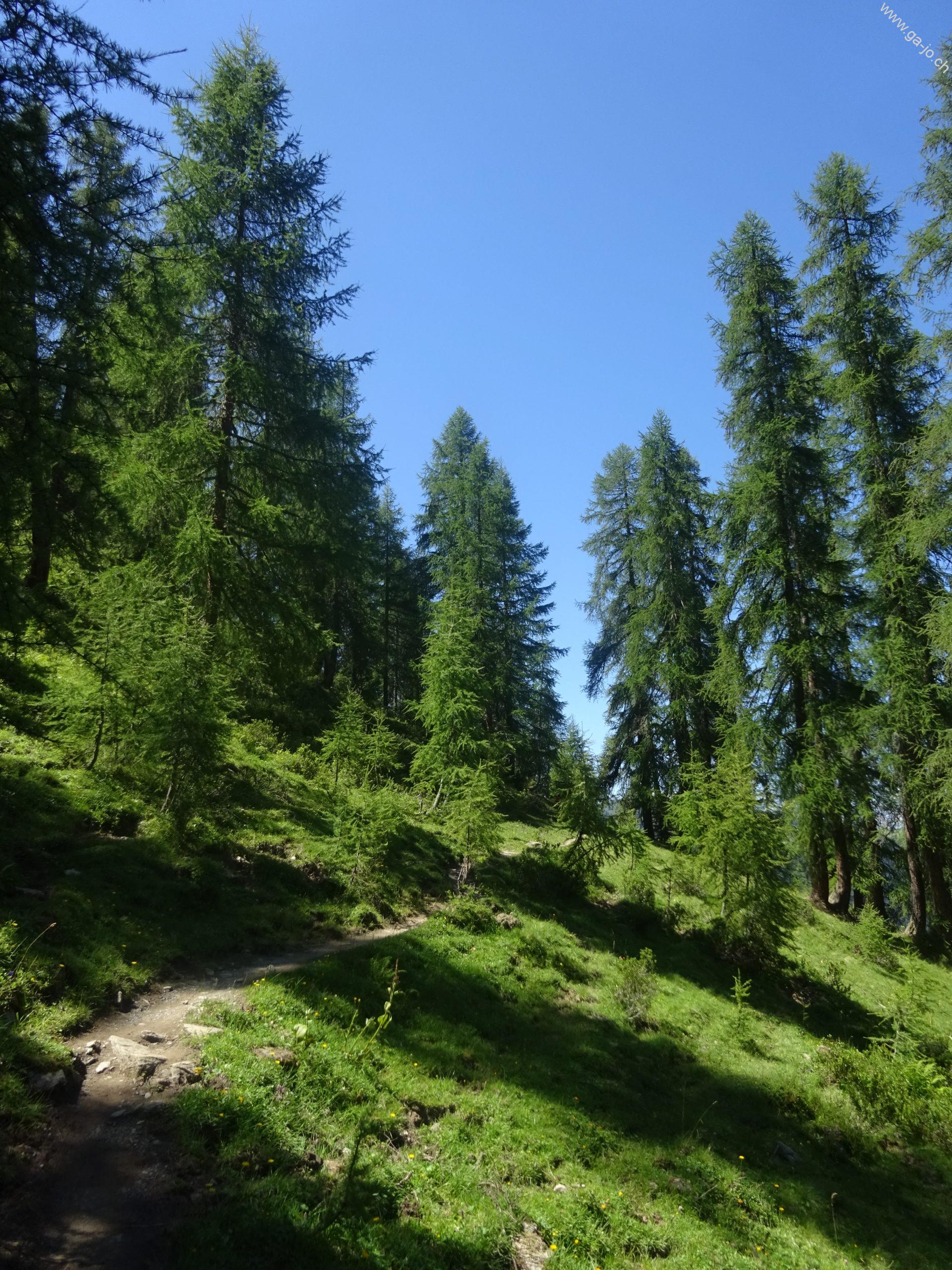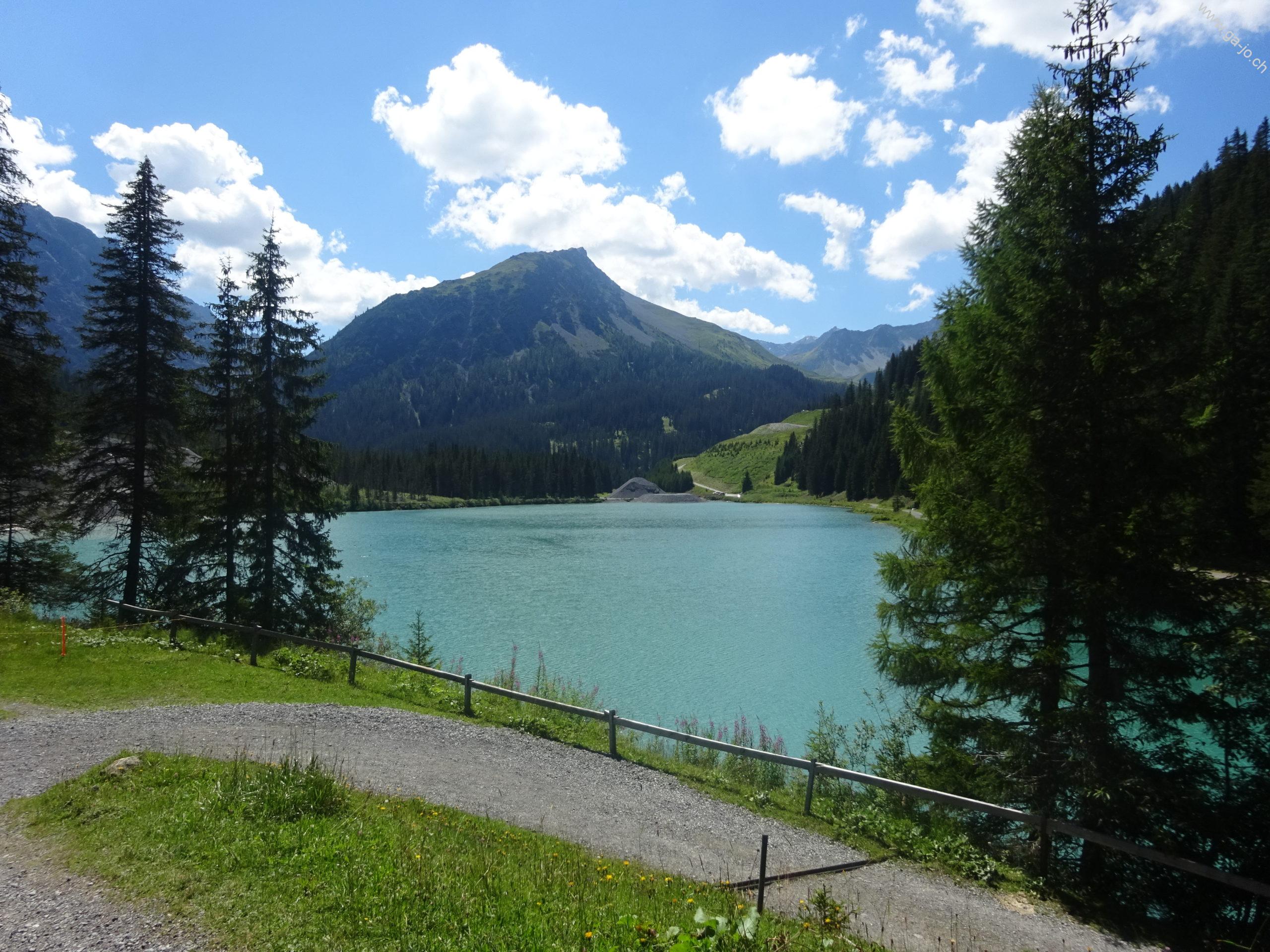 De là, le chemin remonte quelque peu sur une route d’alpage avant de redescendre, par la forêt, au fond du vallon pour rejoindre le lac artificiel de Isel.