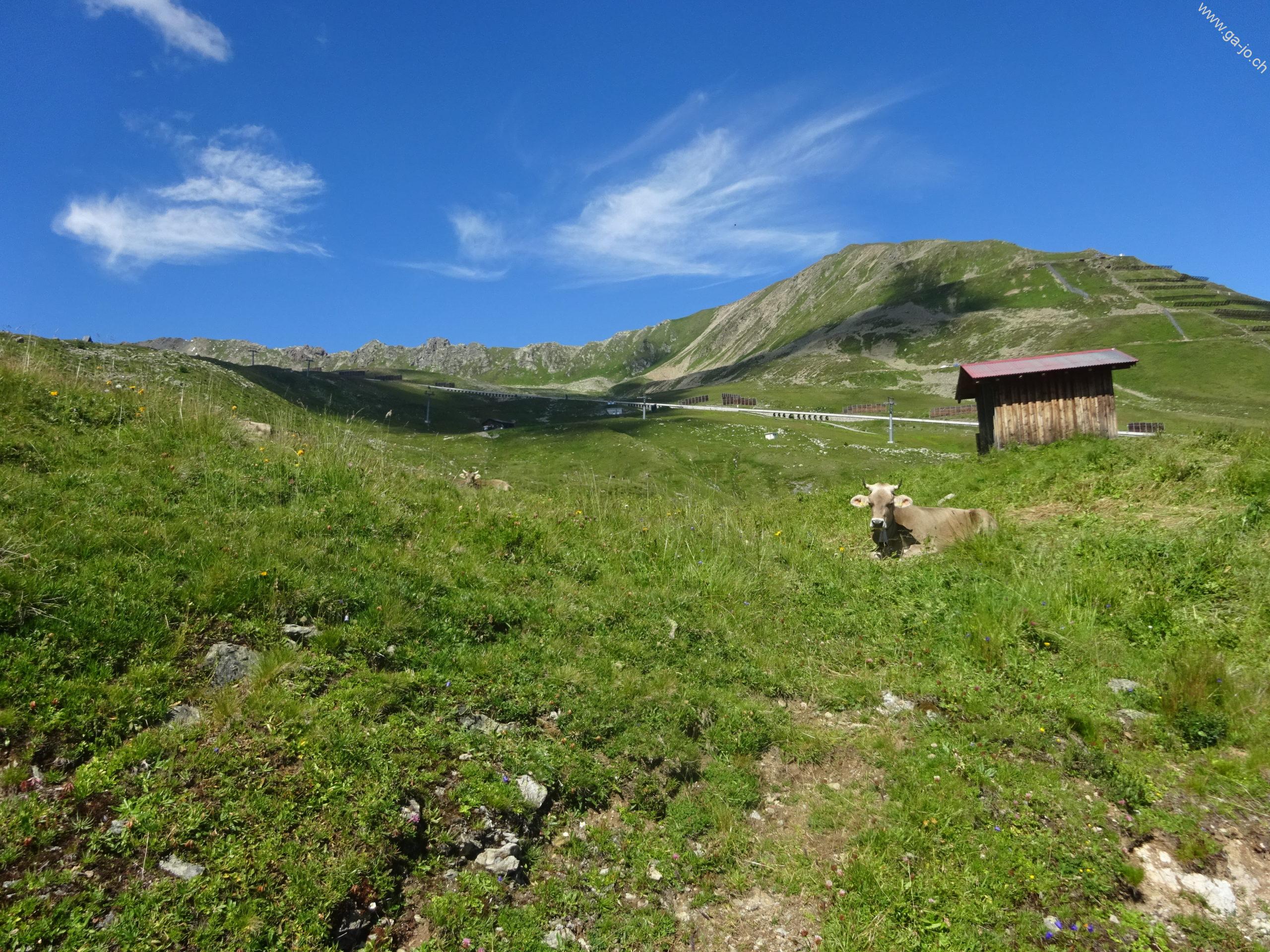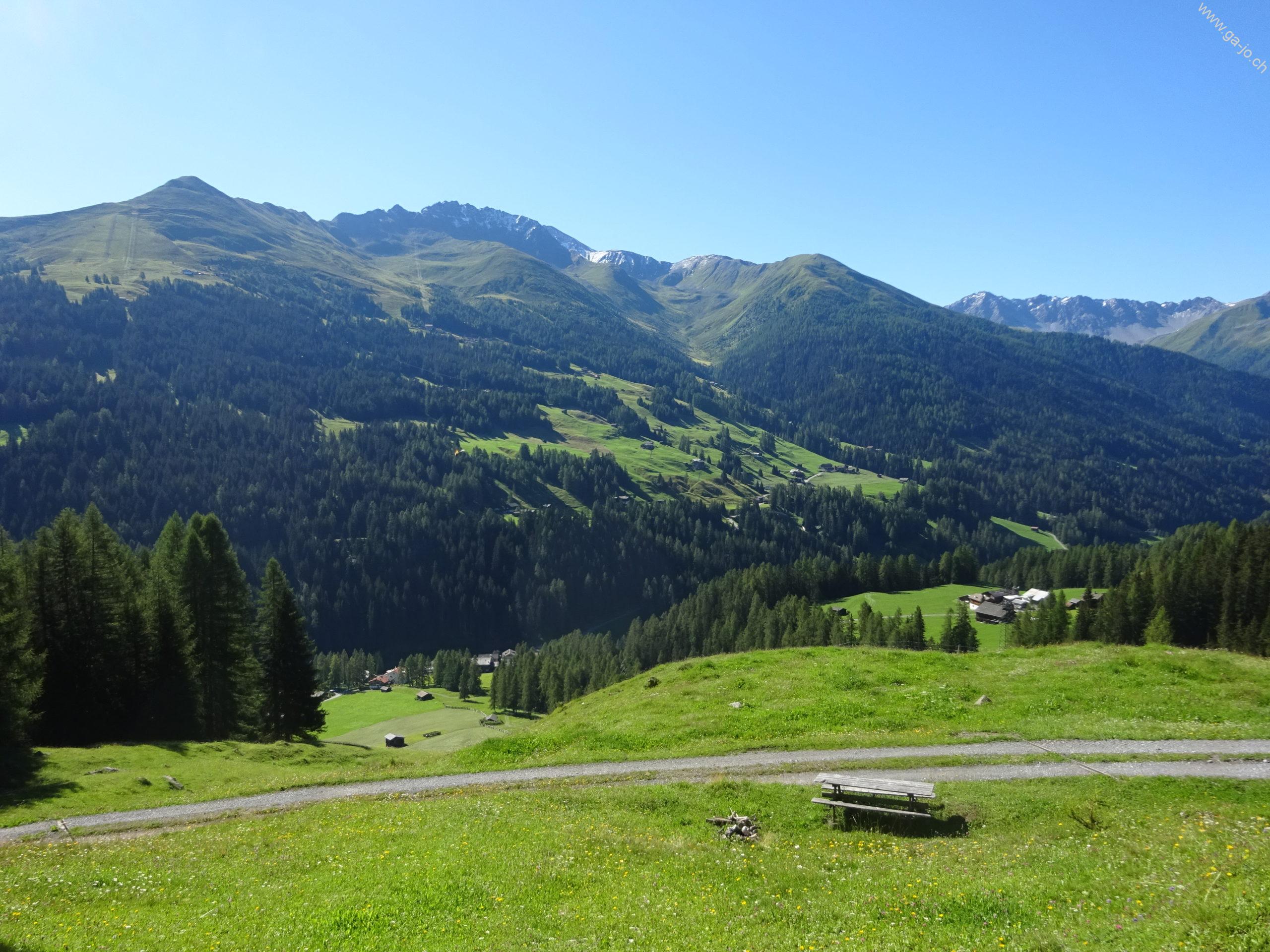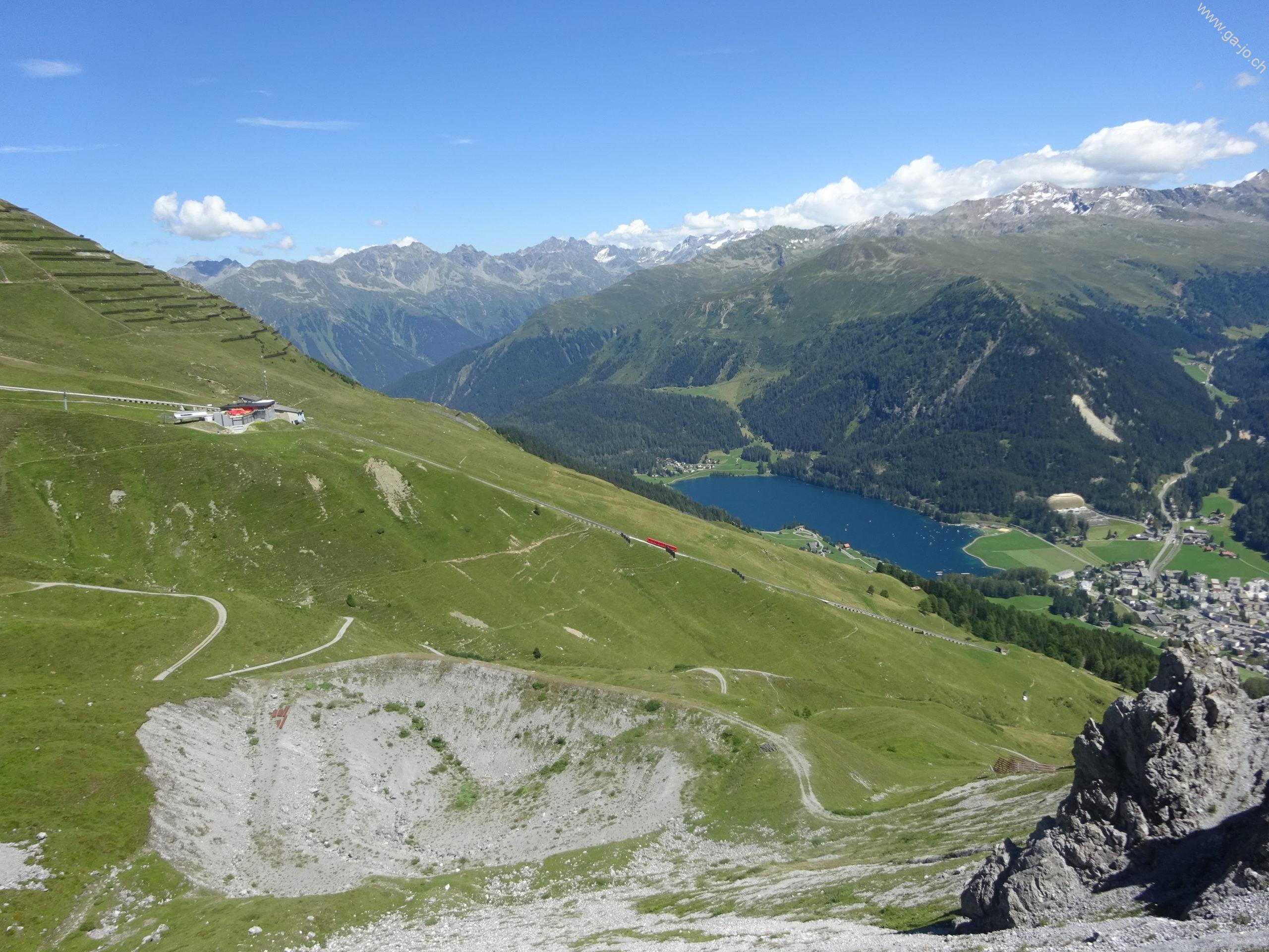 Une fois Strellapass et sa buvette d’alpage passée, on continue à flanc de coteau par la Panoramaweg en direction du funiculaire de Parsenn. Peu avant la station intermédiaire “Höhenweg” nous bifurquons et redescendons en direction de Davos Dorf.