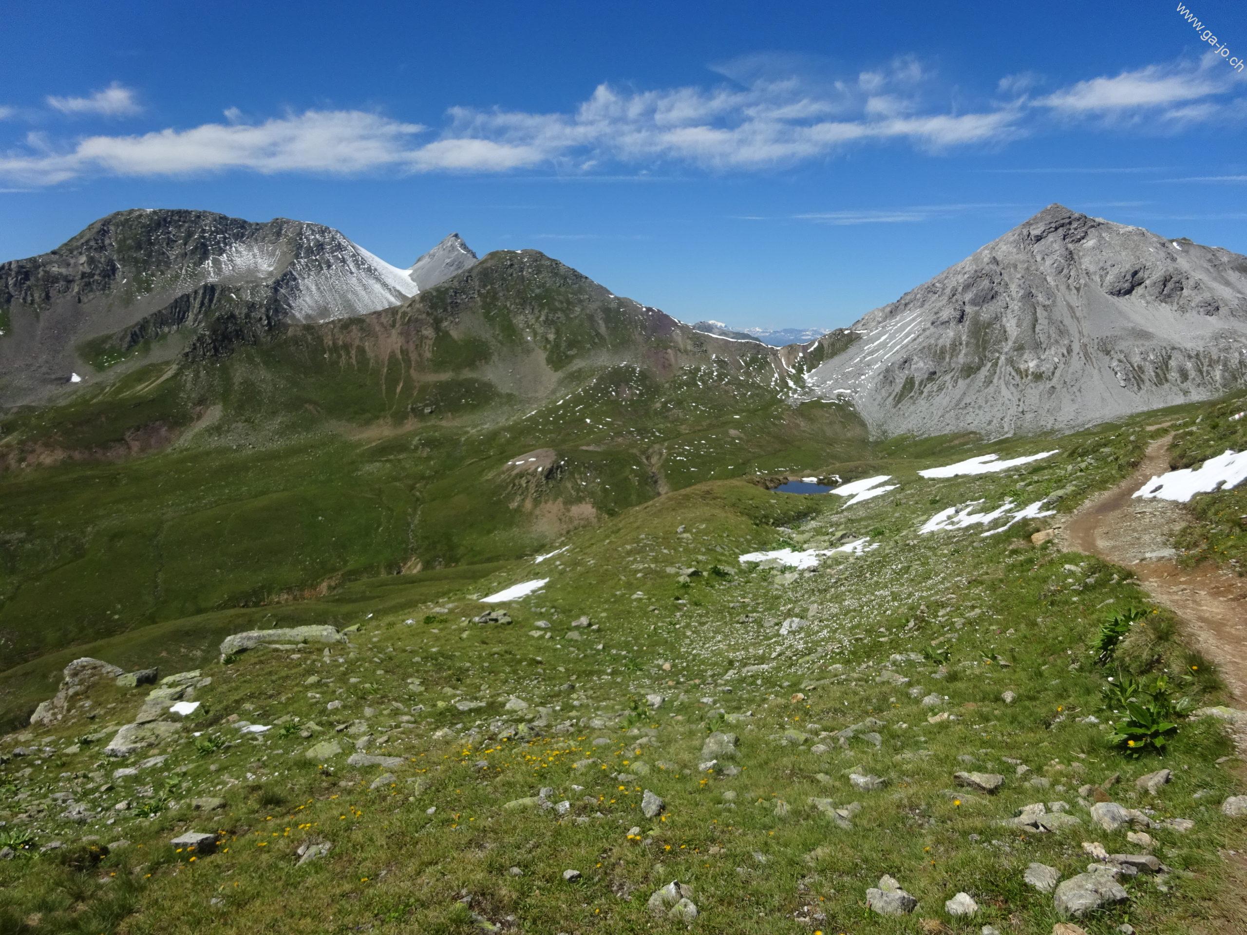 Le sentier continue en direction de Strelapass en contournant par l’ouest le Wannengrat et passant par le Latschüelfurgga (col que nous emprunterons demain pour rejoindre Arosa).