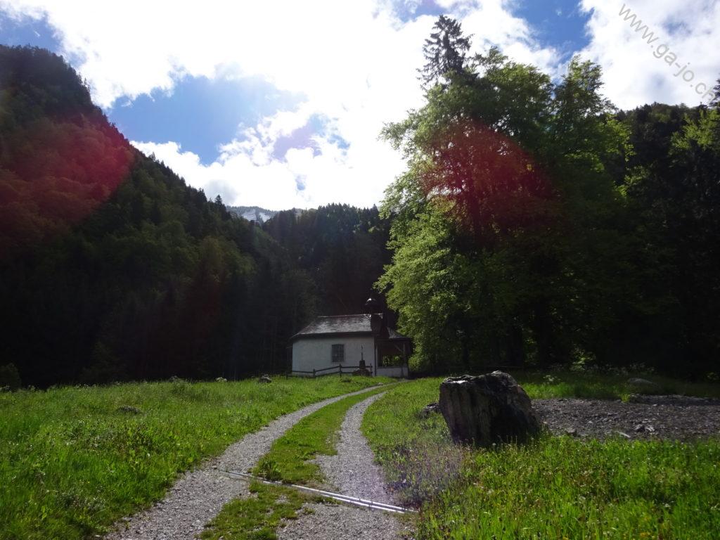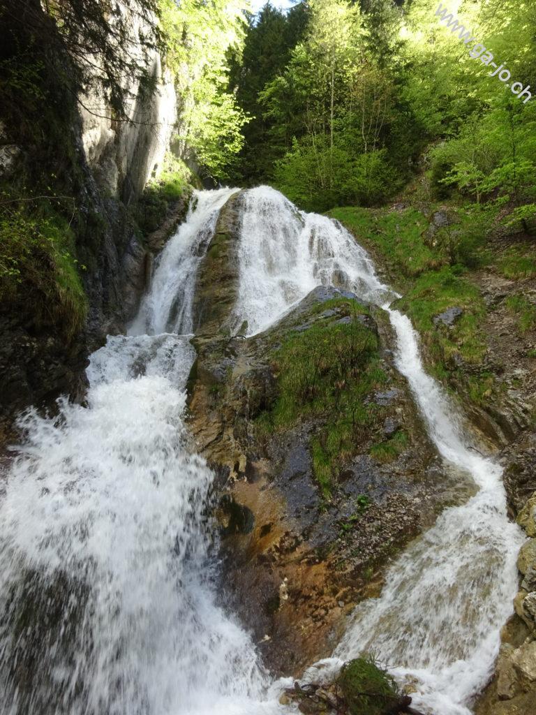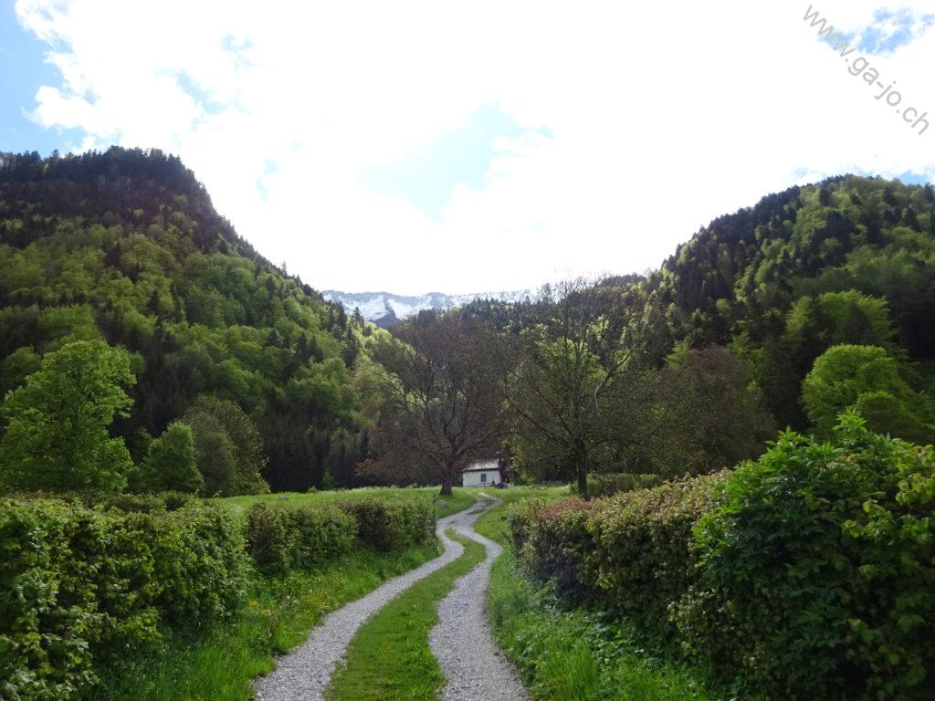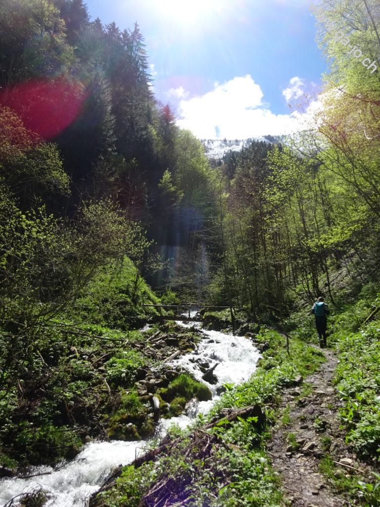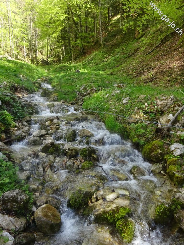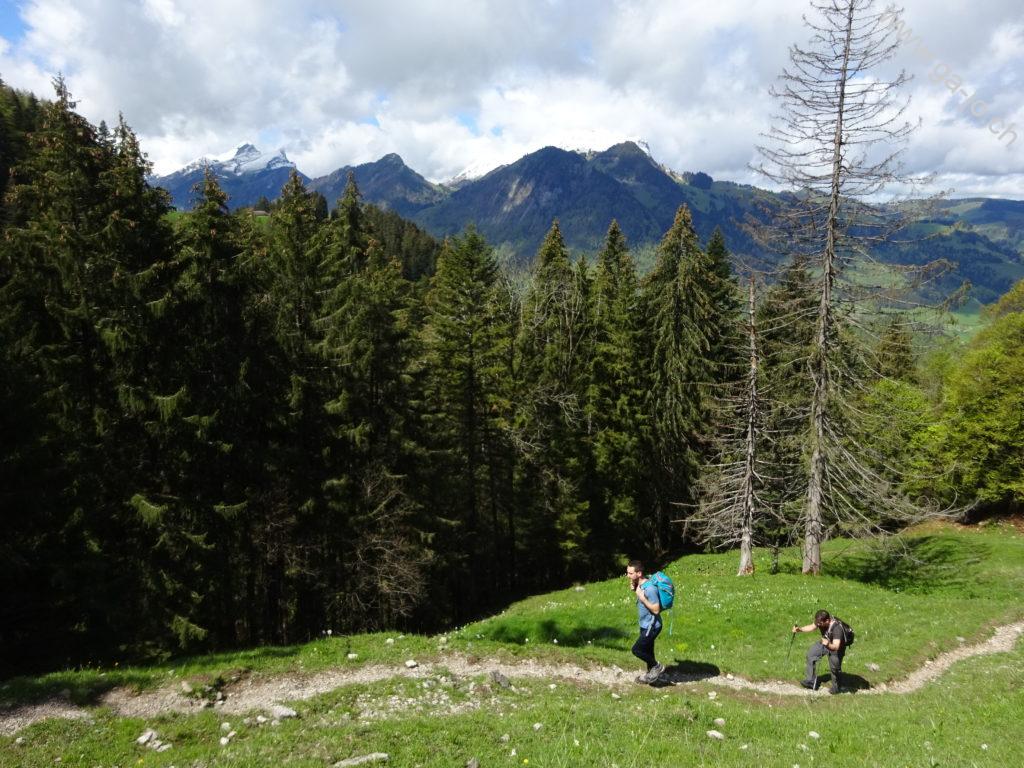 Nous sommes parti de la gare de Enney, point le plus proche accessible en transports publics. On doit tout d’abord traverser la Sarine par le seul pont à proximité, puis remonter la route jusqu’à Estavannens. Cette partie peut certainement être raccourcie en fonction des horaires de bus, peu favorables pour nous ce dimanche. Une fois le village traversé, on passe par la chapelle du Dâ et on suit la rivière du même nom, ayant aujourd’hui un débit respectable suite aux précipitations de la nuit passée. Le chemin monte dans la forêt et est assez exigeant mais très confortable et bien entretenu. On arrive à “la Cierne” au pt. 1225.