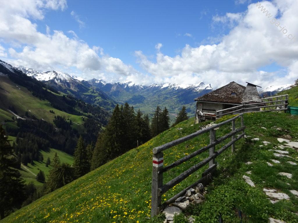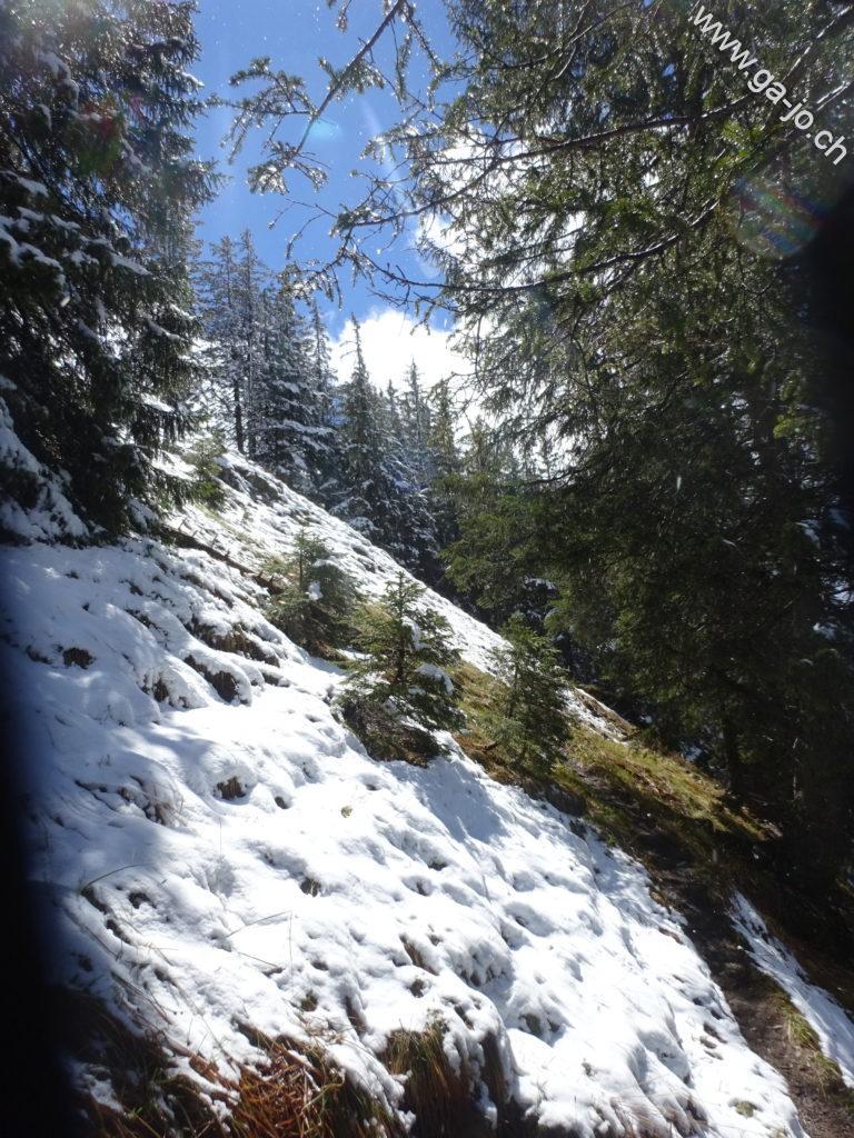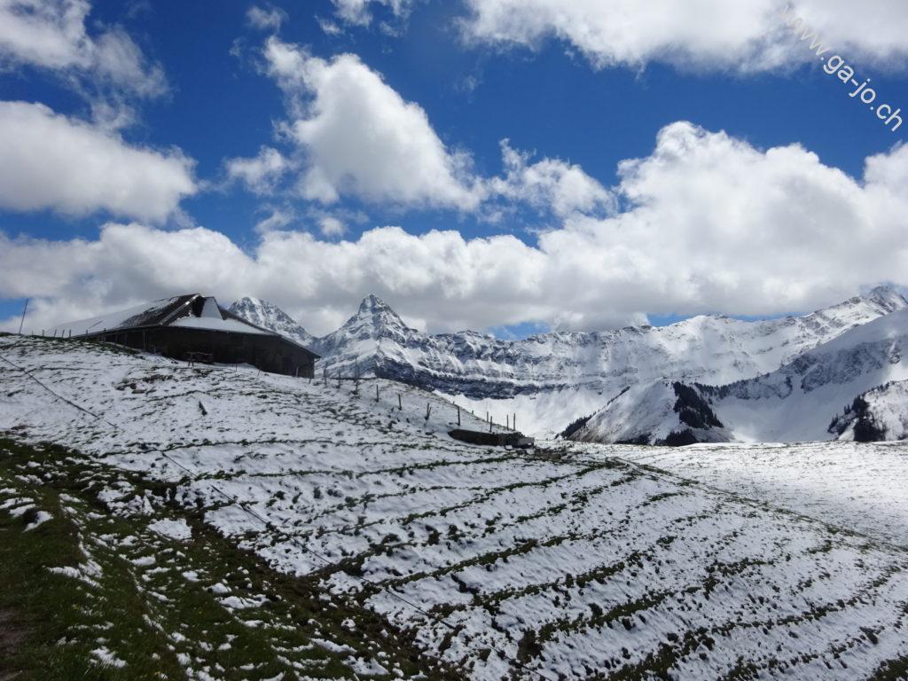 On suit ensuite une route d’alpage avec une vue sur le Moléson derrière nous jusqu’au pt.1294 ou l’on bifurque sur la gauche à travers les pâturages. Une fois arrivés à un chalet d’alpage, le chemin continue à monter en suivant la crête. Un second chalet (pt. 1552) passé, le chemin continue à monter on rencontre alors les premiers névés et on joint le niveau des dernières neiges tombées la nuit passée. On arrive à la bifurcation permettant de rejoindre Vacheresse, à droite ou le col de la Forcla, à gauche. On continue en direction de Vacheresse, la Forcla sera notre chemin de retour.