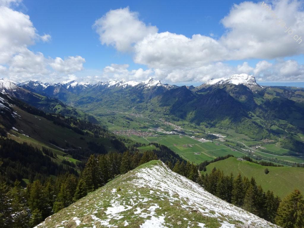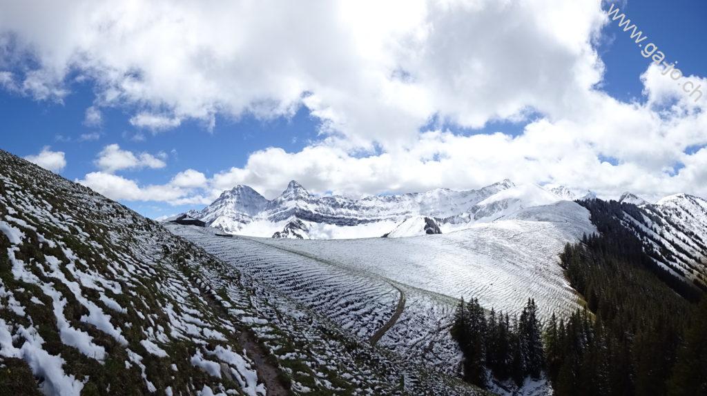 Là le chemin, n’est plus tout à fait enneigé, mais très boueux et très gras. Cela devient bien glissant, ce n’est pas un passage particulièrement exposé mais la pente est quand même bien présente, on veut éviter de tomber. On ne tarde à découvrir face à nous les dents de Brenleire et de Folérian, ainsi qu’au loin, le Vanil Noir, tous fraichement enneigés. Dans notre dos, toujours le Moléson et la dent de Lys, entre autres. On arrive finalement à Vacheresse, juste à l’heure pour le pique-nique.