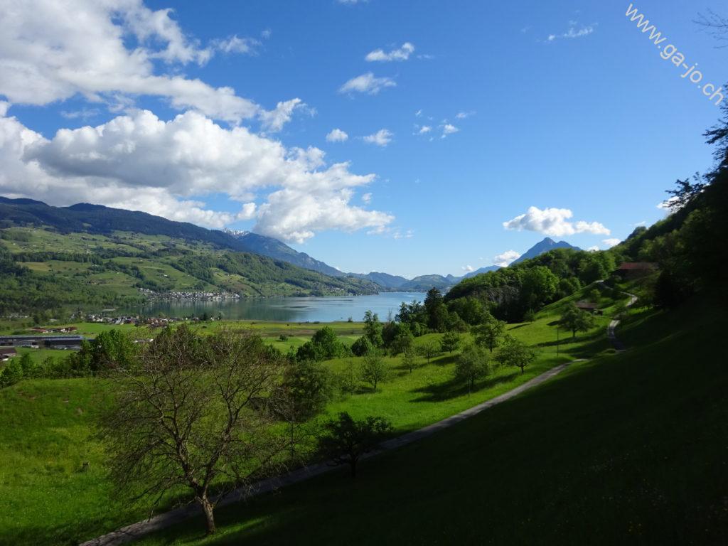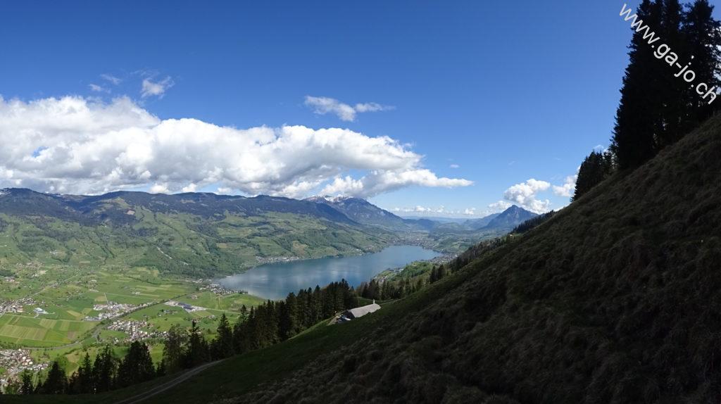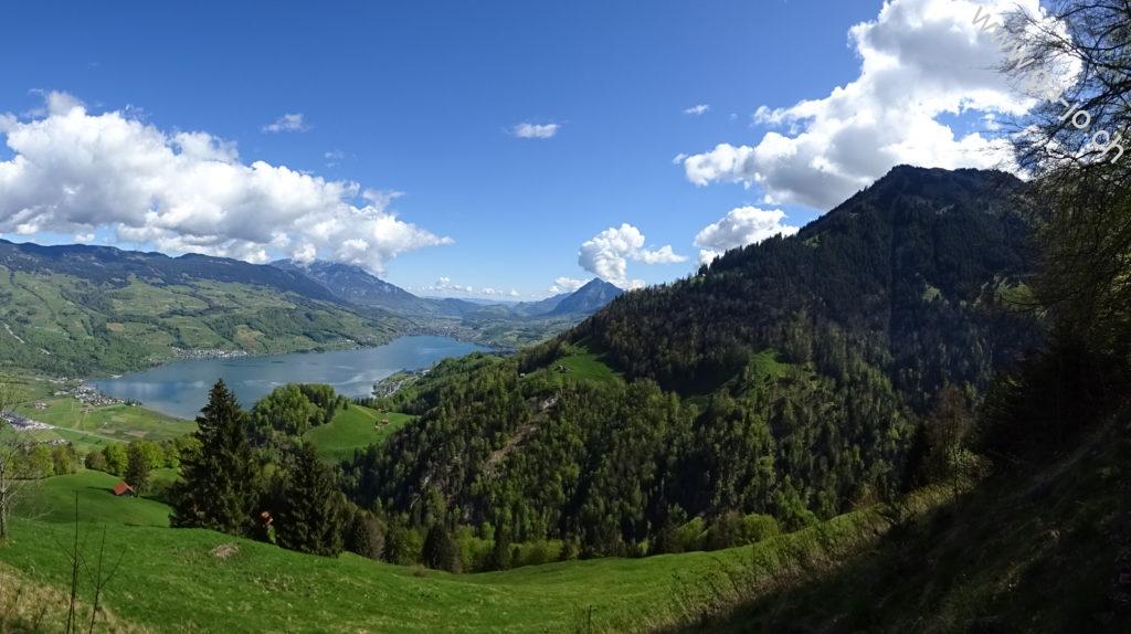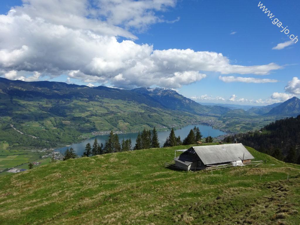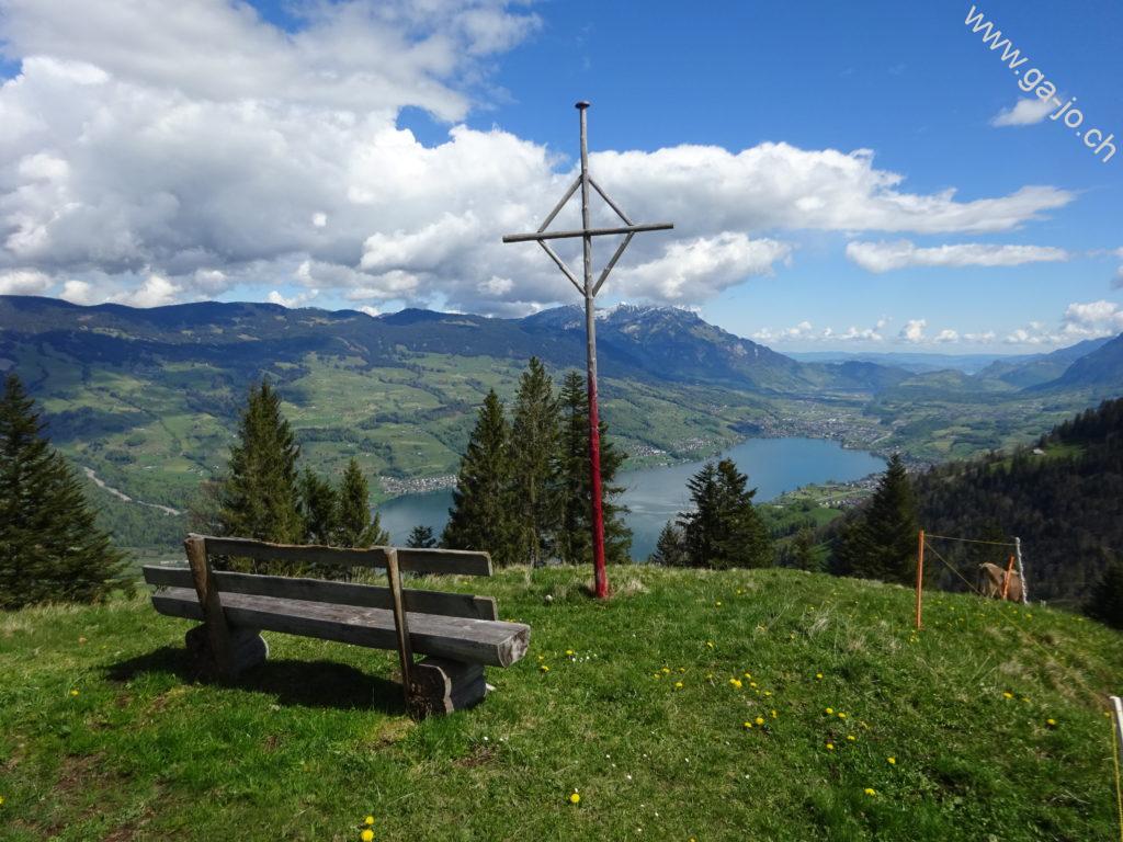 Au fur et à mesure que nous montons, la vue derrière nous s’ouvre sur le lac de Sarnen d’abord, puis sur les lacs d’Alpnach et des Quatre-Cantons. Le mont Pilatus a la tête dans les nuages mais le Stanserhorn en face à l’est, veille bien sur nous. On arrive finalement au pâturage de Bärfallen, la montée assez raide continue pour finalement arriver à Brunnenmad et au pt. 1342 sur la carte où il y a une croix.