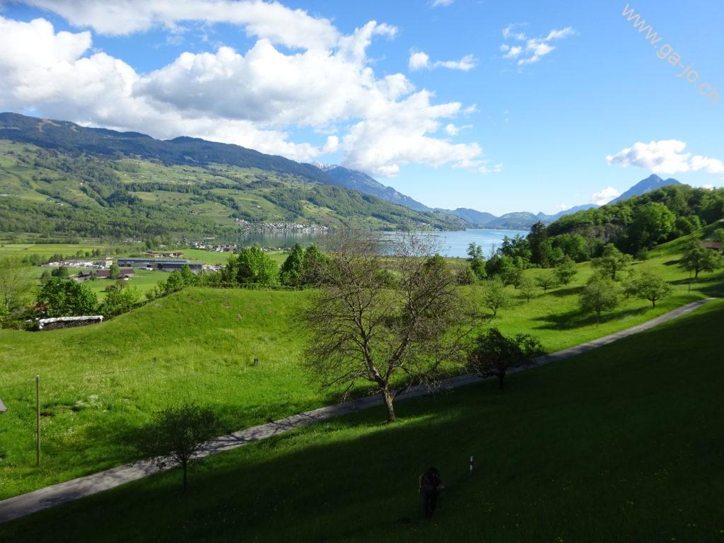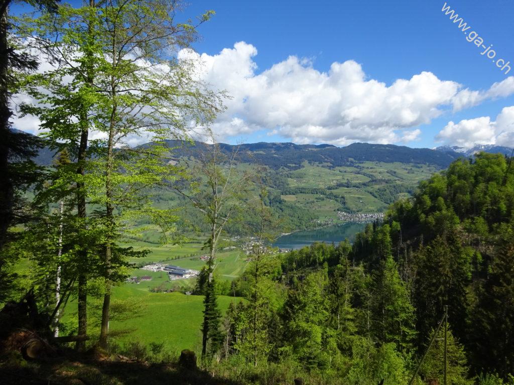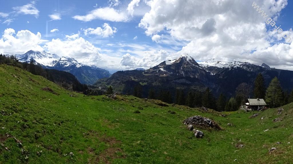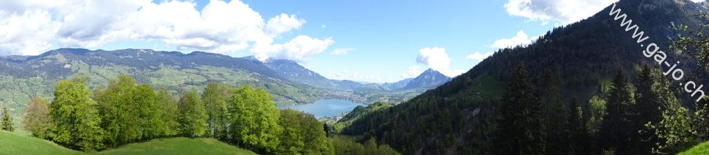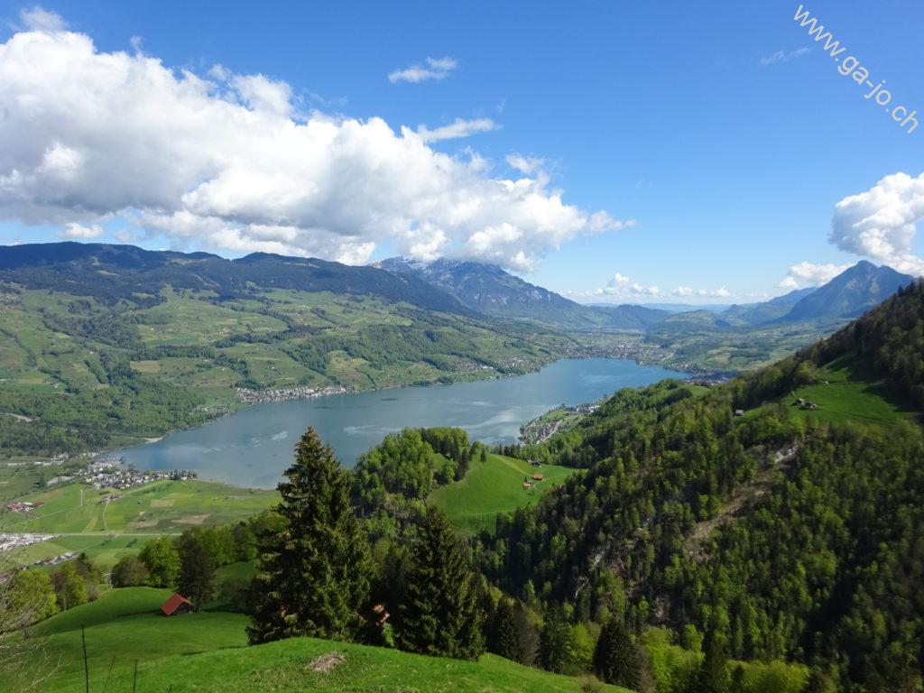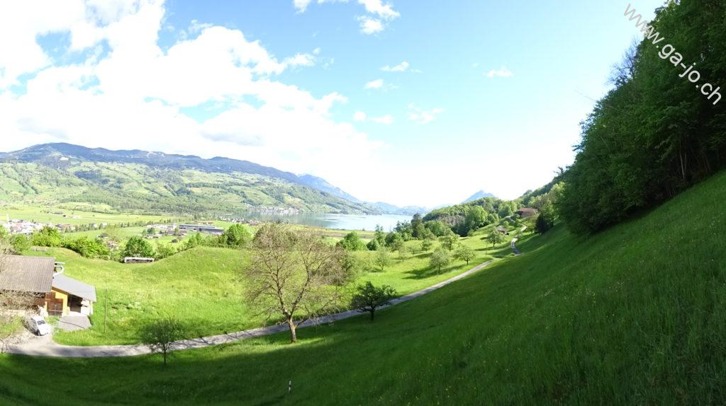 Au fur et à mesure que nous montons, la vue derrière nous s’ouvre sur le lac de Sarnen d’abord, puis sur les lacs d’Alpnach et des Quatre-Cantons. Le mont Pilatus a la tête dans les nuages mais le Stanserhorn en face à l’est, veille bien sur nous. On arrive finalement au pâturage de Bärfallen, la montée assez raide continue pour finalement arriver à Brunnenmad et au pt. 1342 sur la carte où il y a une croix.