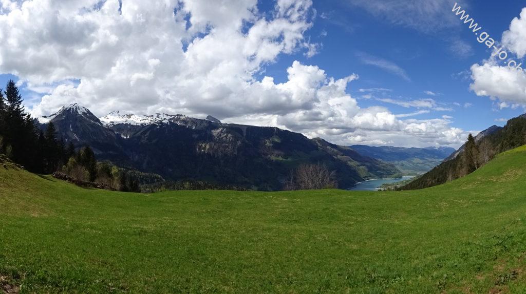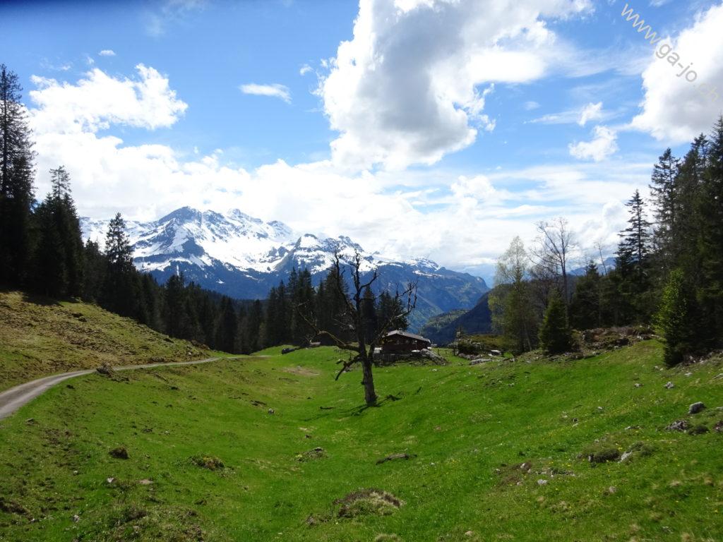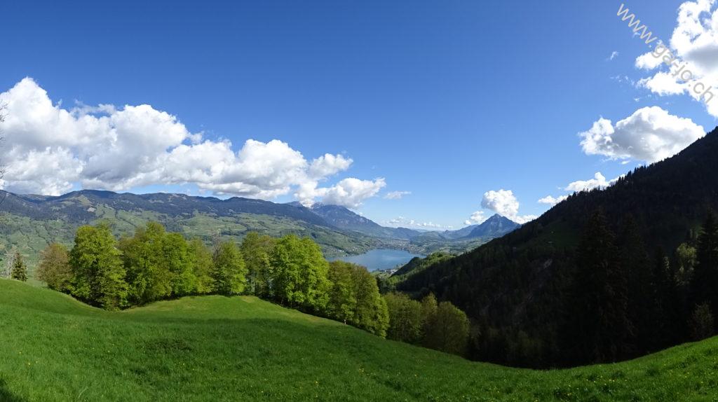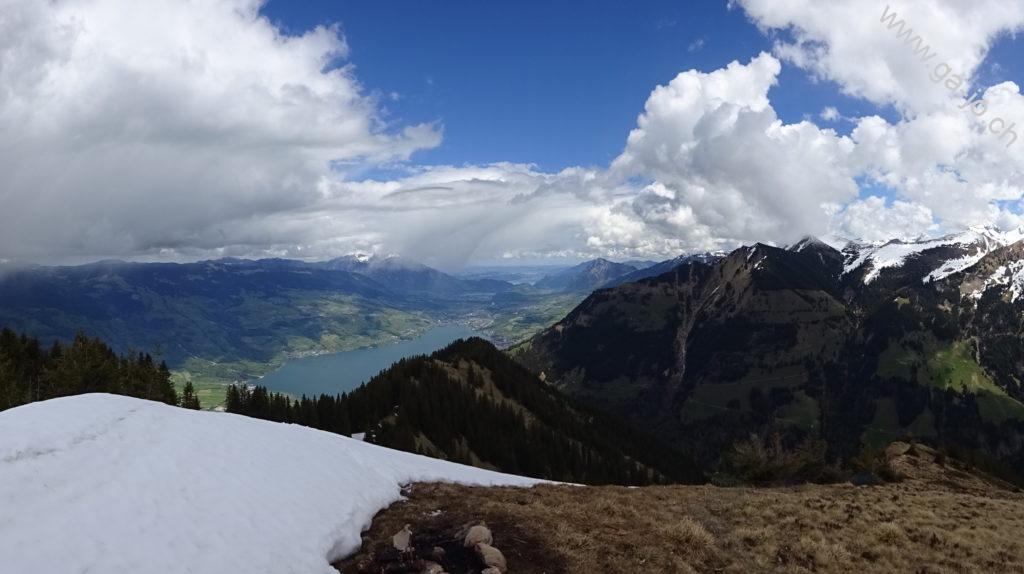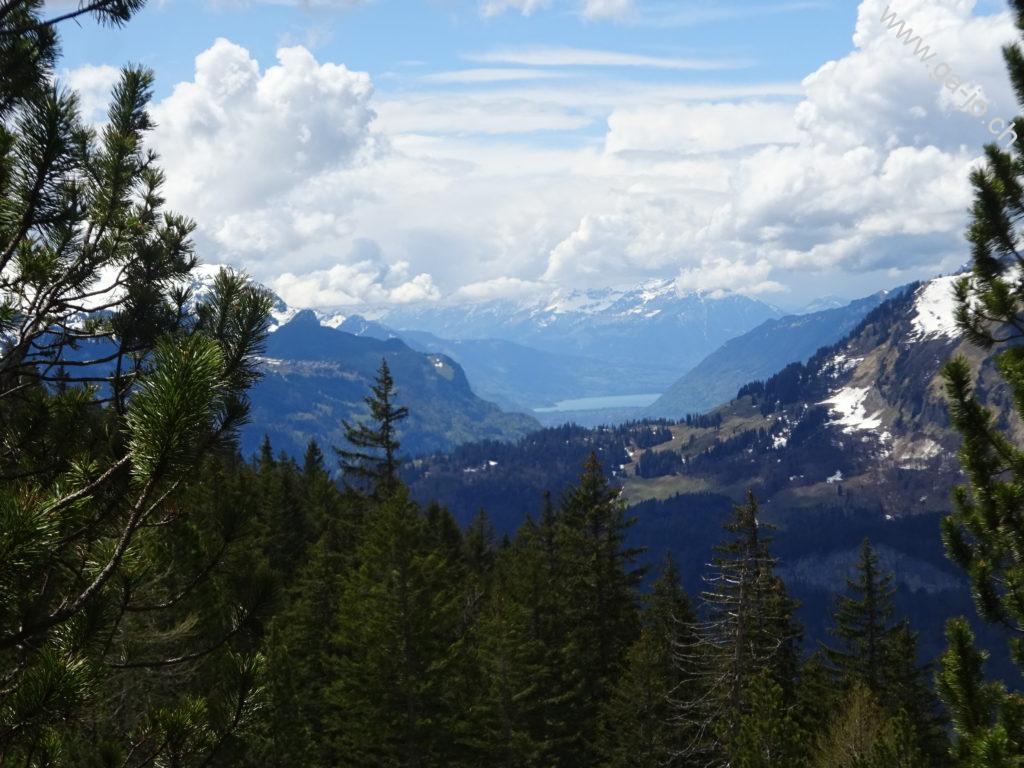 La descente est raide mais confortable sur un chemin bien marqué et bien entretenu. On rejoint un chemin forestier jusqu’à Hütstett sur lequel encore quelque névés et éboulis sont présents, rien d’inquiétant mais on reste tout de même prudents. Ensuite, la descente continue gentiment entre pâturages, forêts et routes d’alpage jusqu’au col du Brünig pour prendre un train en direction de Meiringen. Derrière nous, on a encore une échappée sur le lac de Lungern et devant, au loin, le lac de Thoune pointe aussi le bout de son nez !
