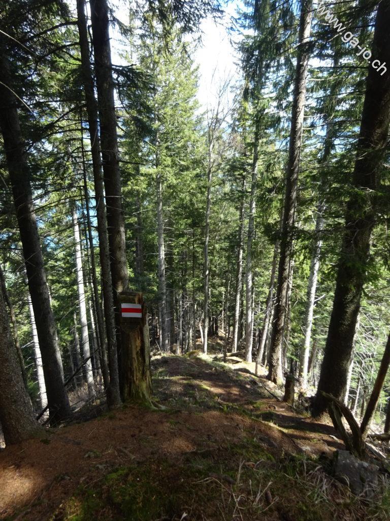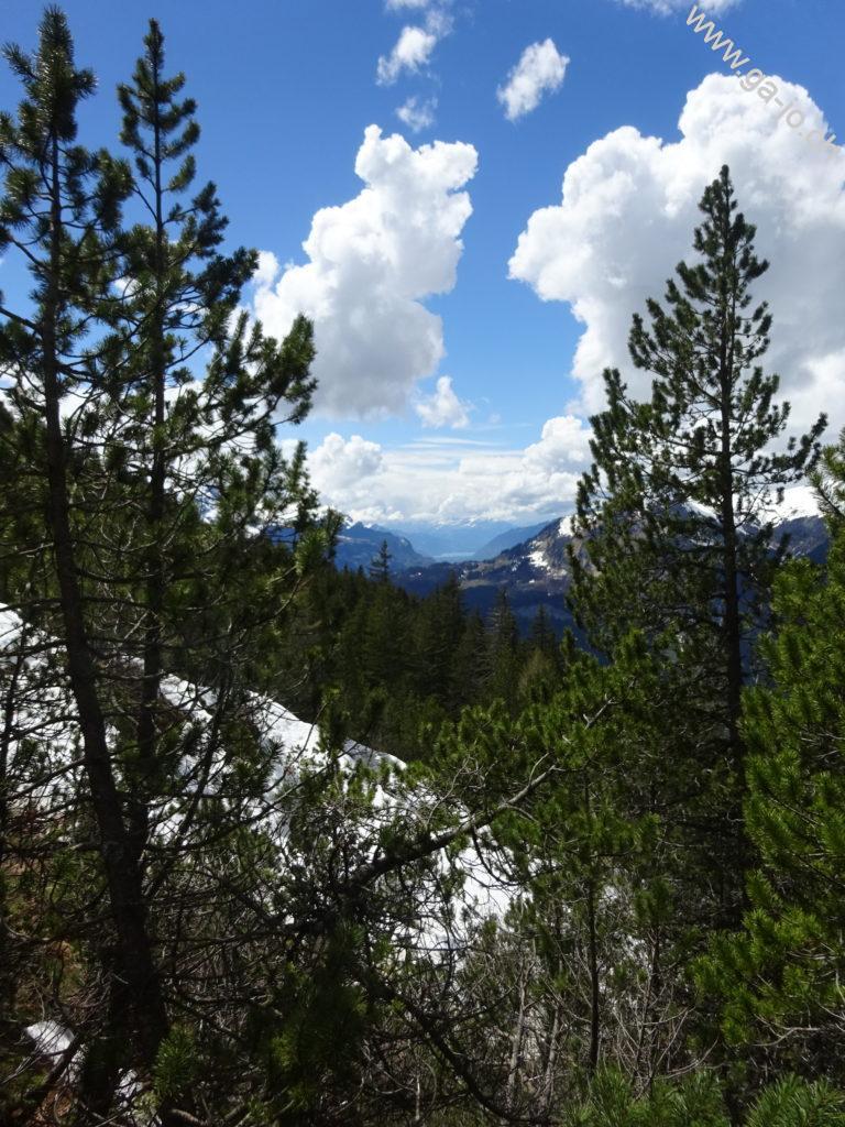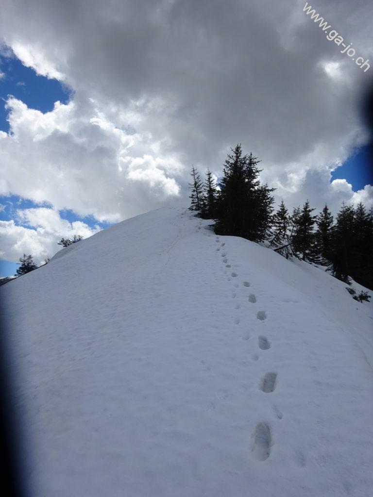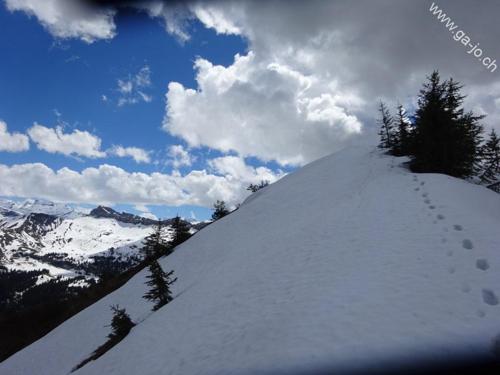 Ensuite, la montée toujours assez éprouvante, se fait par l’arrête dans la forêt jusqu’au Bärentritt (passage des ours) où il faut un peu sortir les mains des poches pour continuer d’avancer. La vue derrière nous reste toujours magnifique mais le chemin demande un peu d’attention ; soit on marche et on regarde où on met les pieds, soit on s’arrête et on regarde la vue. Le second passage un peu exposé est l’ascension du Lecki Dossen, le chemin n’est pas forcément facile à suivre même si le balisage est bien présent. Quelques névés commencent à apparaître par-ci, par-là, la neige est molle donc pas trop d’inquiétude pour l’instant. On continue sur l’arrête avant d’arriver au dernier mini-sommet sur le chemin, l’Arvidossen : là, le sentier est très exposé et un câble est présent pour nous aider à monter. Dans la forêt la sensation de vide est bien atténuée mais la falaise est bien là, juste derrière.