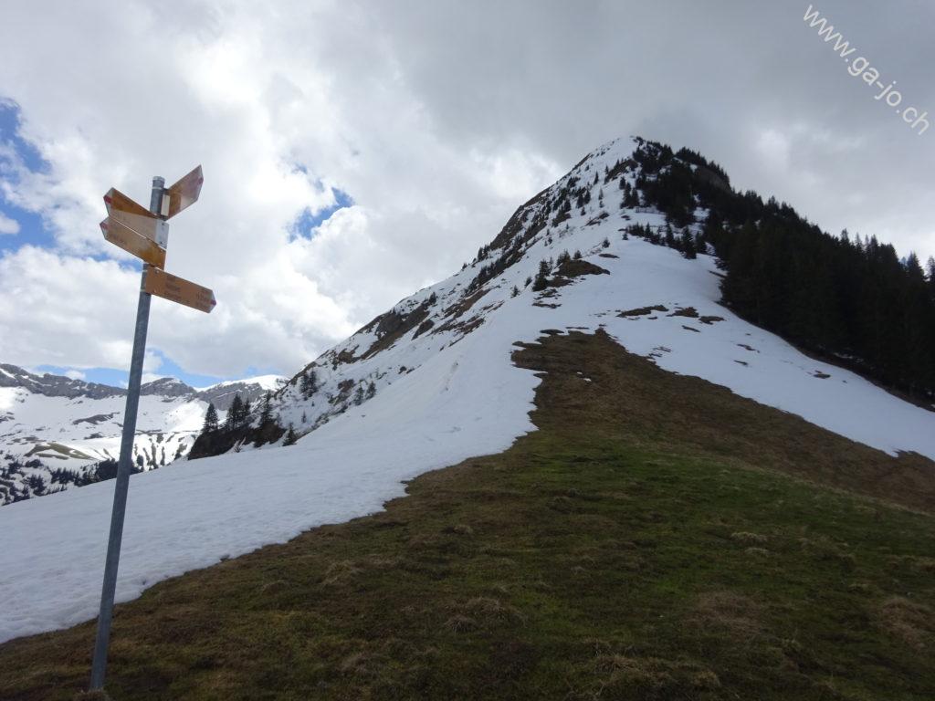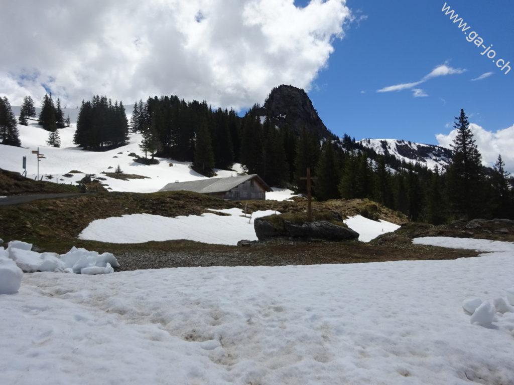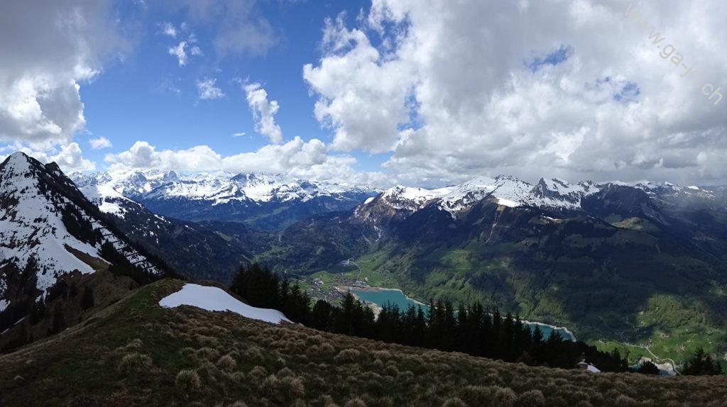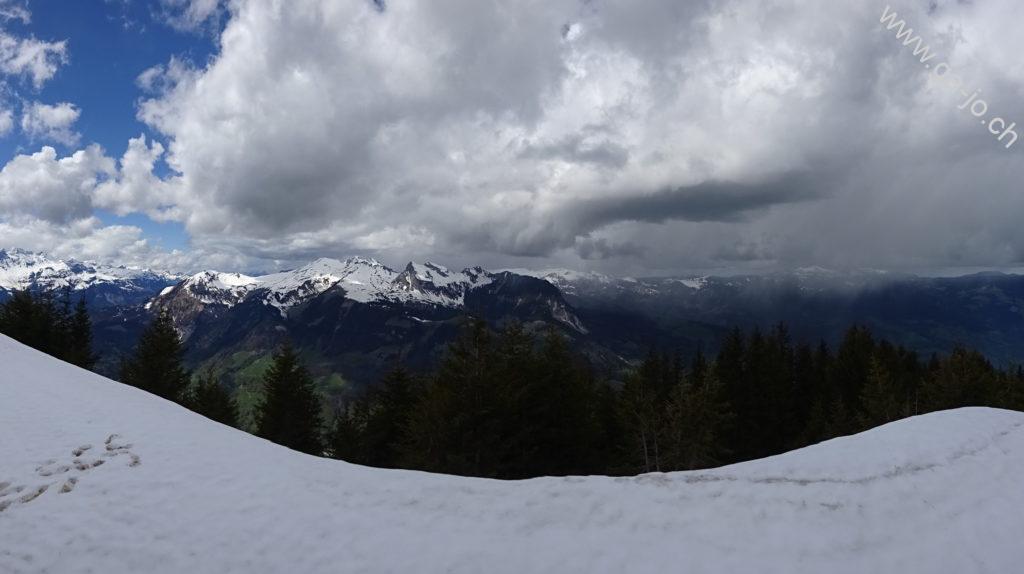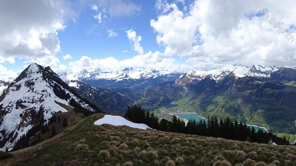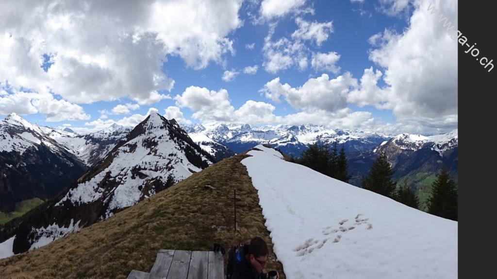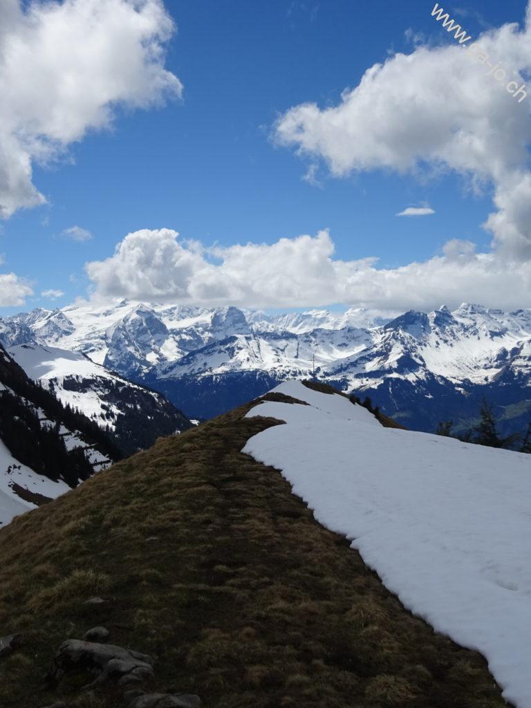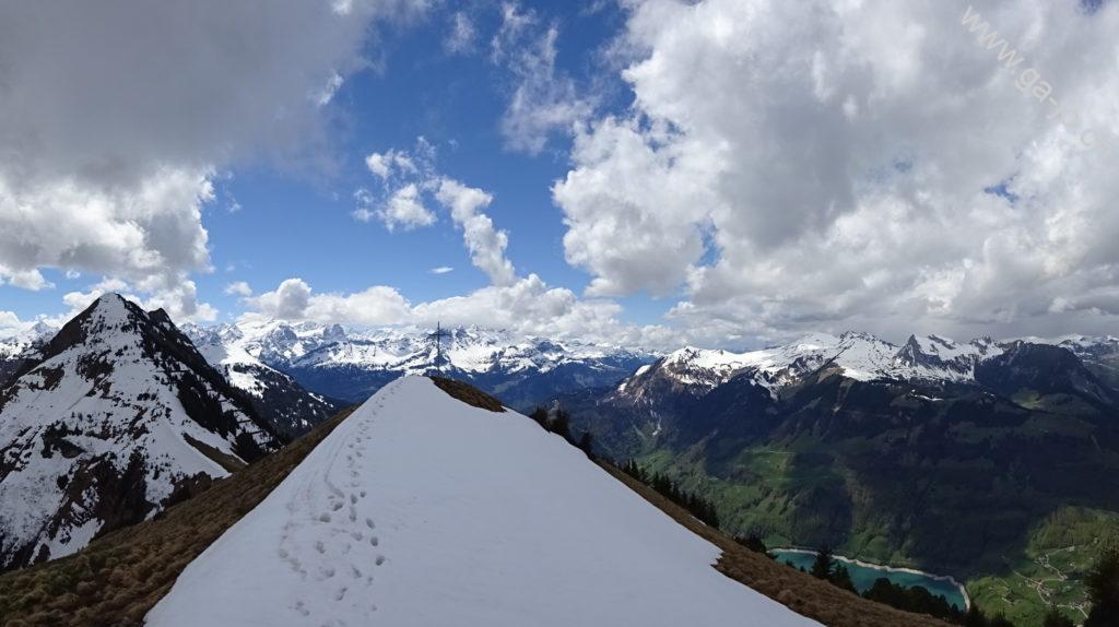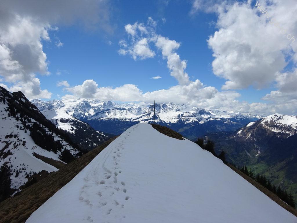 Un peu plus loin en longeant l’arrête, le “vrai” sommet du Höh Grat avec sa croix nous offre une vue plongeante sur la lac de Lungern, ainsi qu’un panorama magnifique sur les préalpes lucernoise, les alpes bernoises et Ob-Nid-waldienne y compris le Titlis. La météo annoncée n’était pas forcément encourageante, on se rend compte que les nuages menaçants guignent un peu partout aux alentours, sauf sur nous. On continue direction sud, toujours sur l’arrête vers le petit col (pt. 1811). Là, les conditions (neige et météo) nous poussent à ne pas tenter le Güpfi et redescendre par le pâturage de Egg, en direction du Brünig.