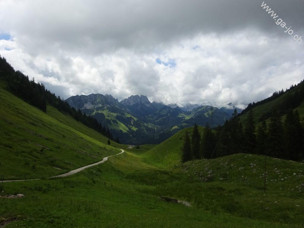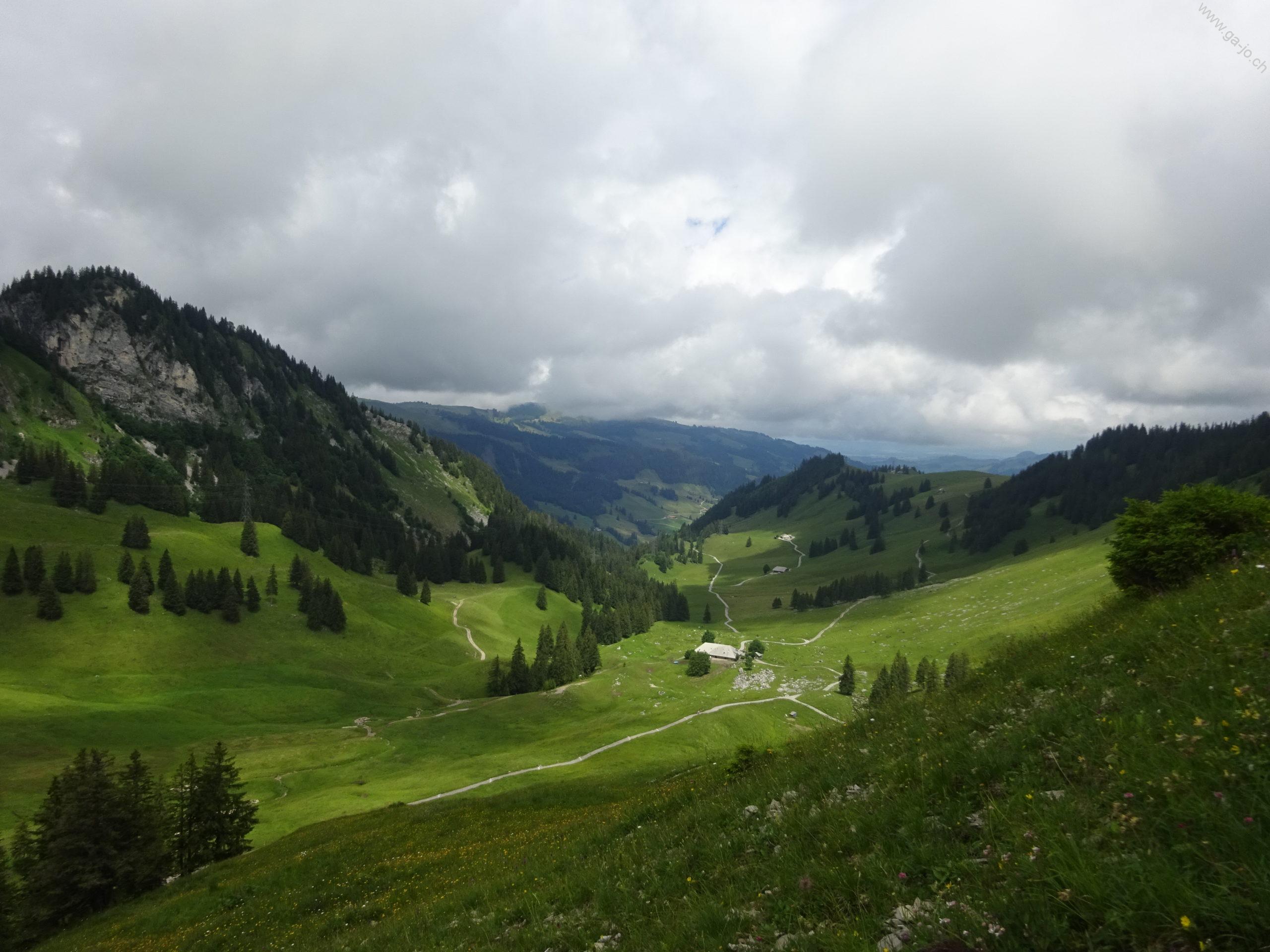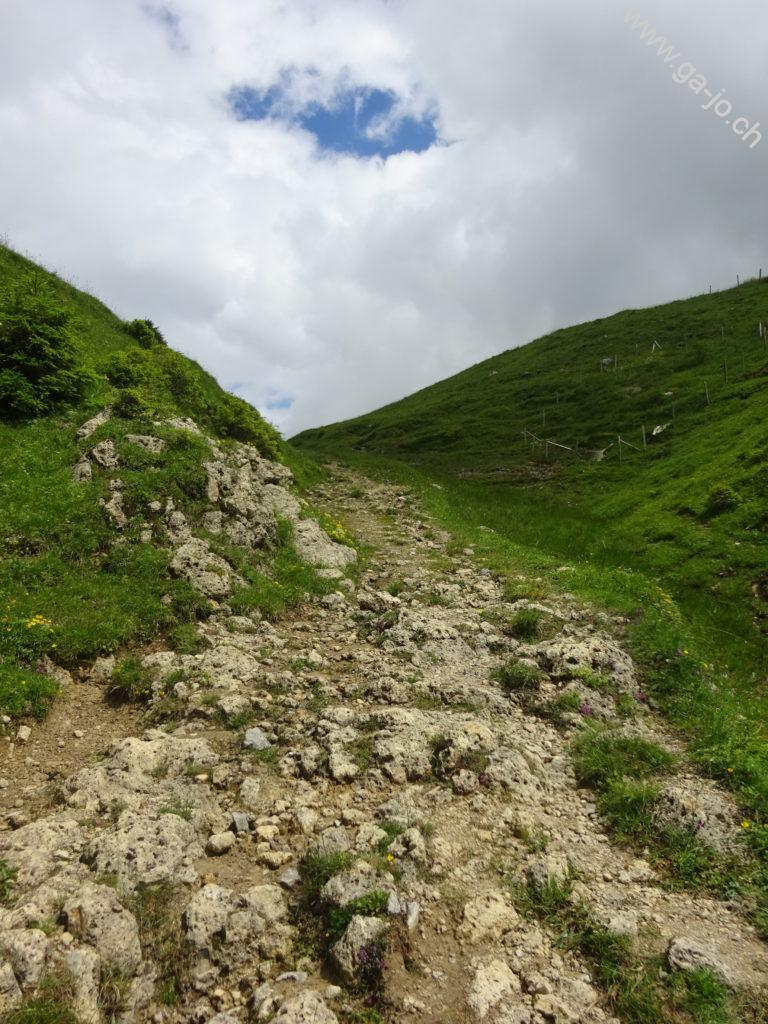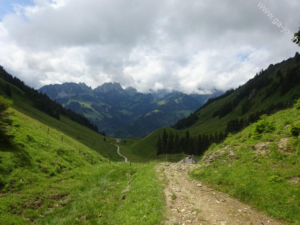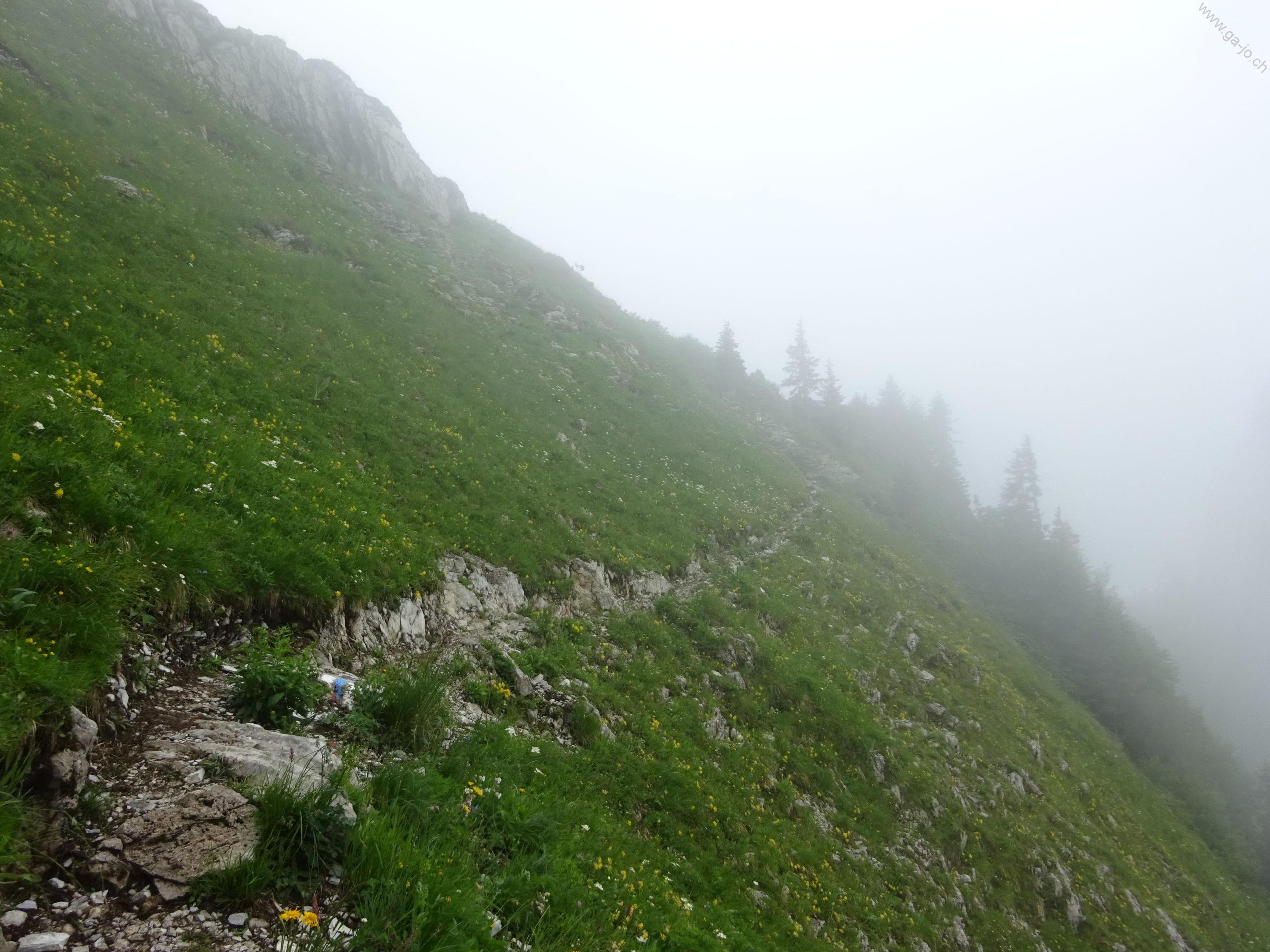 Au départ de Jaun nous sommes encore sous le soleil. Les pluies des derniers jours ont laissé quelques traces sur le sentier parfois bien boueux. On se dirige donc au N sur le chemin montant à Euschels, sans grande difficulté.