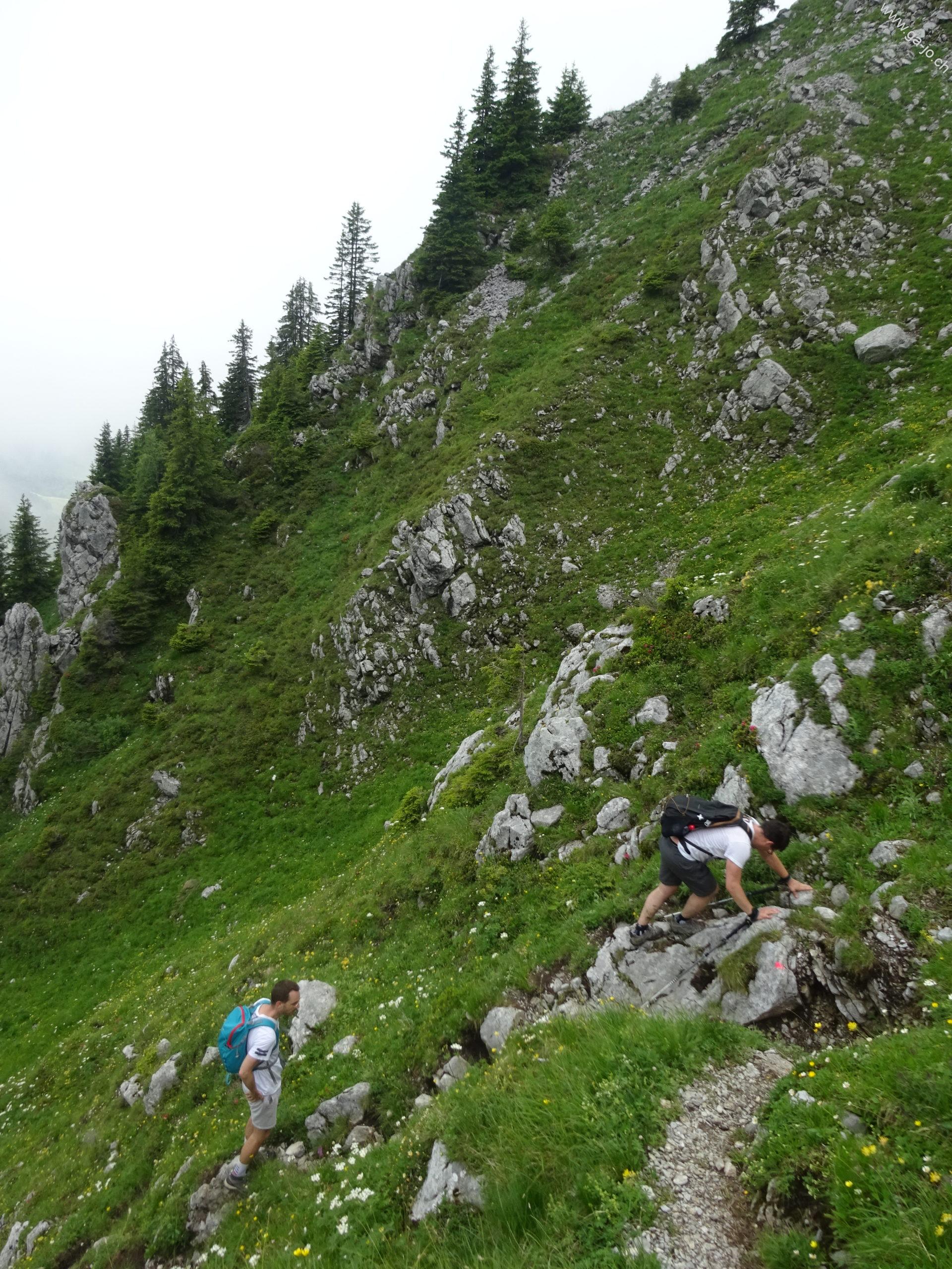Arrivés à la cabane d’Obere Euschels on bifurque en direction NE sur le chemin balisé blanc-bleu. Tout d’abord par une traversée ascendante sur près de 500m. Arrivez sous la barre rocheuse, la pente s’accentue est il faut sortir les mains des poches presque jusqu’à Golmly.