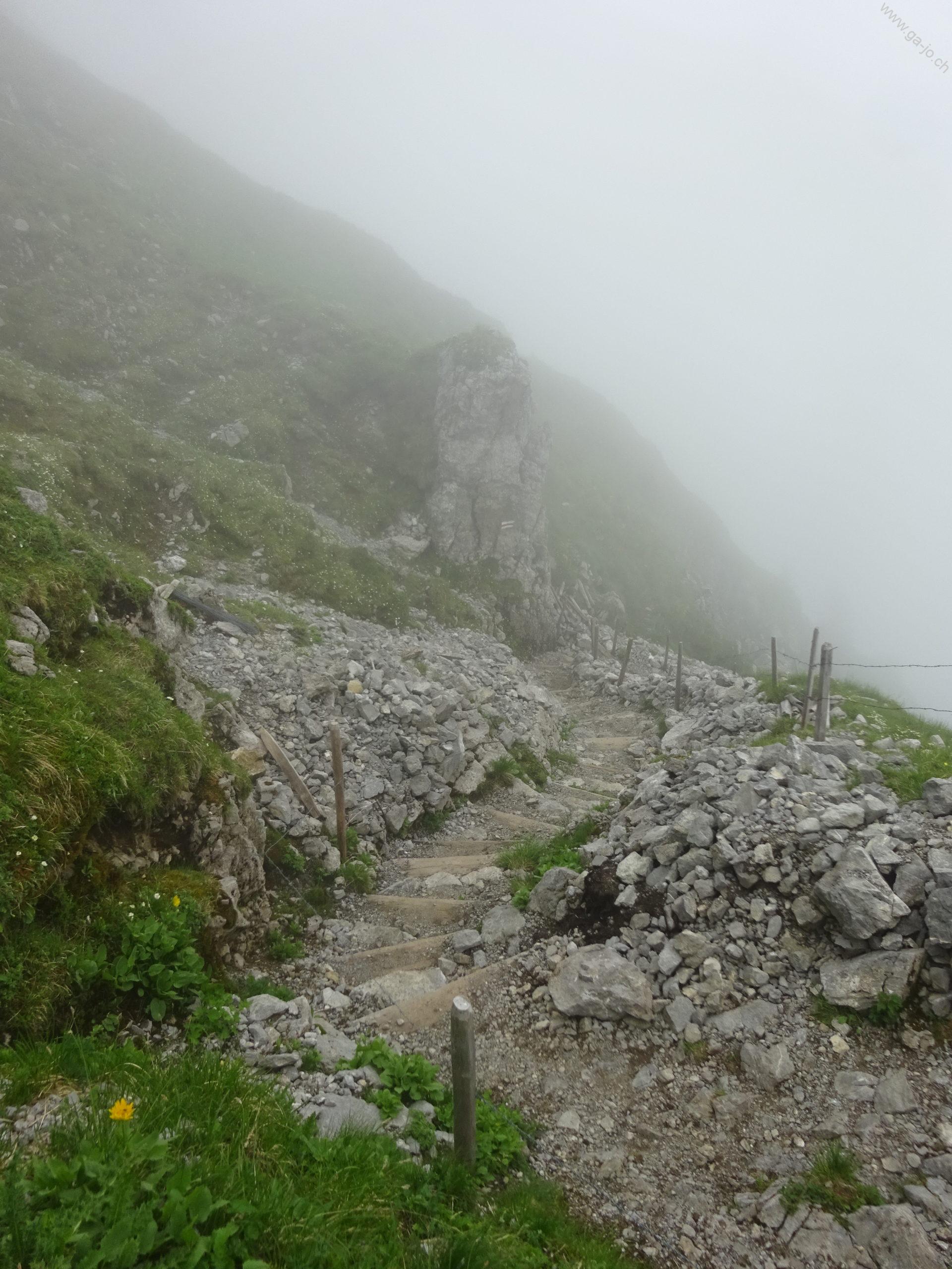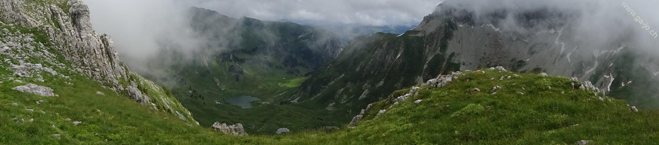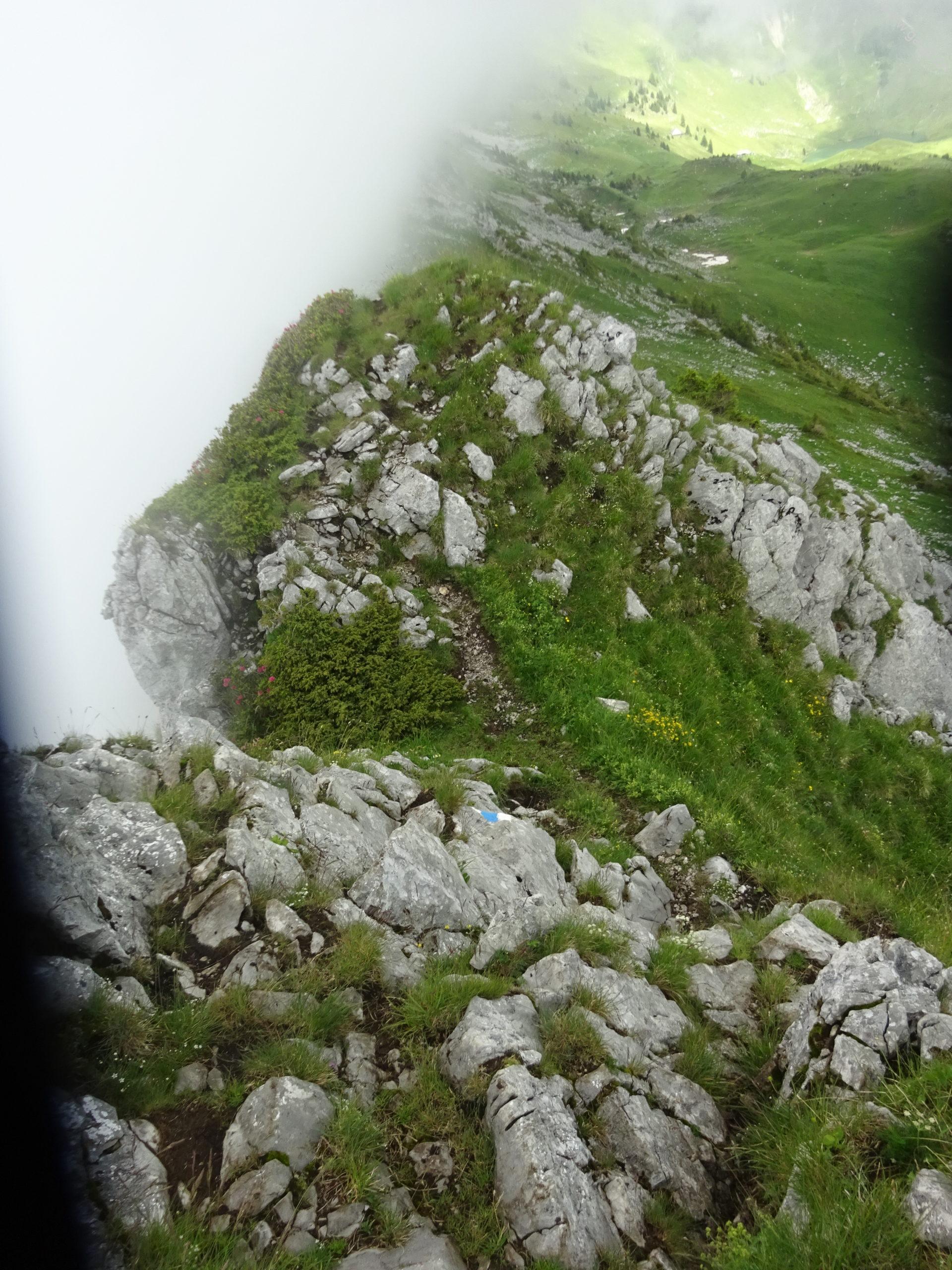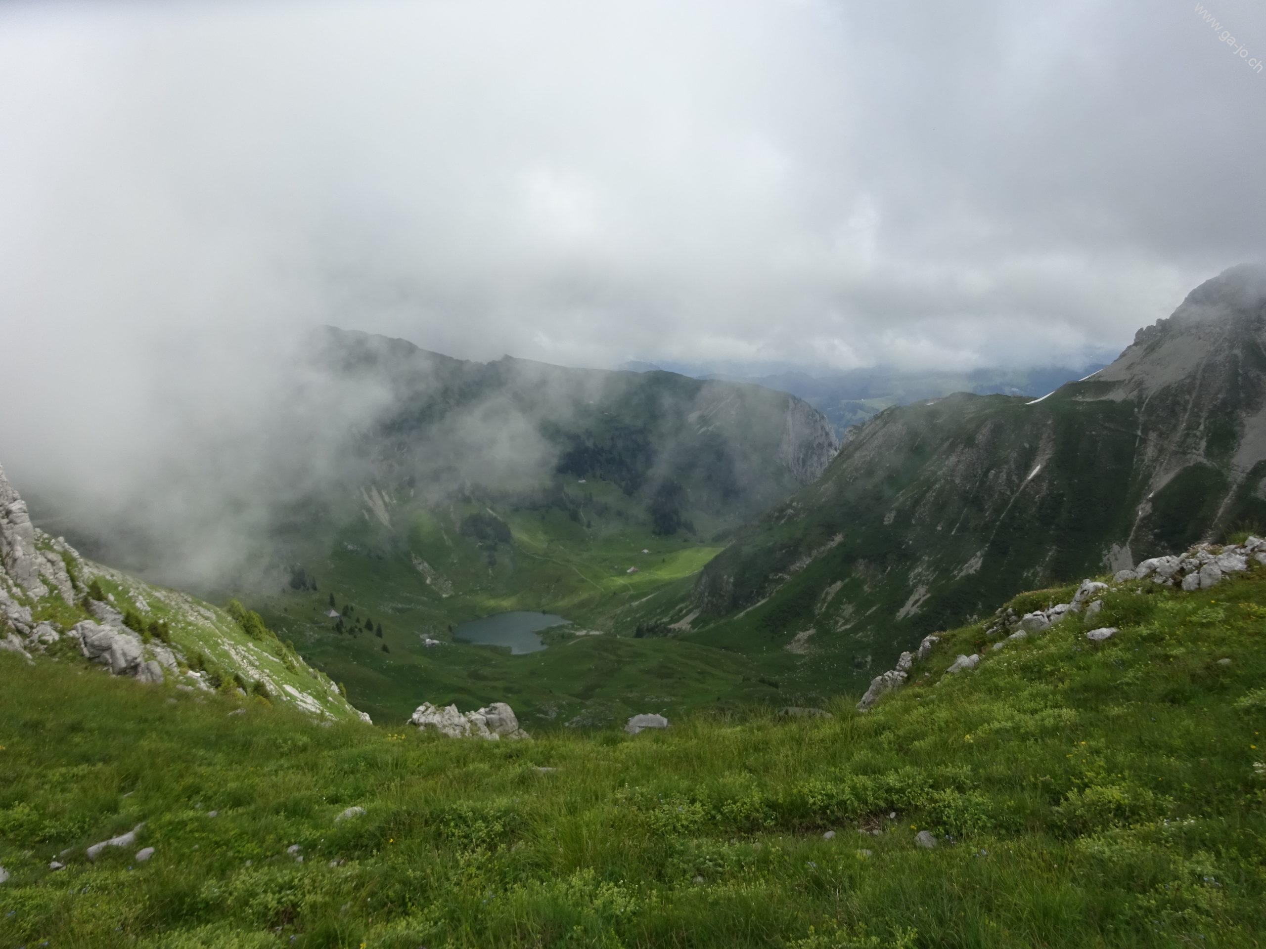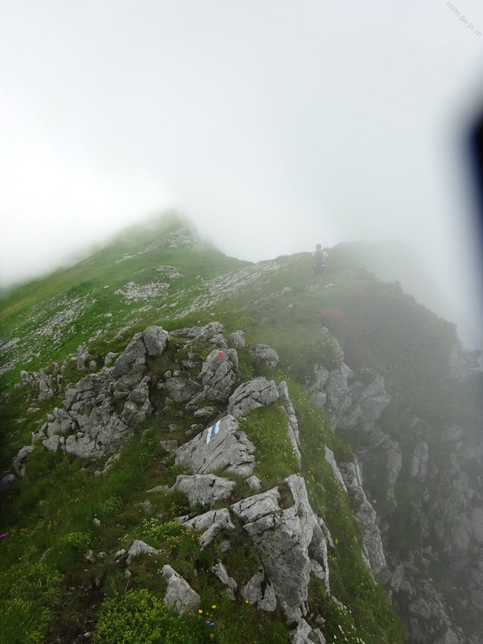 On arriveà Golmly la tête dans les nuages. Nous continuons sur la crête sans la vue spectaculaire prévue. A tel point que nous renonçons à rejoindre le sommet du Kaiseregg (ce sera pour une autre fois) et redescendons en direction de Schwarzsee où nous retrouvons le soleil.