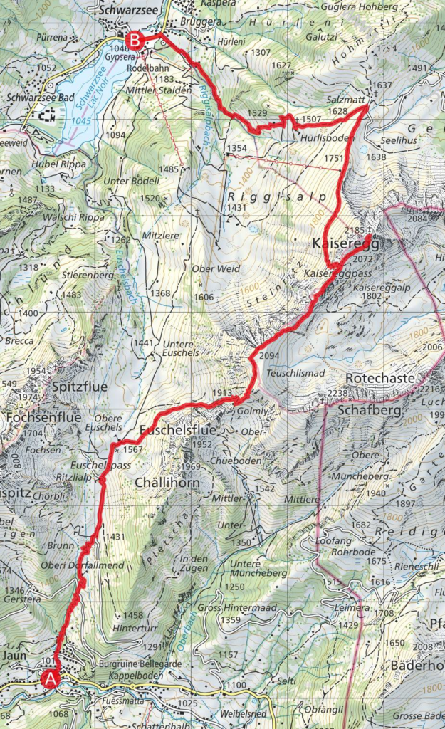La début de la montée depuis Jaun est plutôt simple mais se complique dès la bifurcation de Euschelspass vers le Golmly où le chemin devient balisé blanc-bleu-blanc, coté T4. Ce passage n’est pas spécialement exposé (excepté la dernière vire) mais grimpe assez fort et il faut clairement l’aide des mains pour une grande partie de la montée. La suite entre Golmly et le Kaisereggpass sur les crêtes n’est, quant à lui, pas trop compliqué mais possède pas mal de passages exposé où l’absence de vertige est nécessaire. Dans tous les cas un pieds sûr et une certaine expérience de la randonnée alpine sont recommandées. La descente finale sur Schwarzsee, bien qu’assez raide par moments, ne présente pas de grande difficulté et est très populaire.