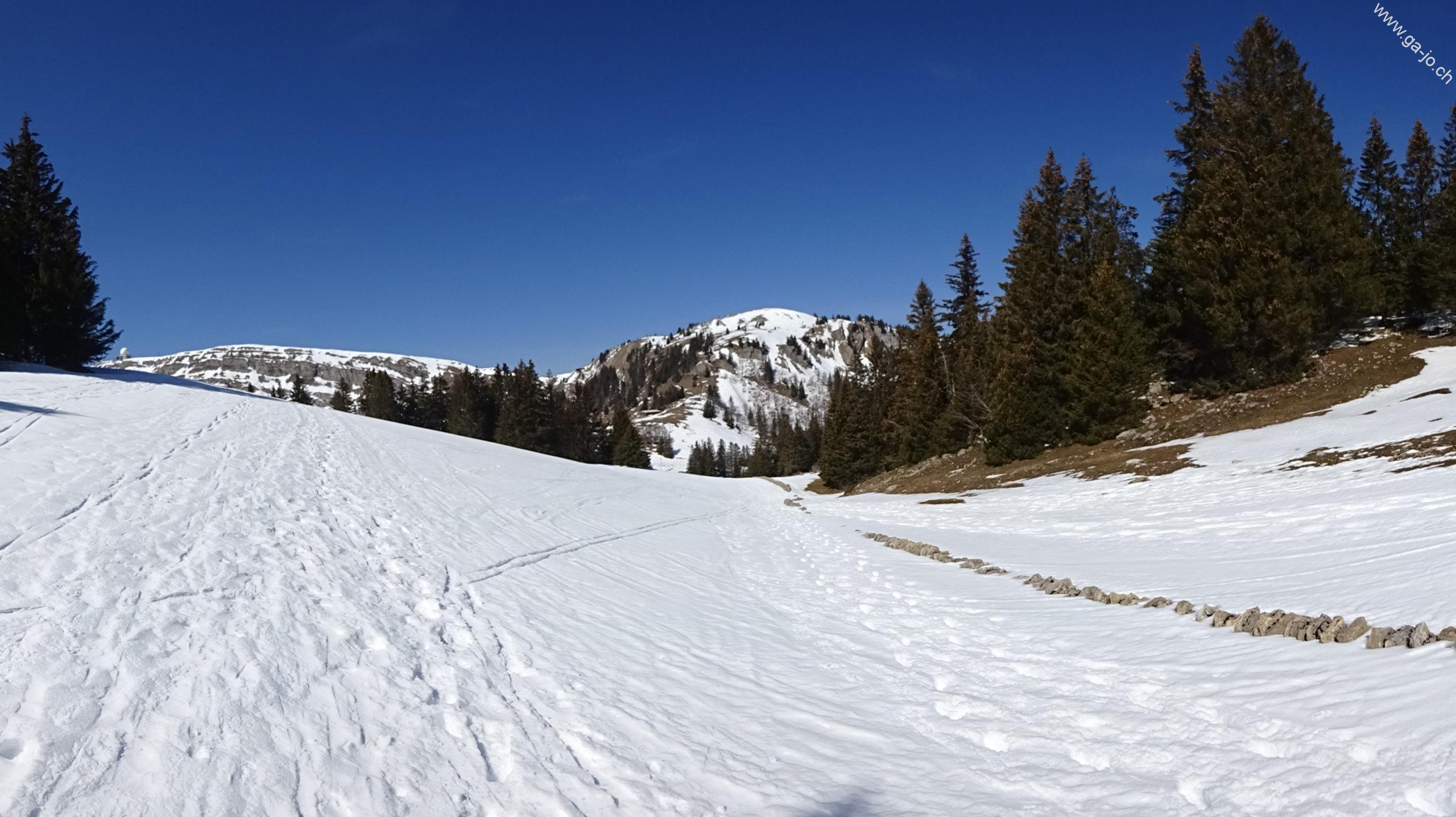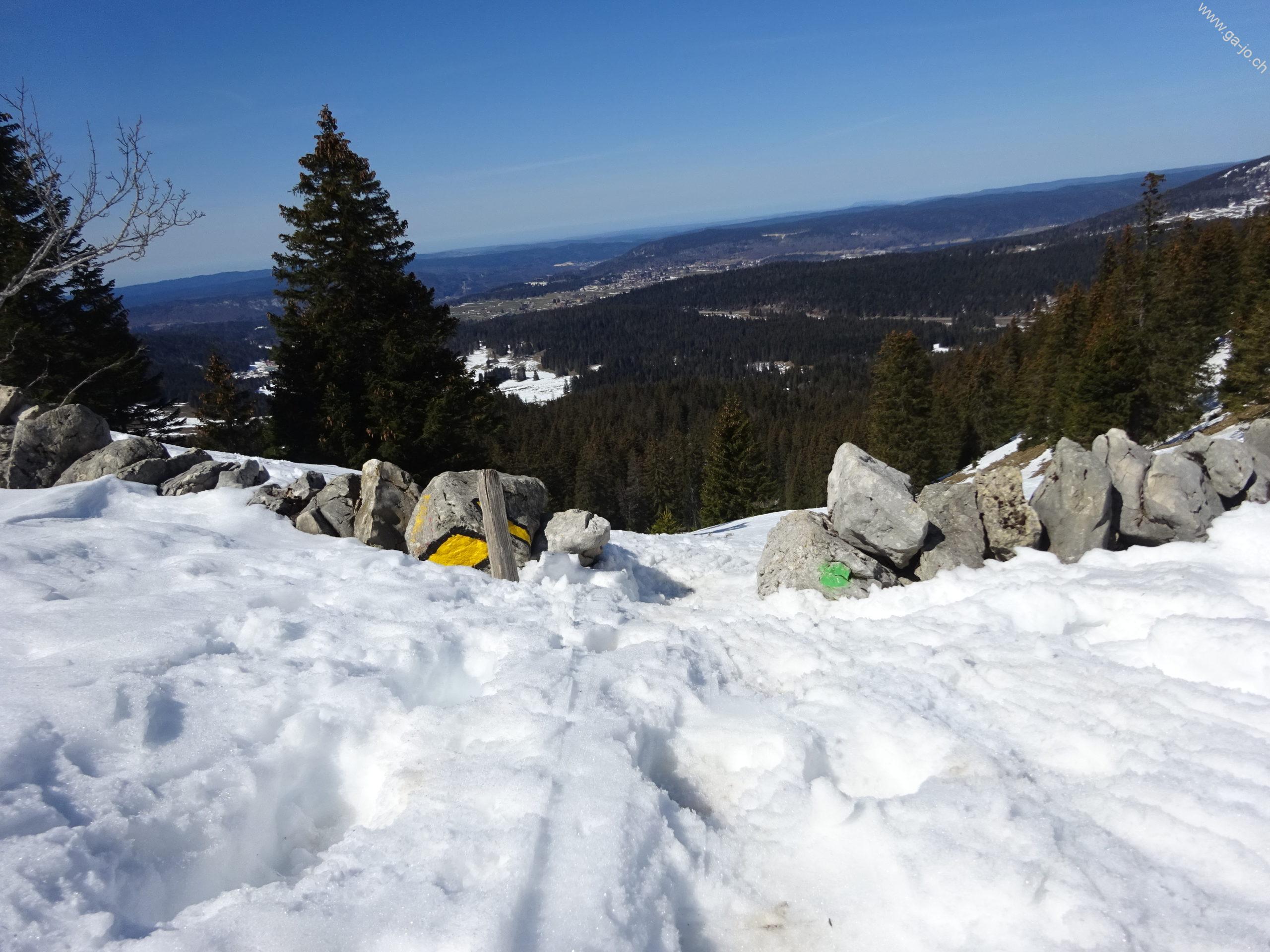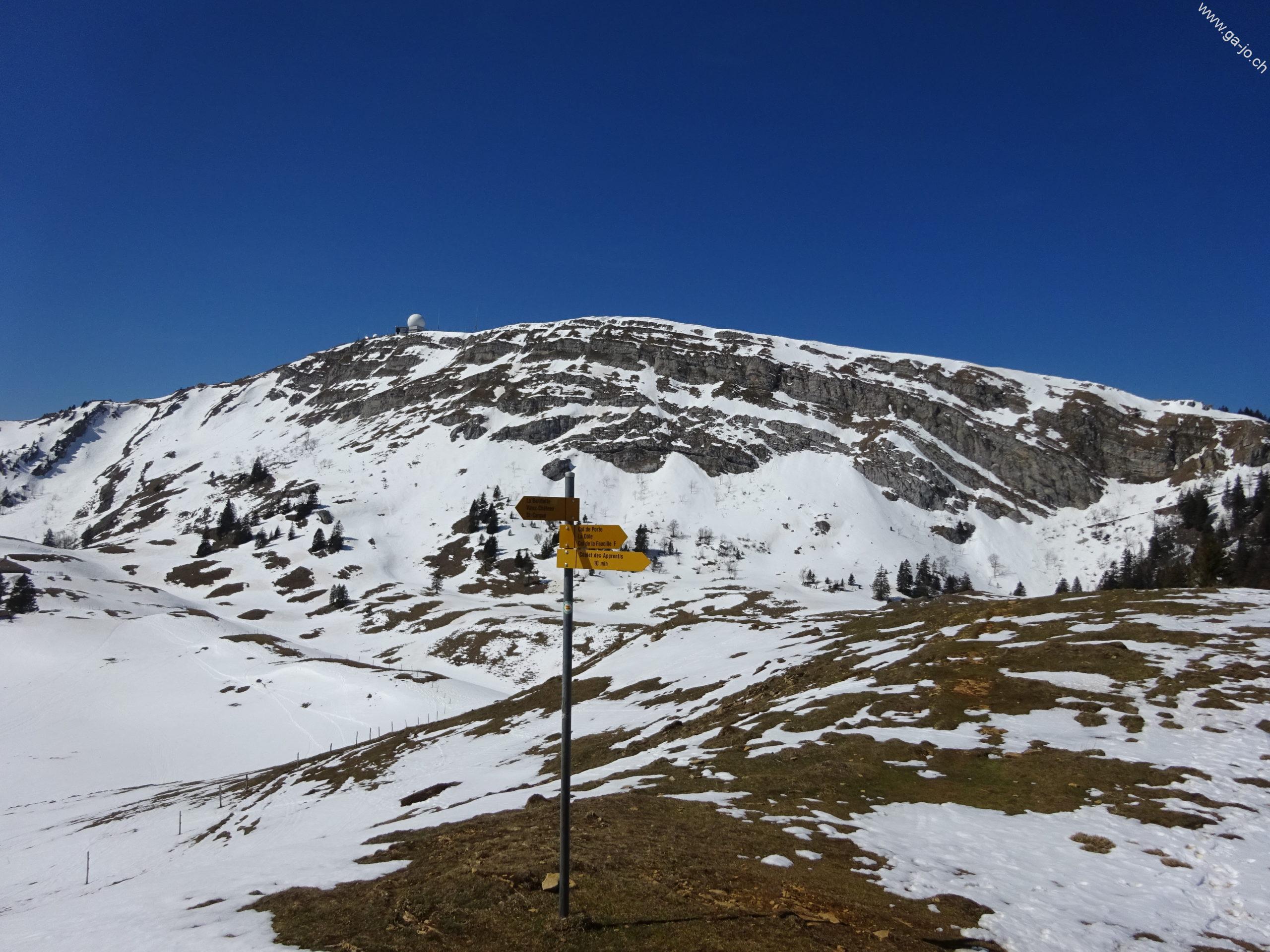 Du sommet le chemin redescend légèrement jusqu’à la bifurcation au point 1463. Là on tourne à gauche en direction du Chalet de la Dôle afin de faire la montée par le versant sud.