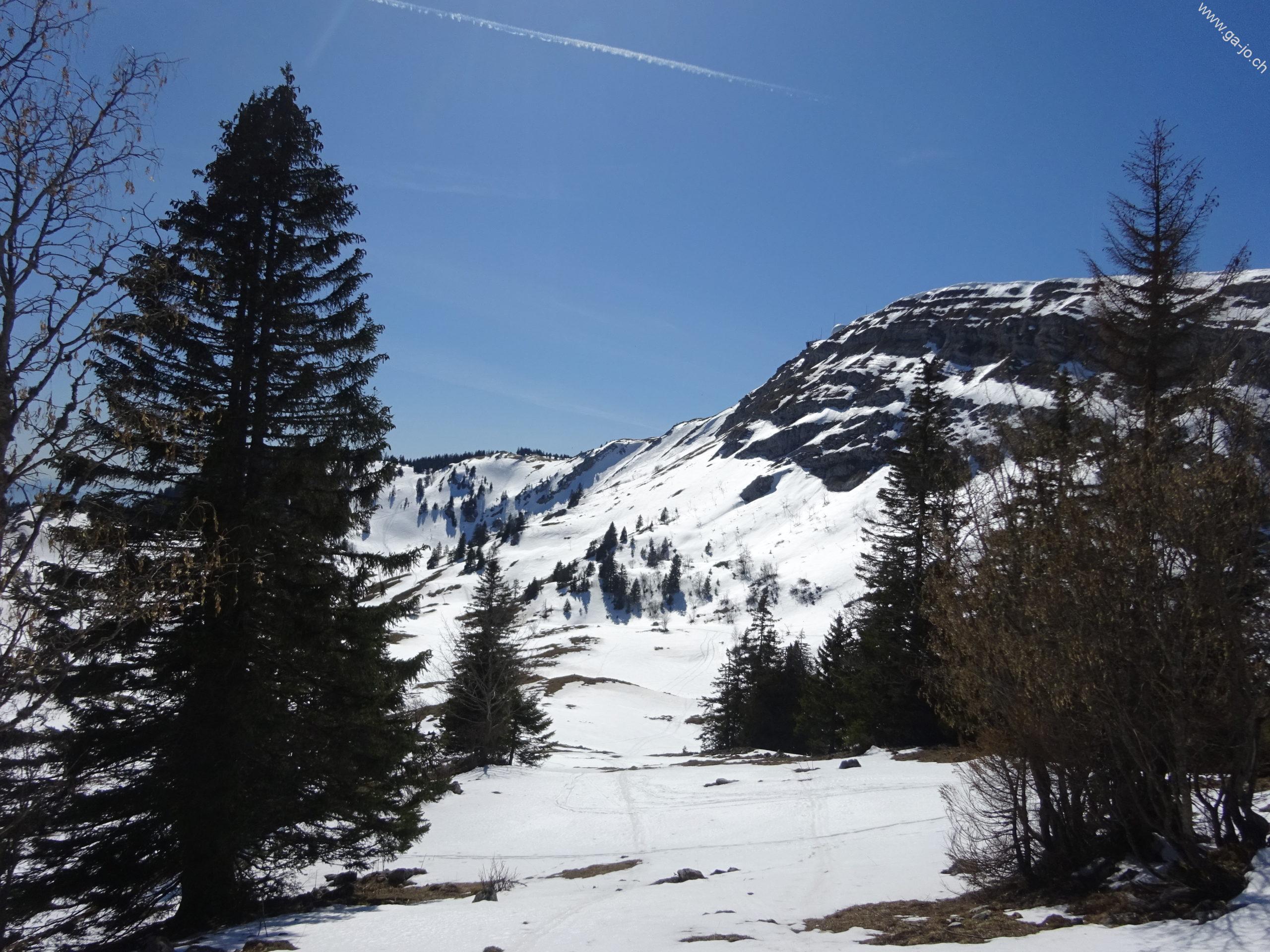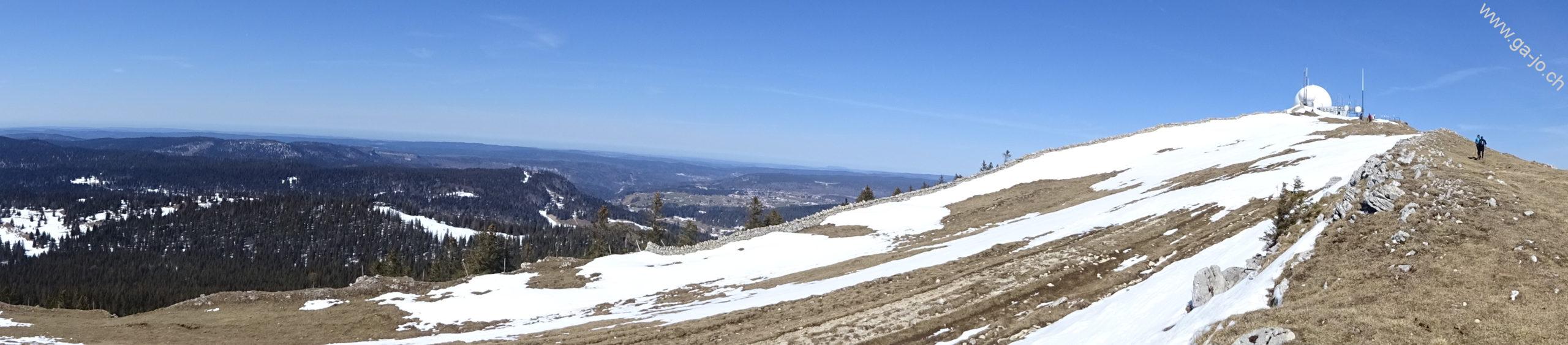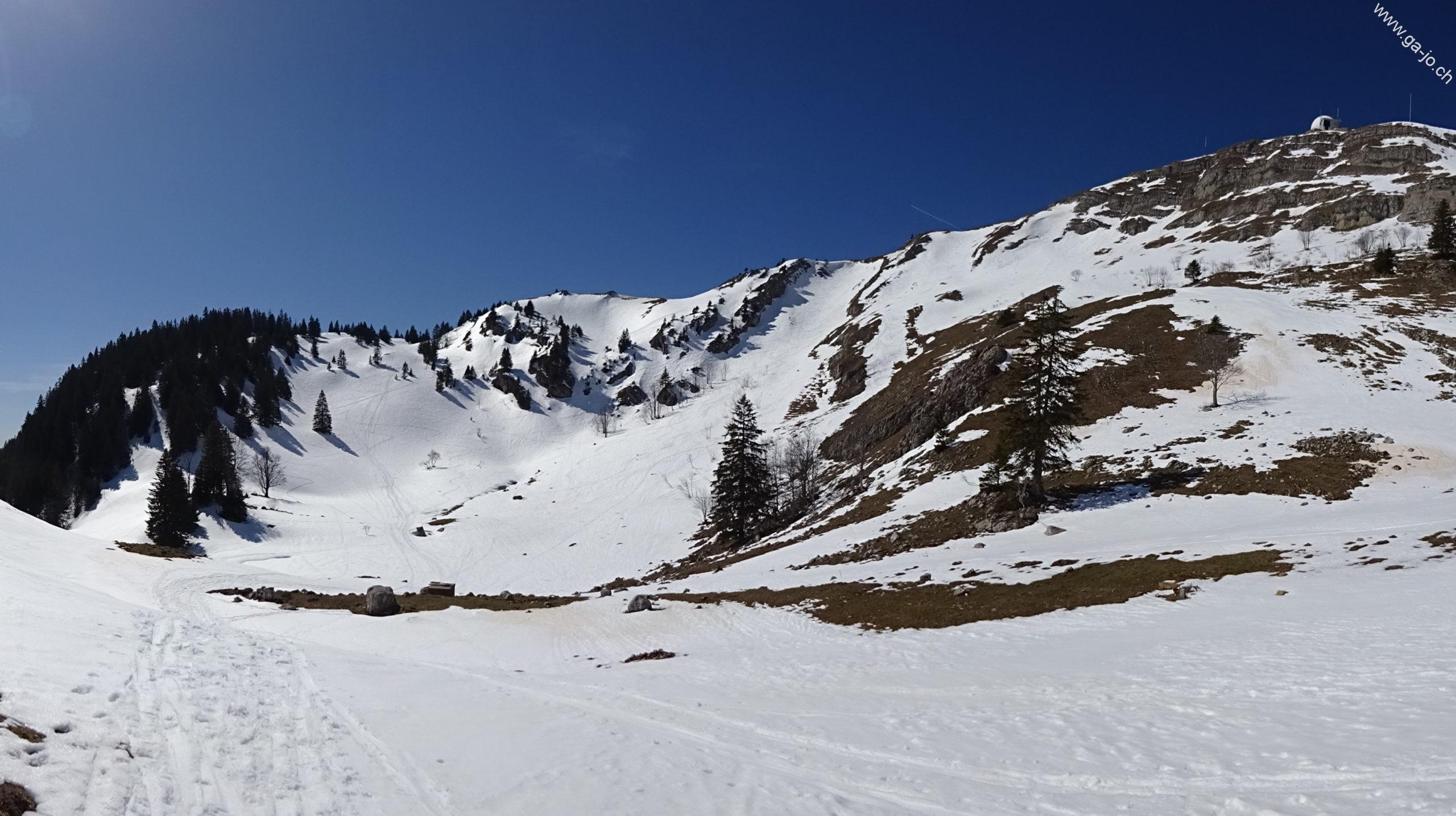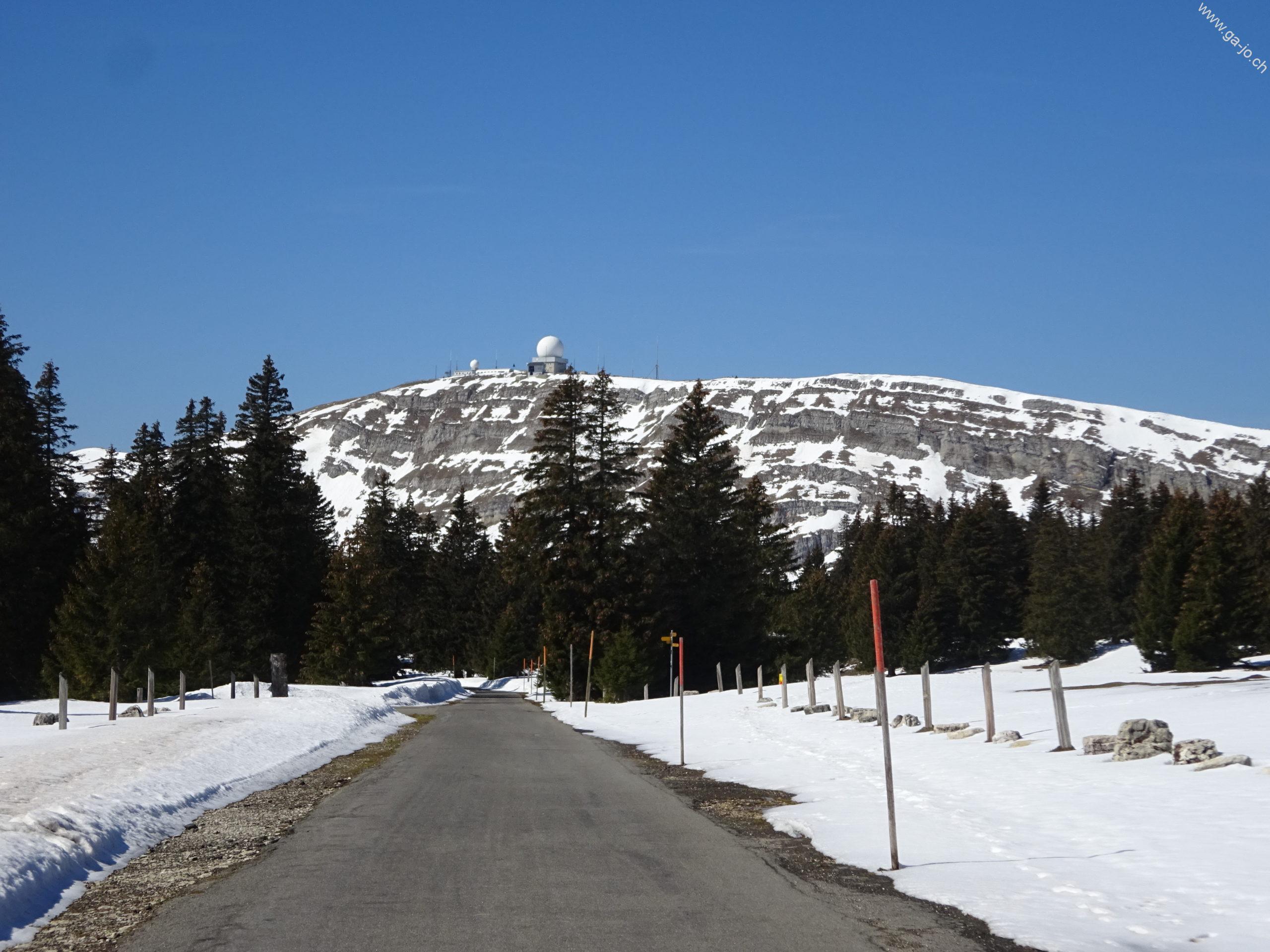 Du sommet le chemin redescend légèrement jusqu’à la bifurcation au point 1463. Là on tourne à gauche en direction du Chalet de la Dôle afin de faire la montée par le versant sud.