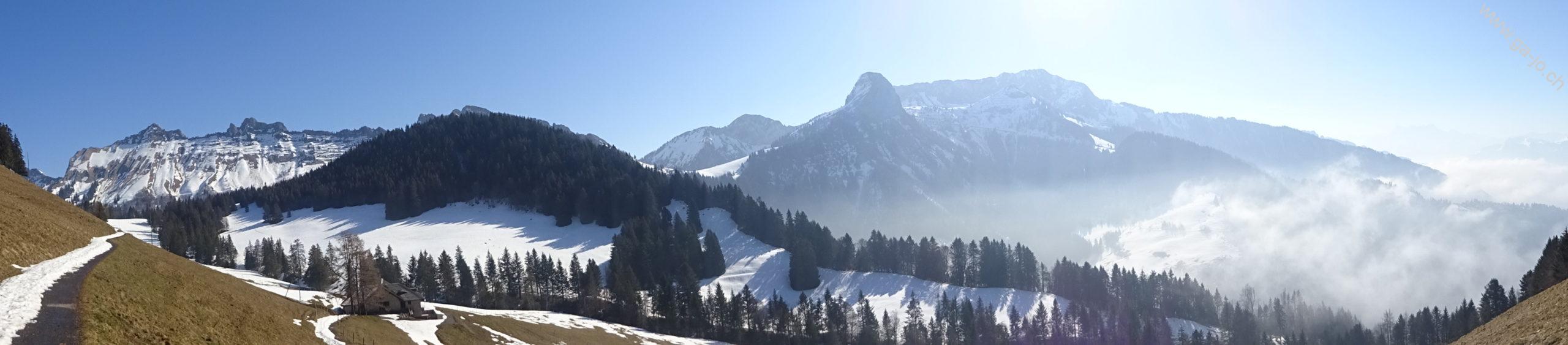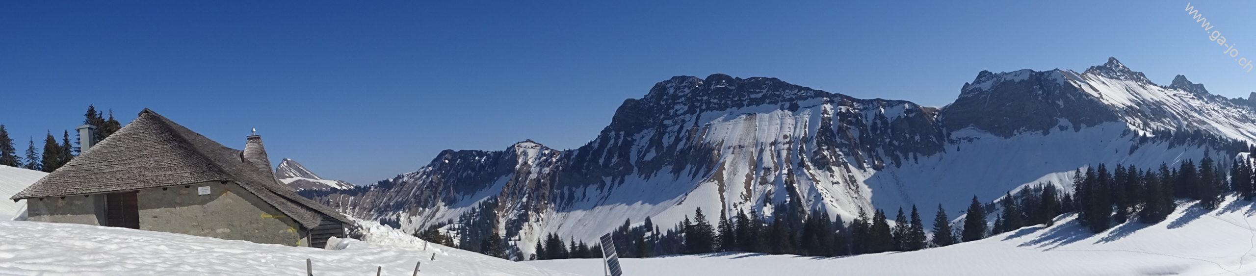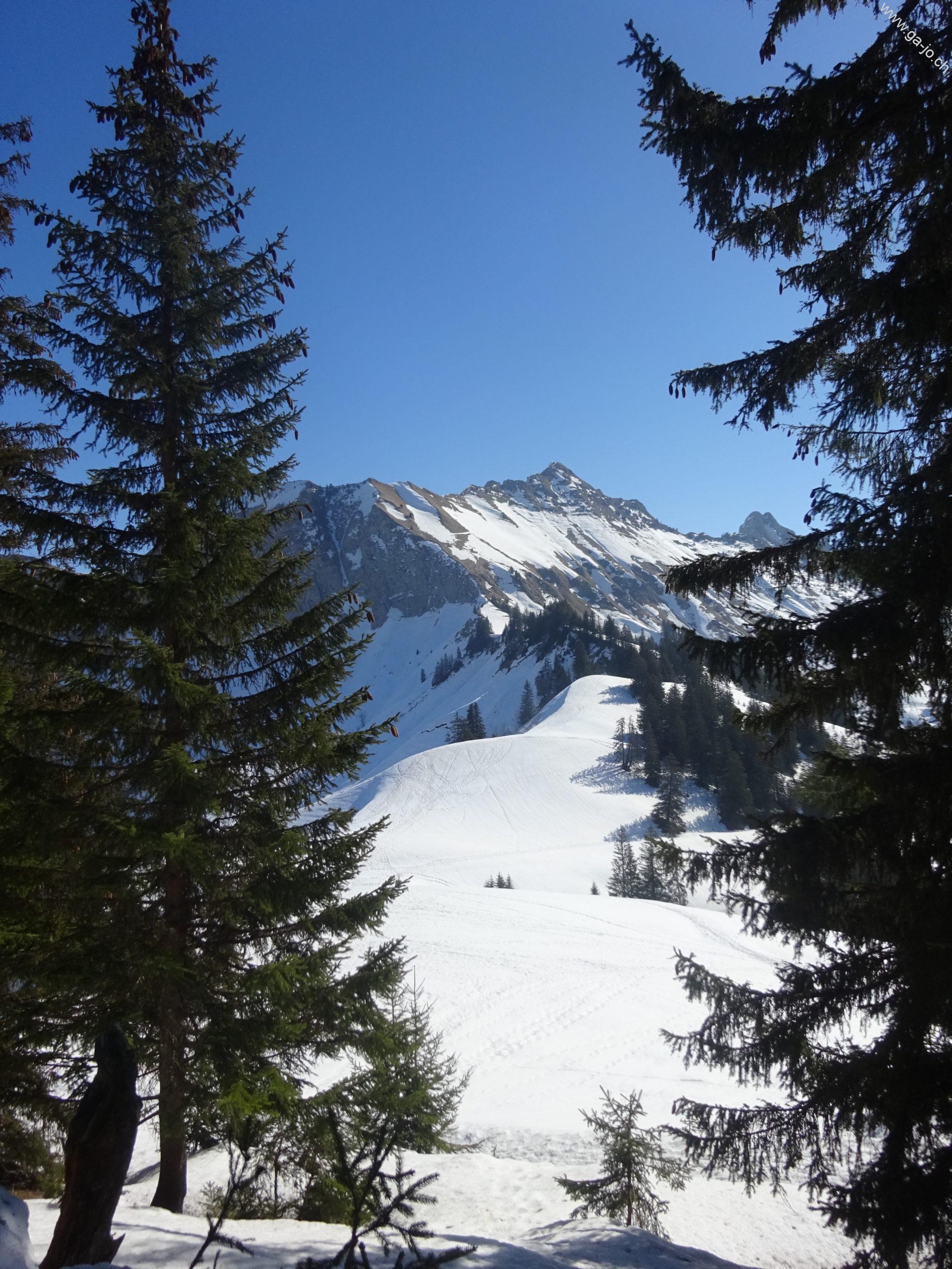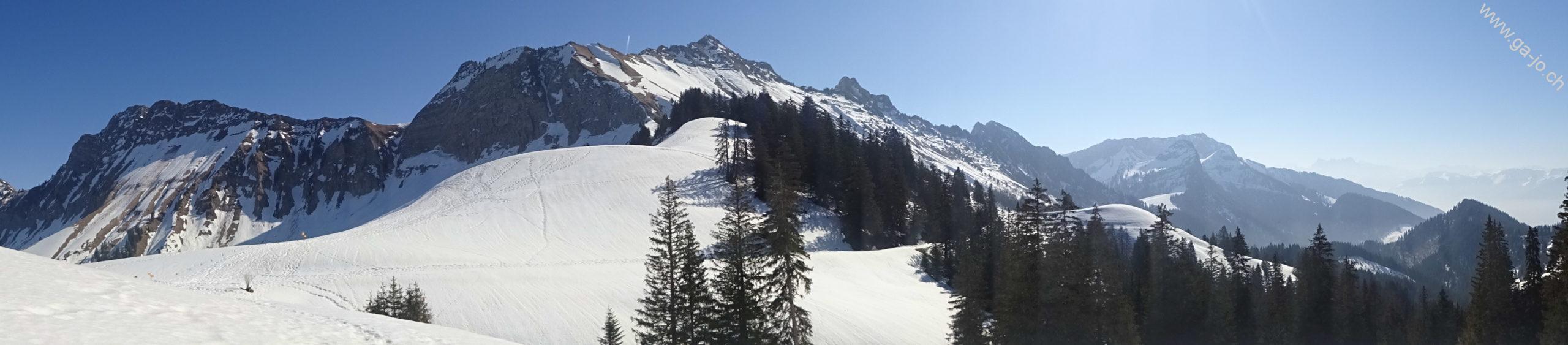Attention, le parcours raquettes ne suit pas toujours le chemin de randonnée pédestre, mais reste notamment sur la route d’alpage au dessus du Vallon d’Orgevaux jusqu’à La Forcla (pt. 1622). Au pt. 1645, on peut suivre la large arête pour monter jusqu’au sommet du Molard sans soucis.