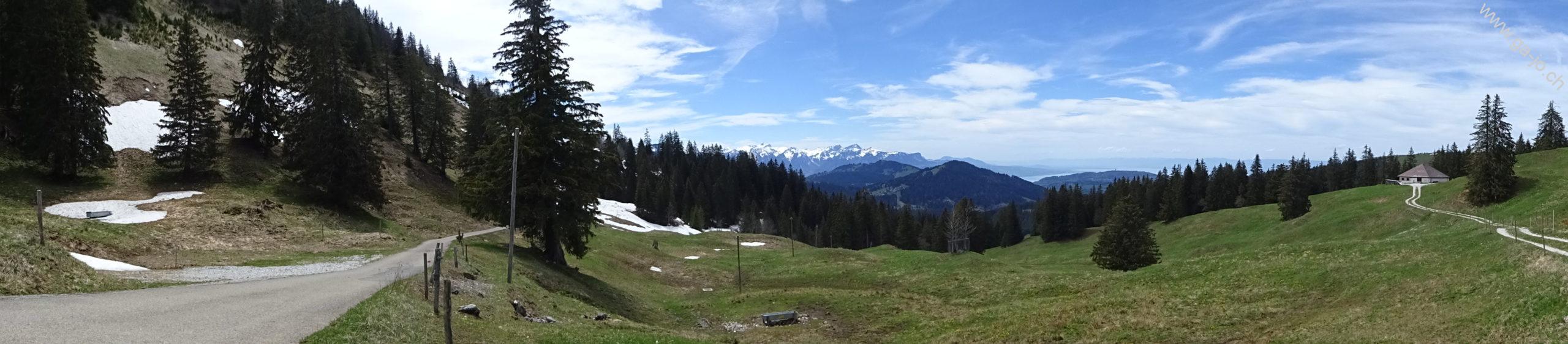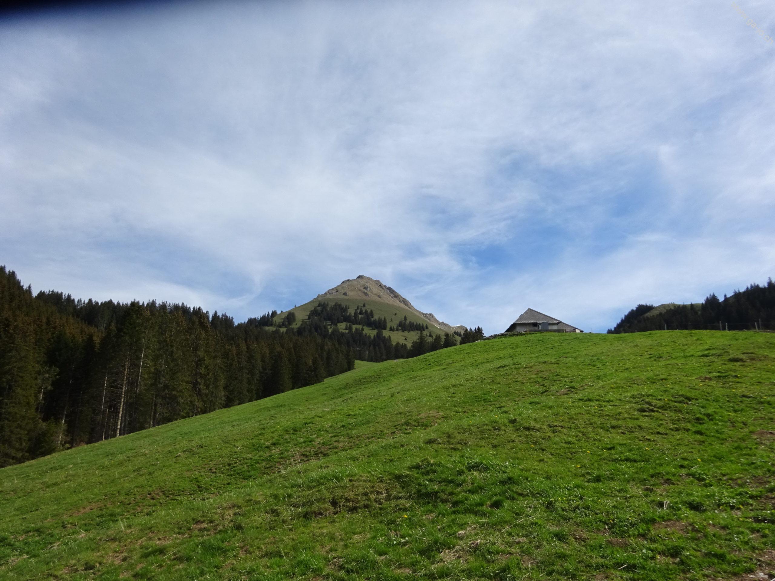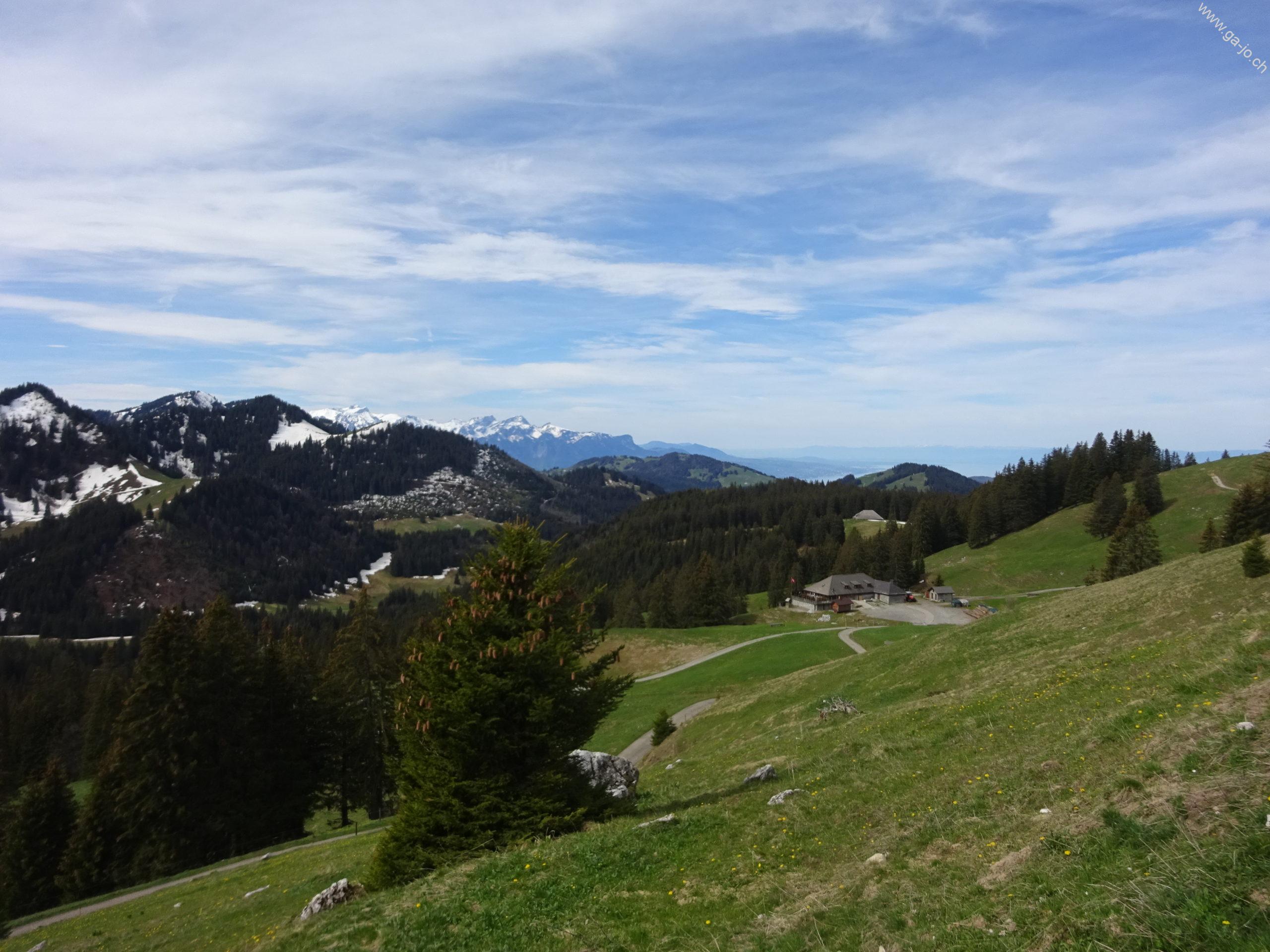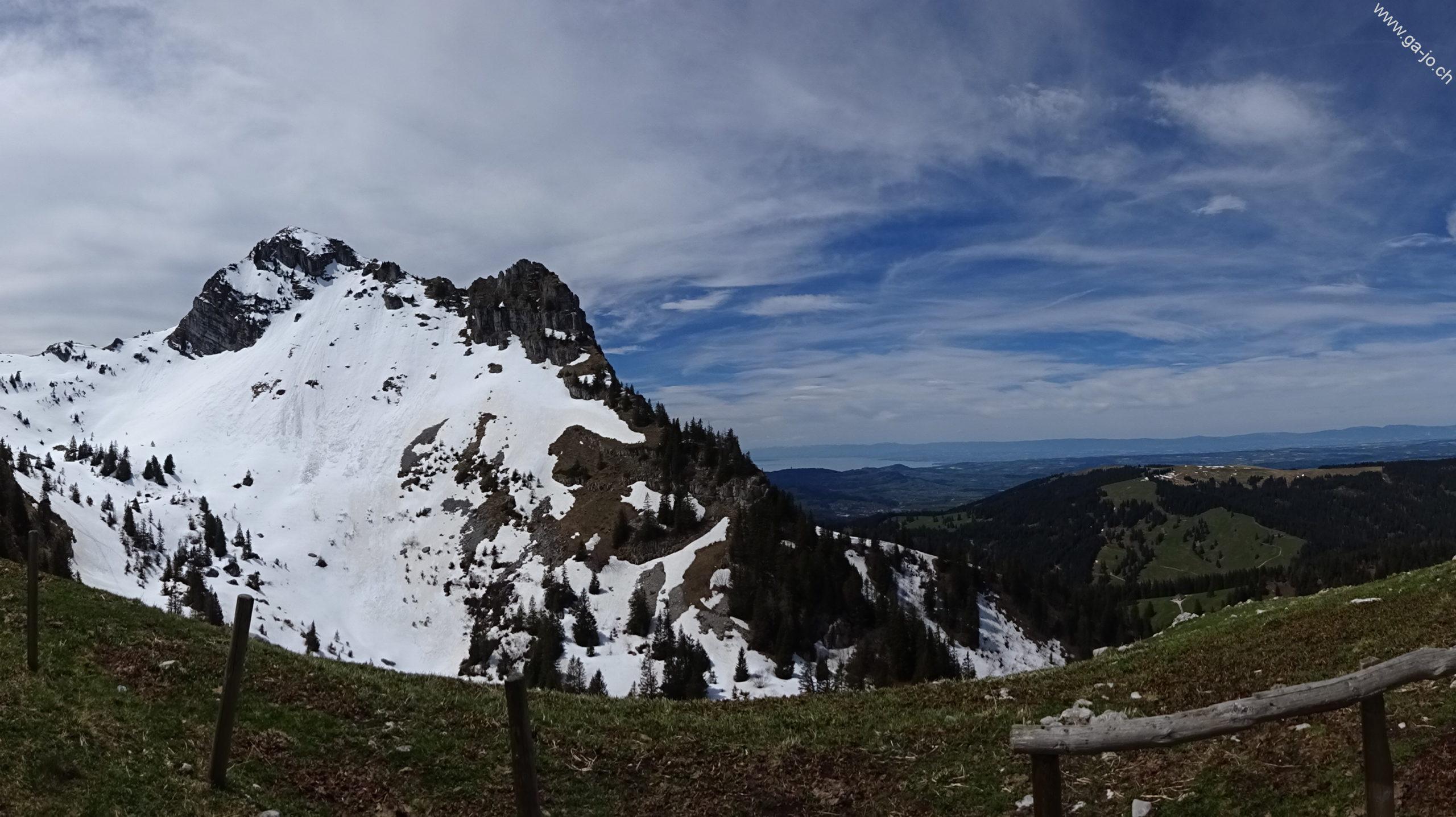 Le car postal nous dépose à son terminus, aux Paccots. On s’engage à pieds en direction de Belle-Chaux, tout d’abord sur la route, puis sur un chemin forestier. Après un plongeon rapide et involontaire dans le ruisseau, on regarde bien où on met les pieds et on sort les bâtons… on suit la chemin d’alpage qui mène à la buvette de Vuipay où l’on peut bien distinguer l’objectif du jour ainsi que la face encore bien enneigée de la dent de Lys. Derrière nous la pleine, et au loin, les crêtes du Jura.