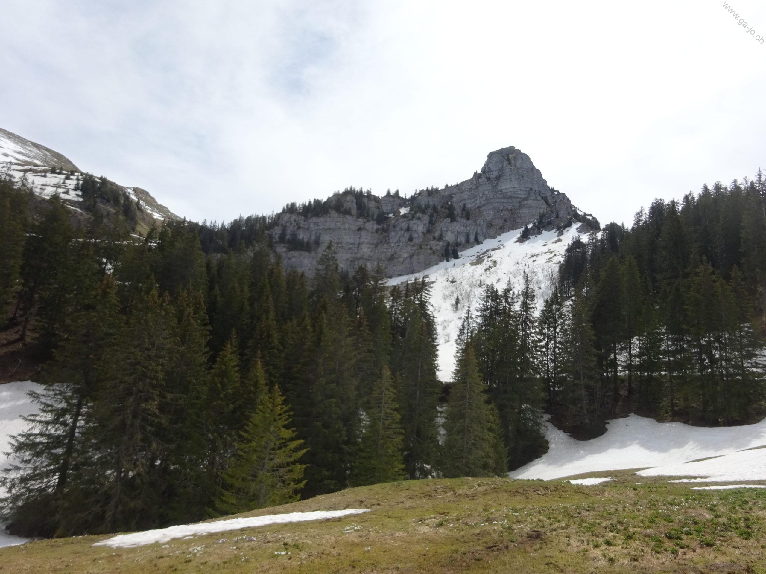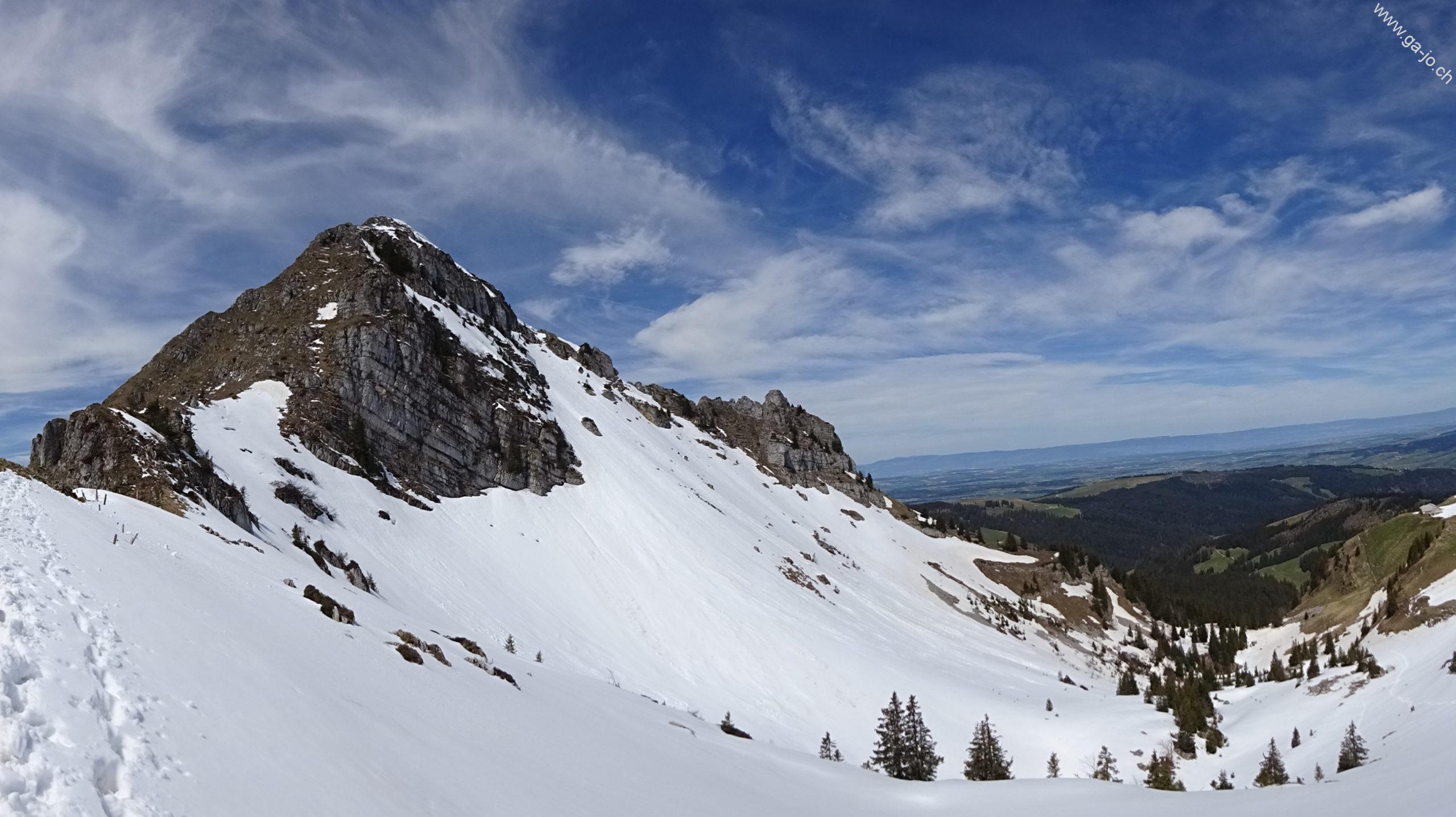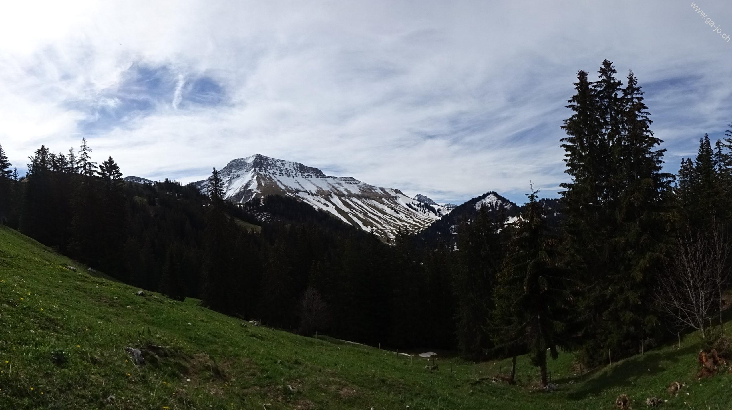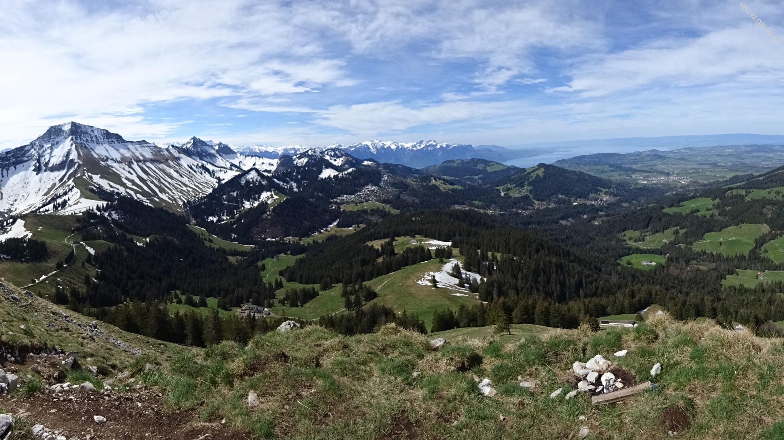 Le car postal nous dépose à son terminus, aux Paccots. On s’engage à pieds en direction de Belle-Chaux, tout d’abord sur la route, puis sur un chemin forestier. Après un plongeon rapide et involontaire dans le ruisseau, on regarde bien où on met les pieds et on sort les bâtons… on suit la chemin d’alpage qui mène à la buvette de Vuipay où l’on peut bien distinguer l’objectif du jour ainsi que la face encore bien enneigée de la dent de Lys. Derrière nous la pleine, et au loin, les crêtes du Jura.