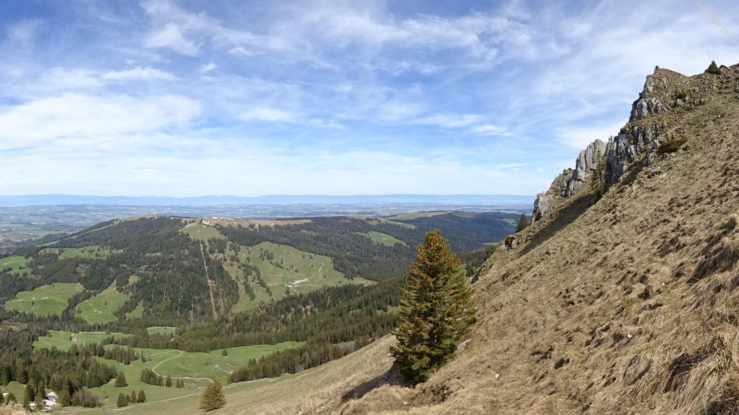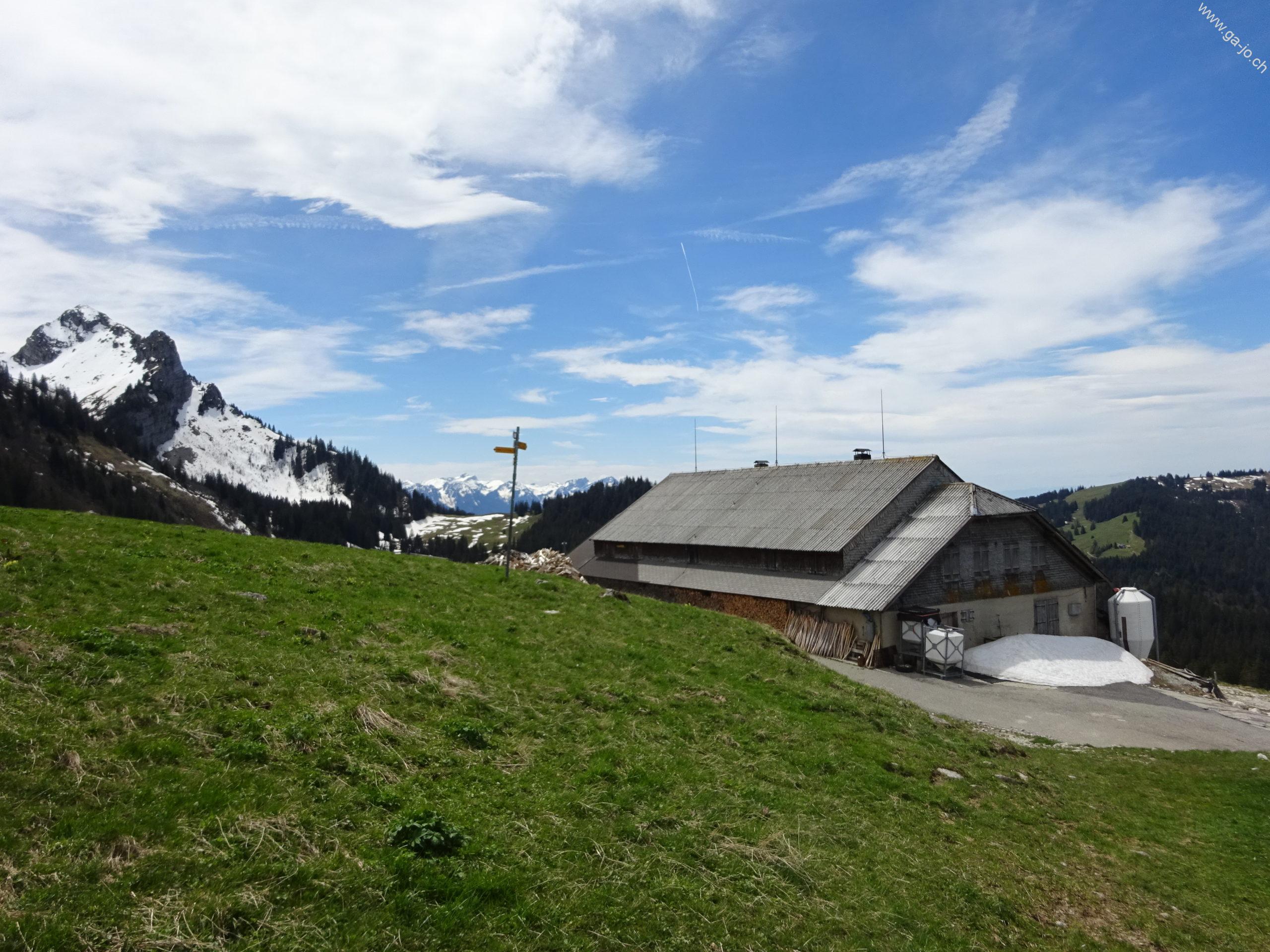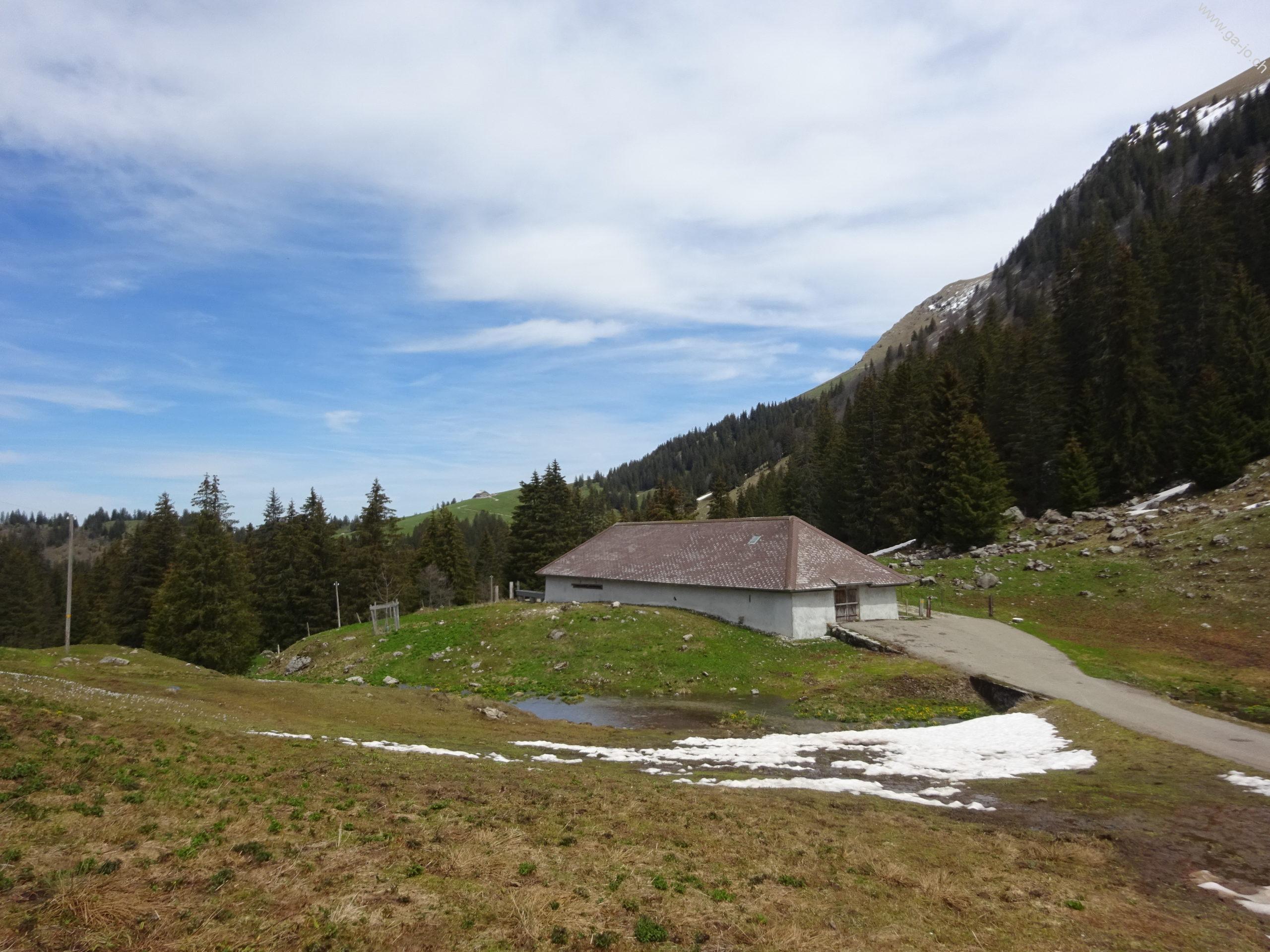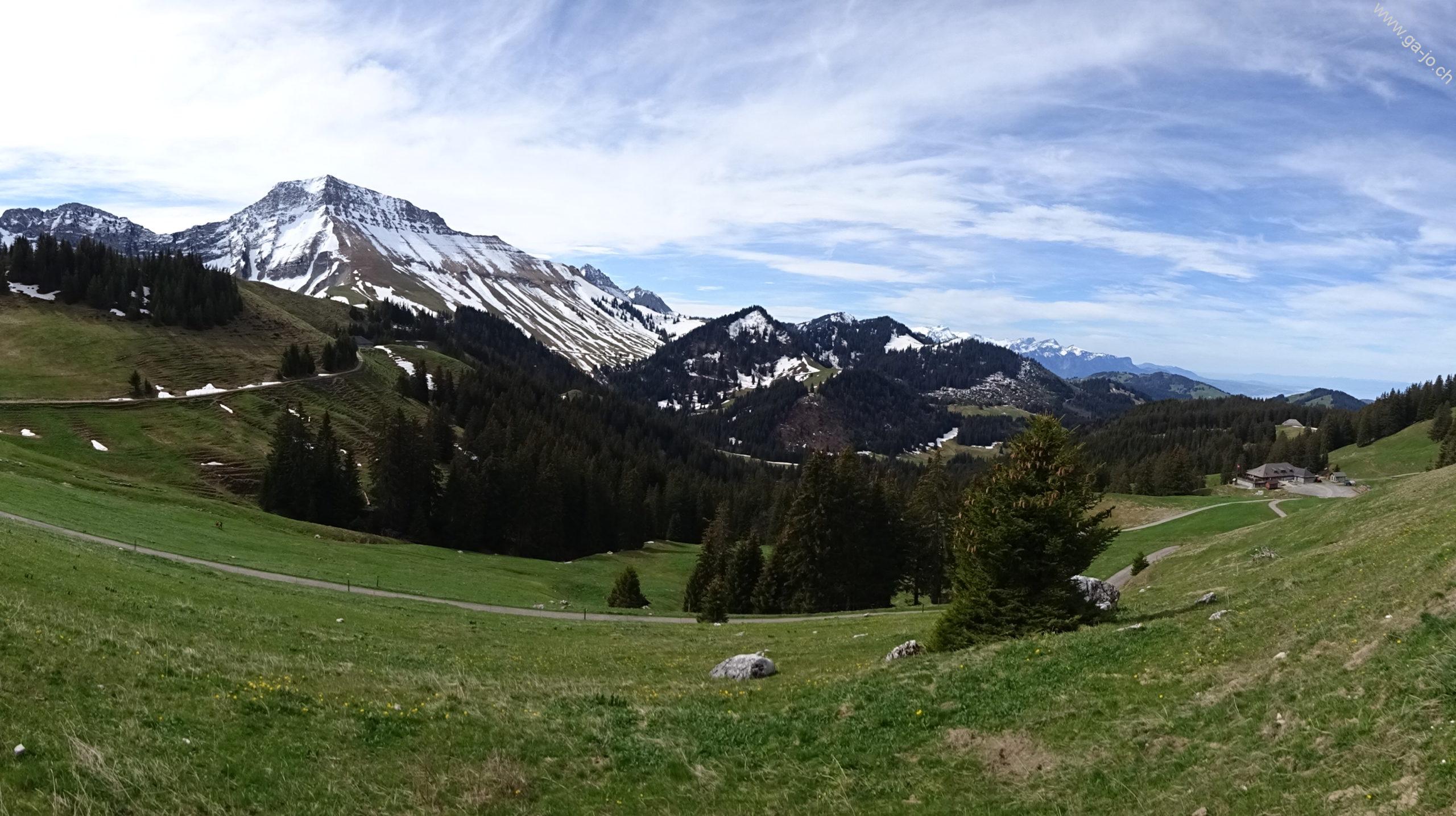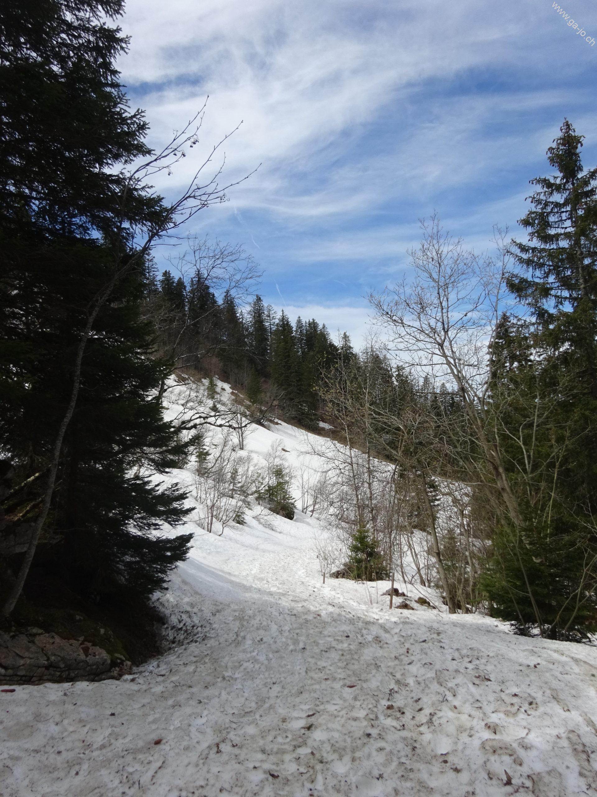 Le car postal nous dépose à son terminus, aux Paccots. On s’engage à pieds en direction de Belle-Chaux, tout d’abord sur la route, puis sur un chemin forestier. Après un plongeon rapide et involontaire dans le ruisseau, on regarde bien où on met les pieds et on sort les bâtons… on suit la chemin d’alpage qui mène à la buvette de Vuipay où l’on peut bien distinguer l’objectif du jour ainsi que la face encore bien enneigée de la dent de Lys. Derrière nous la pleine, et au loin, les crêtes du Jura.