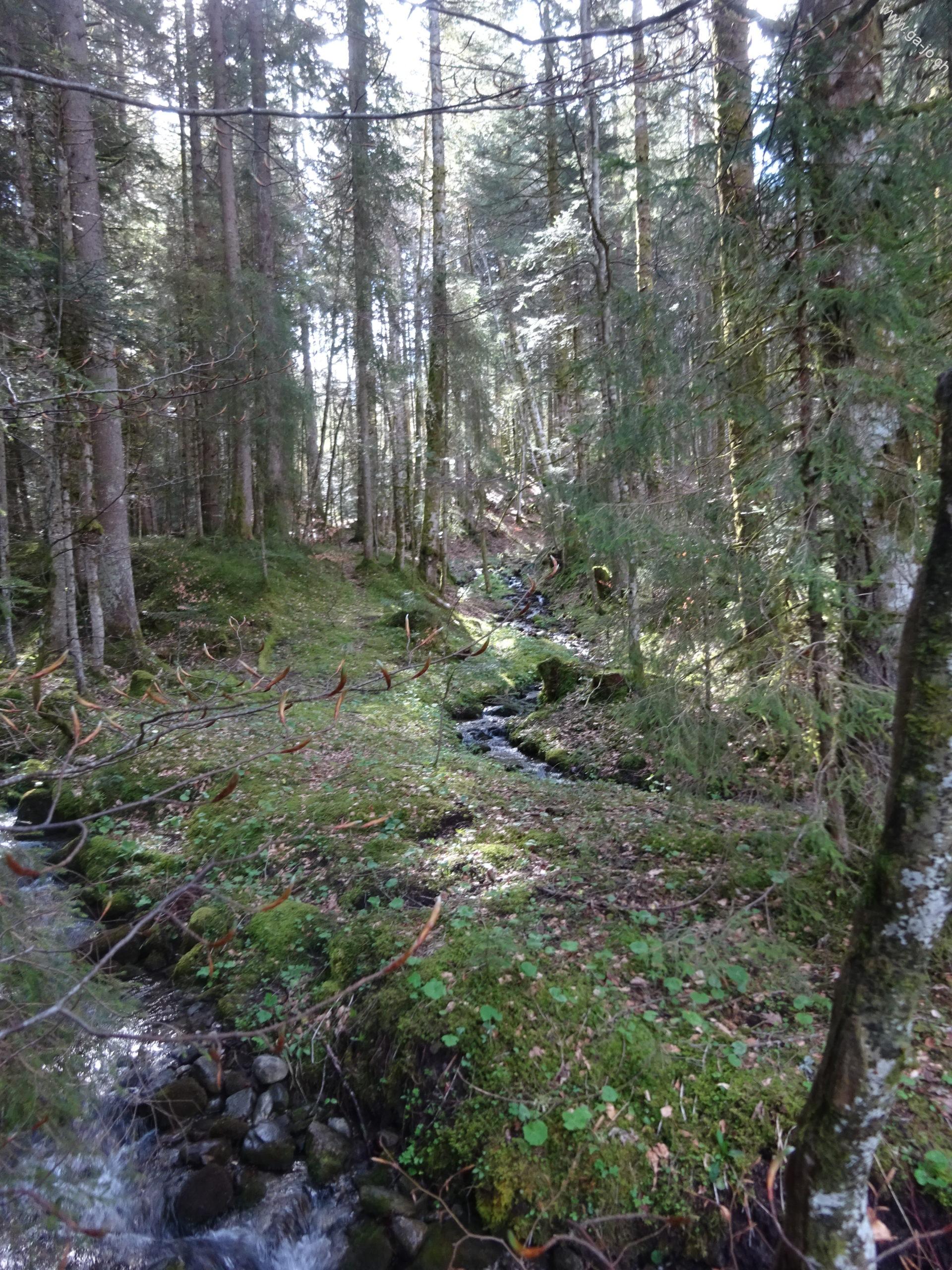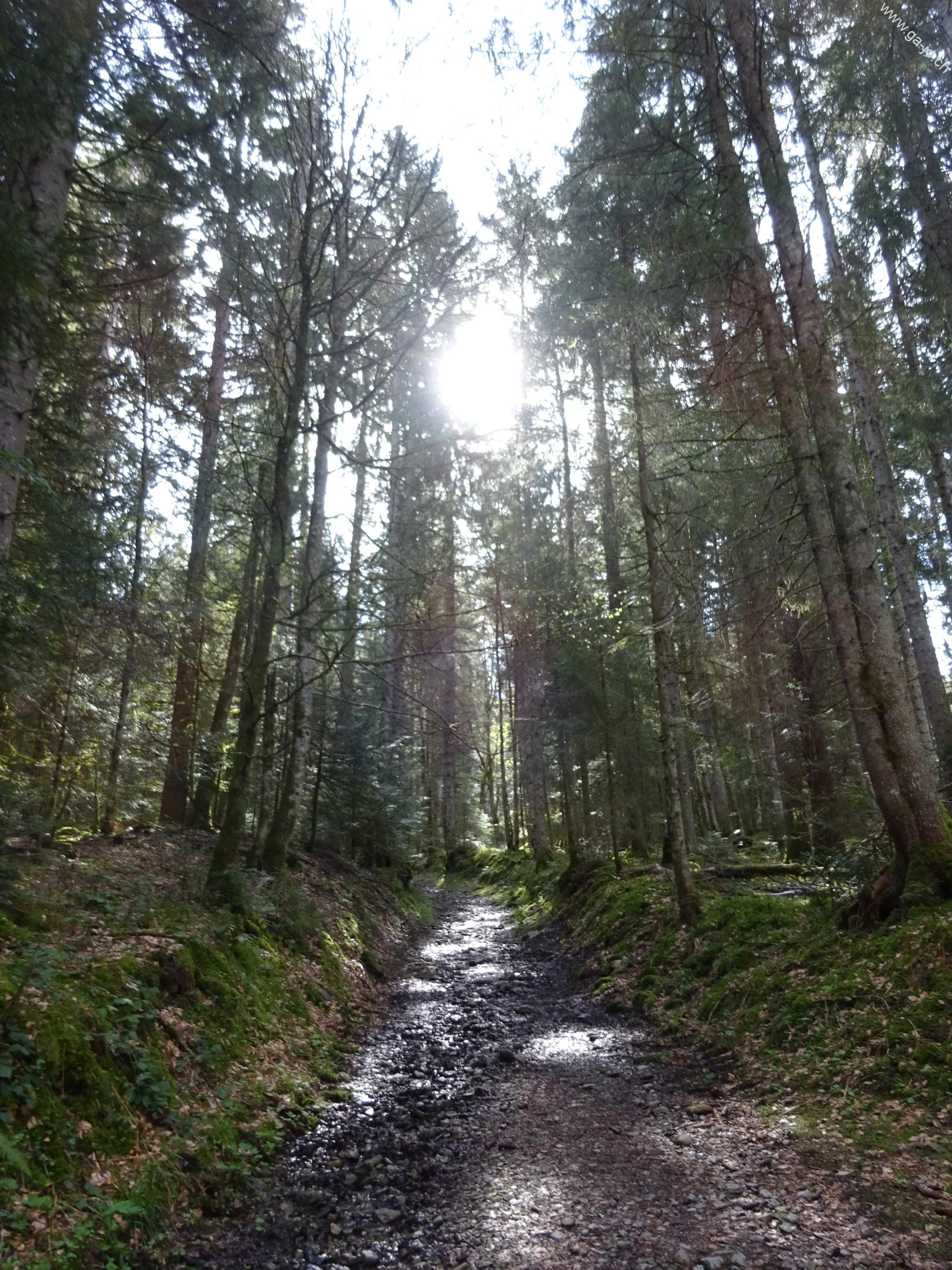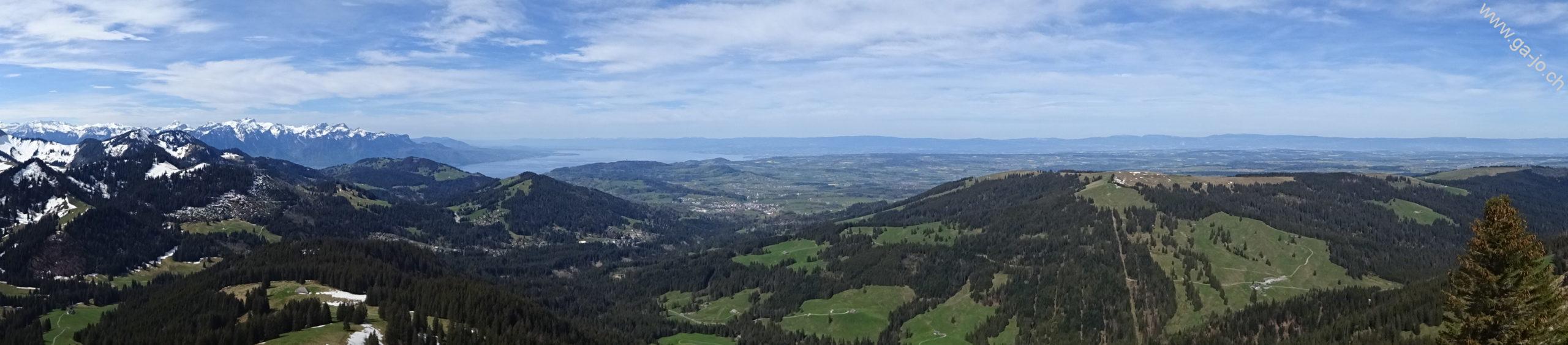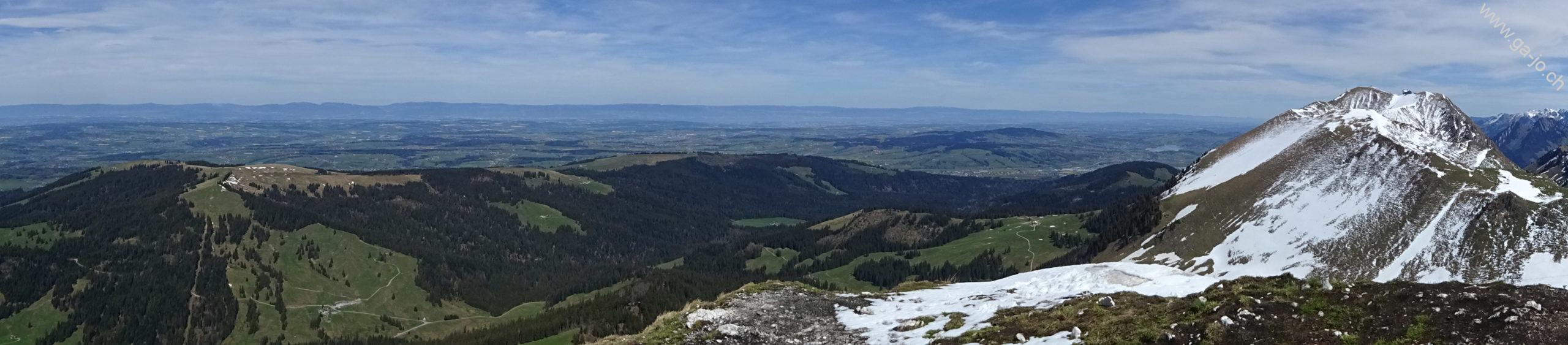 Le car postal nous dépose à son terminus, aux Paccots. On s’engage à pieds en direction de Belle-Chaux, tout d’abord sur la route, puis sur un chemin forestier. Après un plongeon rapide et involontaire dans le ruisseau, on regarde bien où on met les pieds et on sort les bâtons… on suit la chemin d’alpage qui mène à la buvette de Vuipay où l’on peut bien distinguer l’objectif du jour ainsi que la face encore bien enneigée de la dent de Lys. Derrière nous la pleine, et au loin, les crêtes du Jura.