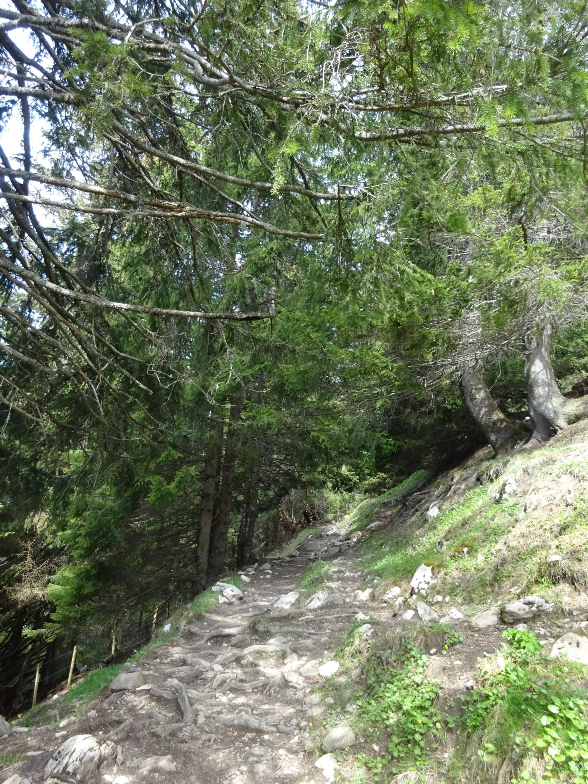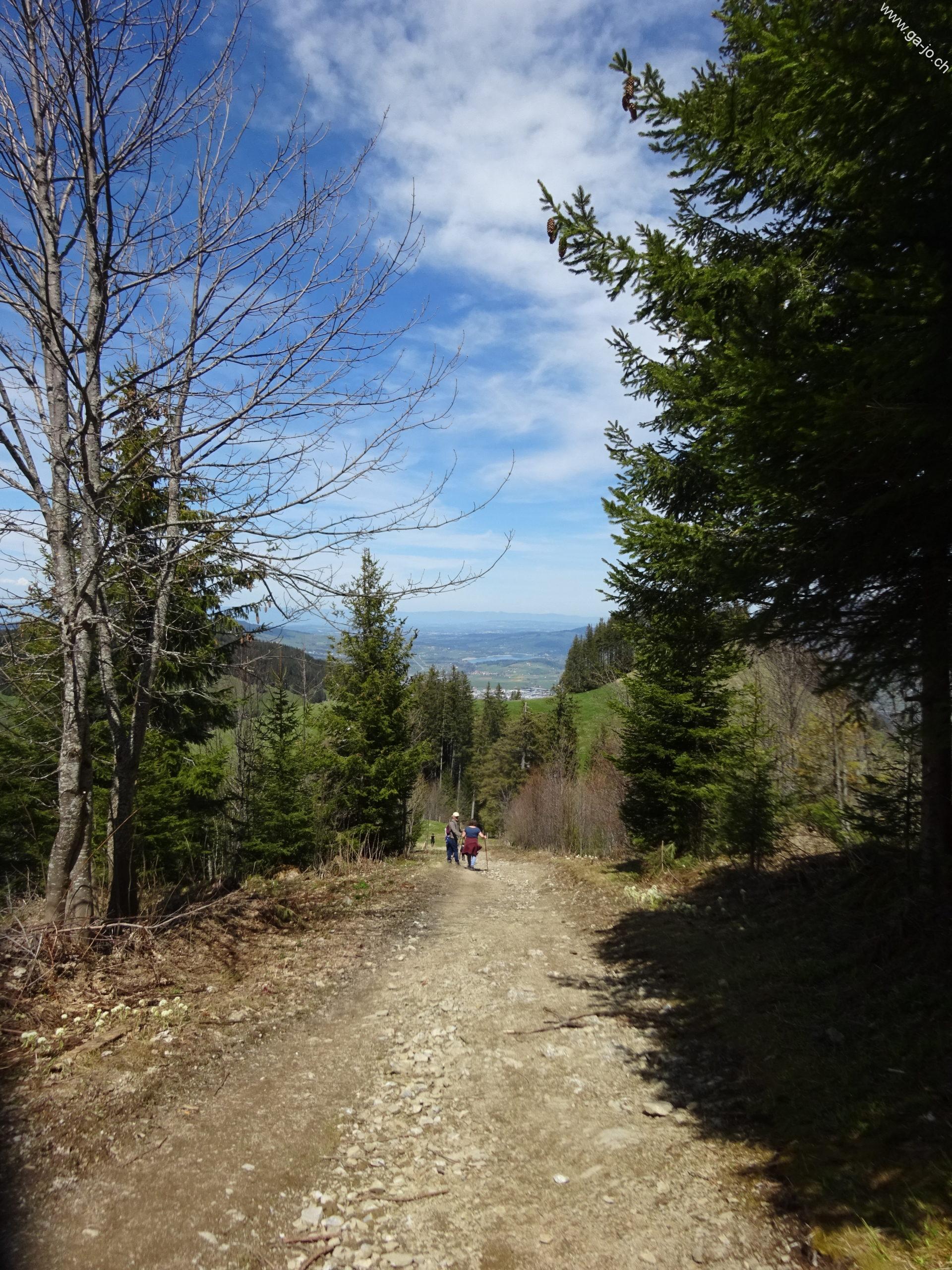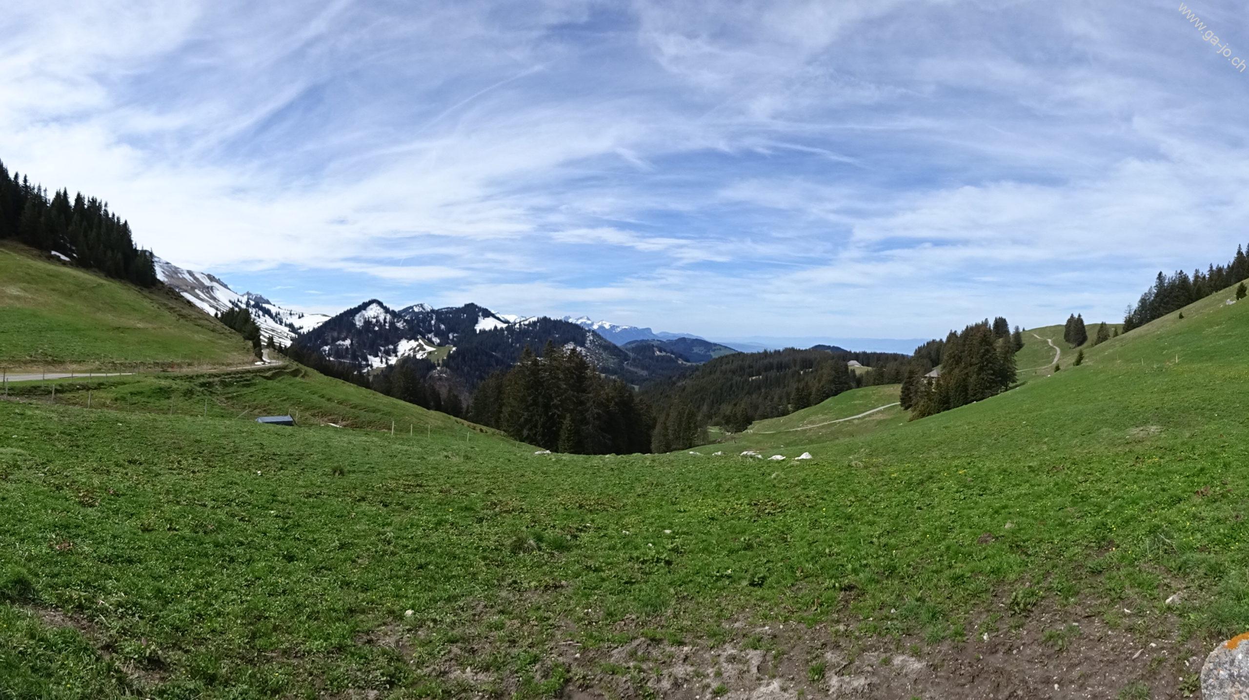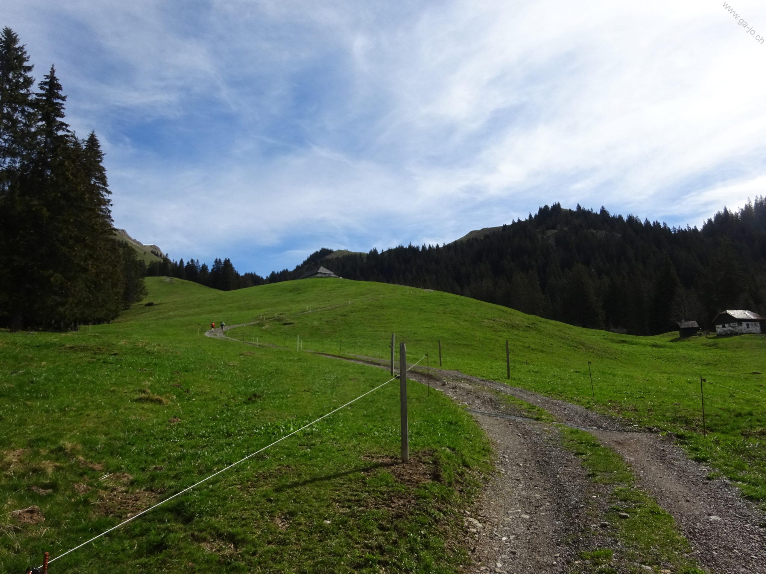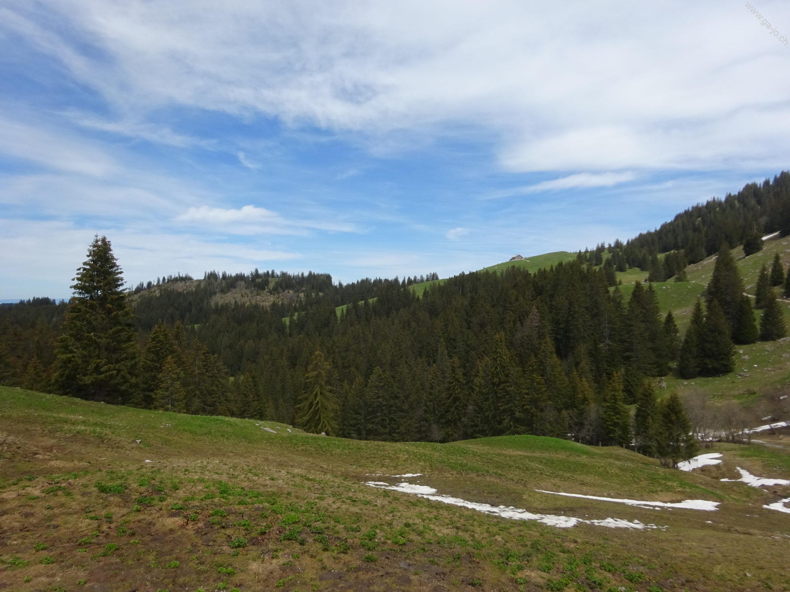 La descente se fait à travers le pâturage, encore partiellement enneigé, mais sans grande difficulté. Le chemin rejoint alors Plan-Francey en passant par le Gros-Plané.
