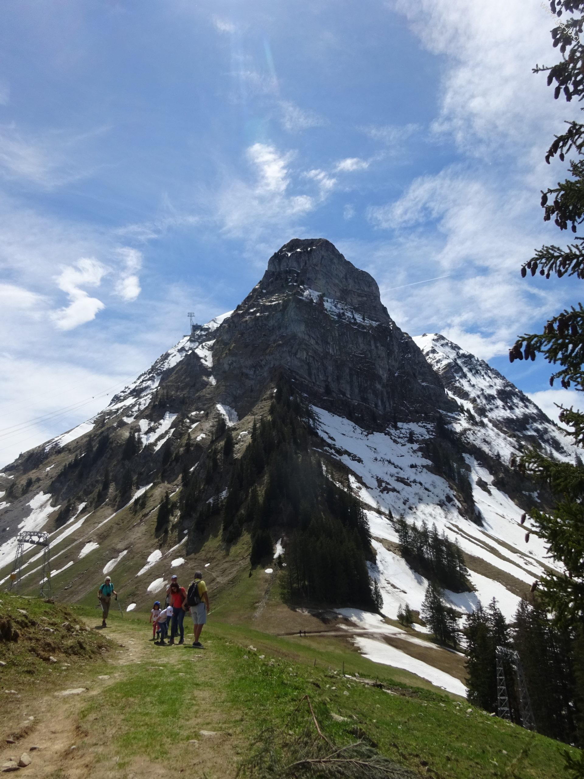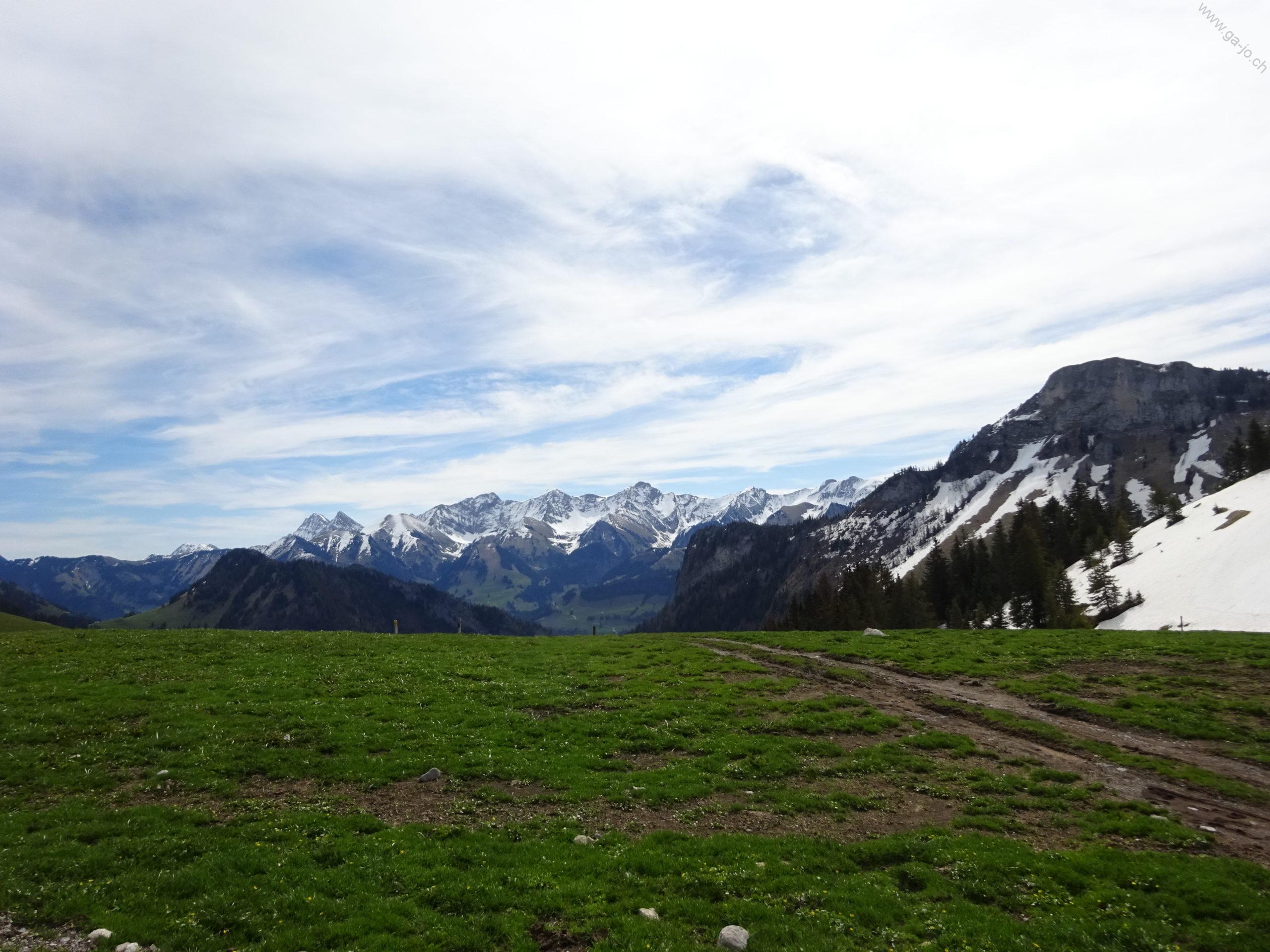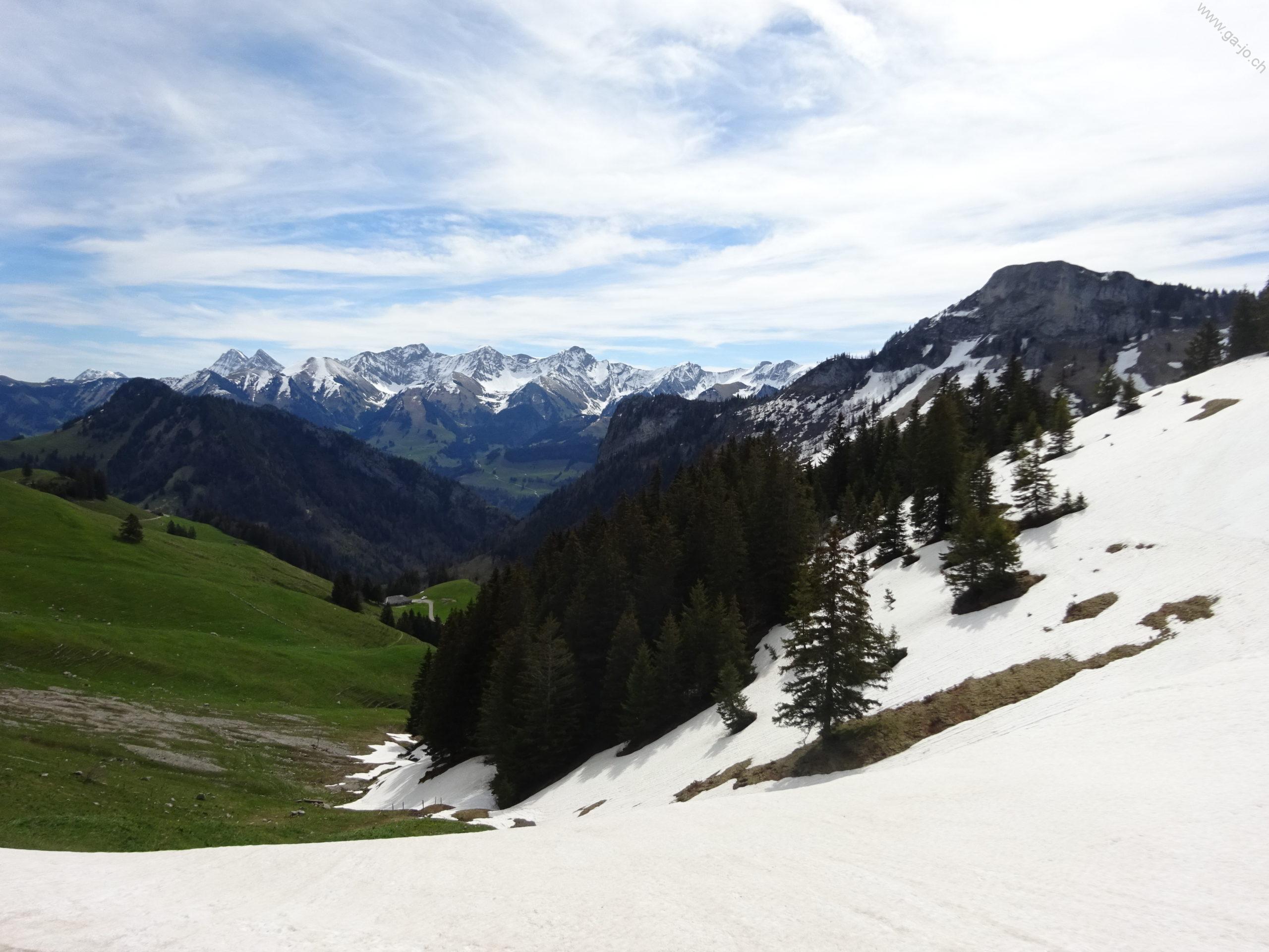 Arrivés au sommet, le panorama est magnifique avec, juste en dessous de nous, Rathvel et la cabane du petit Oiseau, station où j’ai appris à skier et en face, la crête du Moléson, encore bien enneigée par endroits. La descente par l’arrête nord n’est pas de tout repos, la pente est bien raide et les conditions un peu humides ce qui explique le manque de photos, on préfére regarder où on met les pieds. On avance un peu sur la crête du Moléson avec un petit regard derrière nous pour observer ce que l’on vient de descendre. On bifurque au pt. 1786 en direction de la Tremetta où l’on s’arrêtera pour pique-niquer.