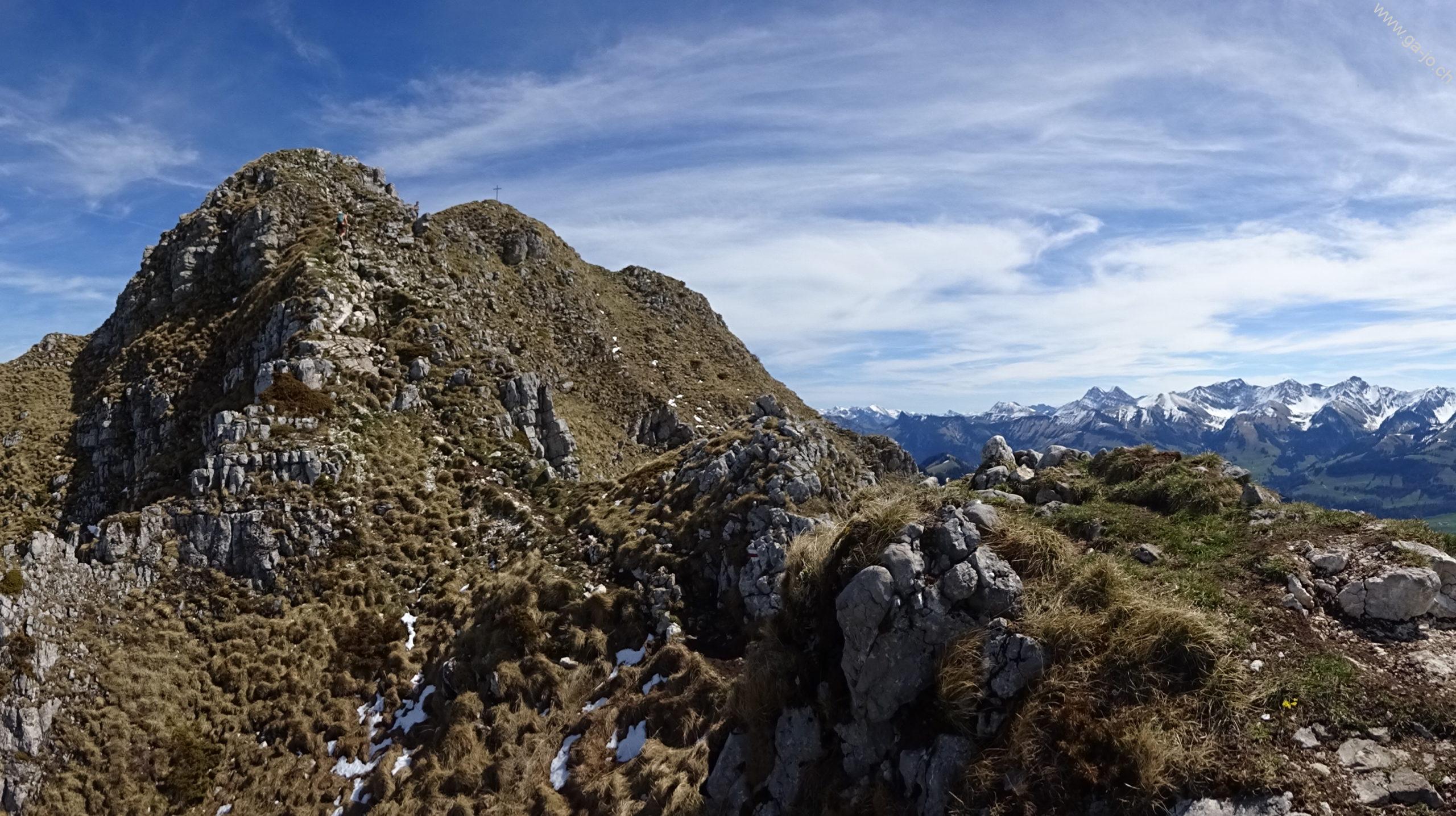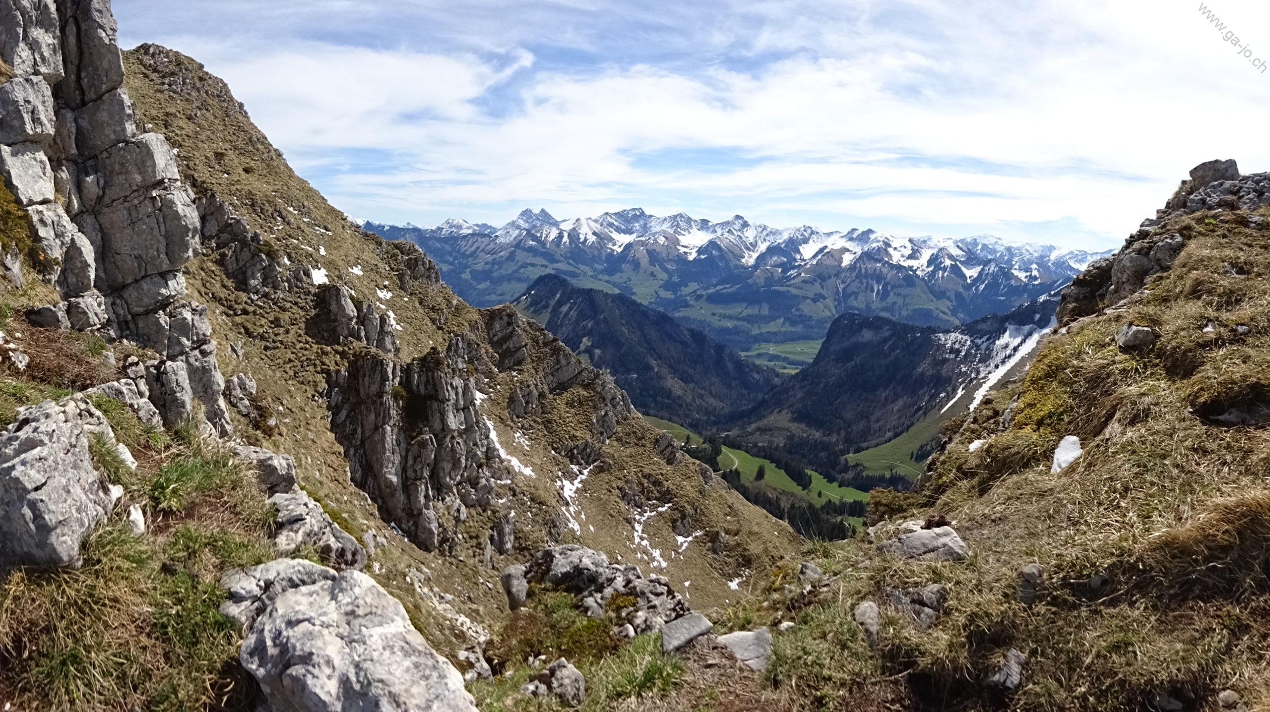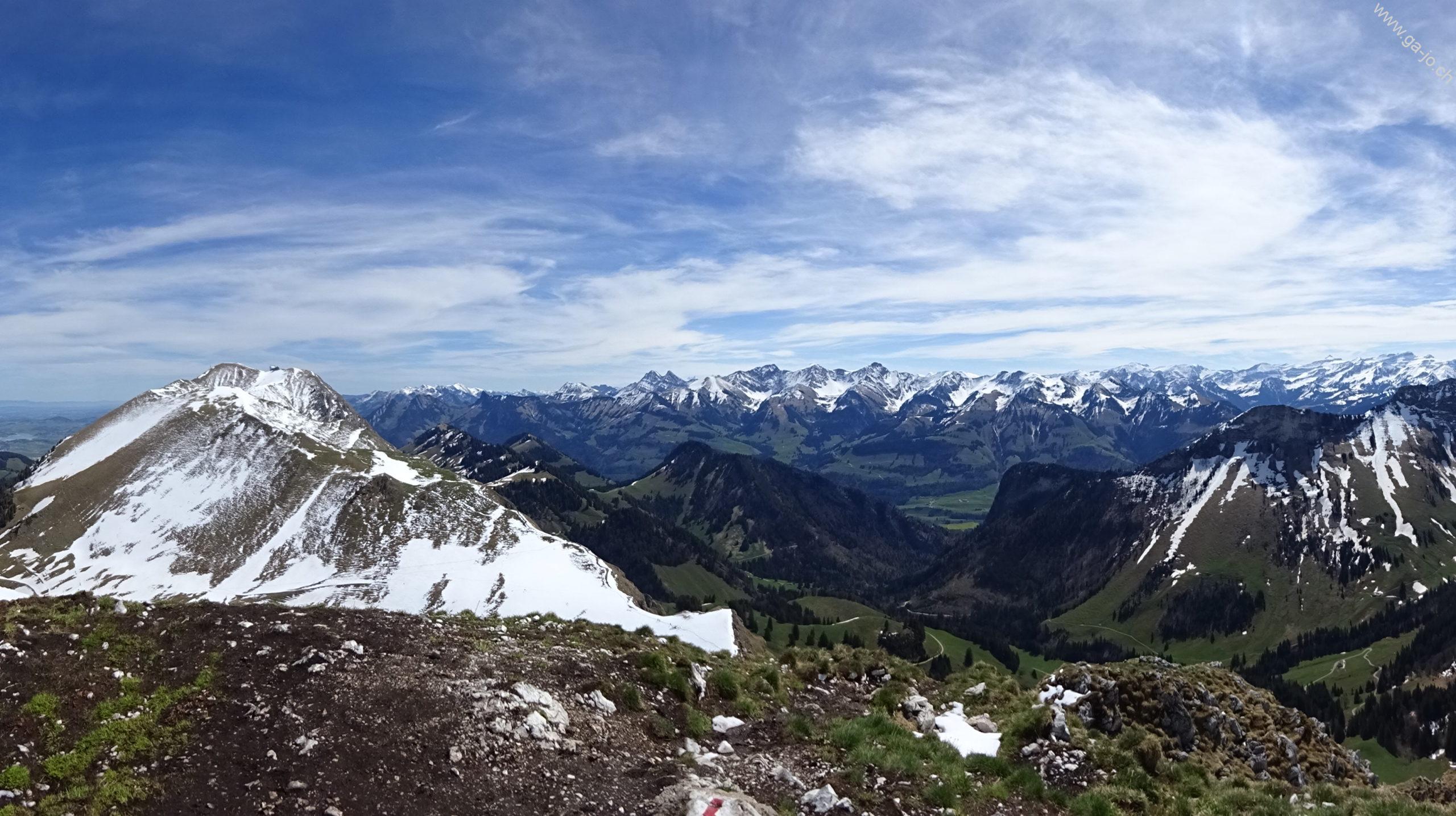 Arrivés au sommet, le panorama est magnifique avec, juste en dessous de nous, Rathvel et la cabane du petit Oiseau, station où j’ai appris à skier et en face, la crête du Moléson, encore bien enneigée par endroits. La descente par l’arrête nord n’est pas de tout repos, la pente est bien raide et les conditions un peu humides ce qui explique le manque de photos, on préfére regarder où on met les pieds. On avance un peu sur la crête du Moléson avec un petit regard derrière nous pour observer ce que l’on vient de descendre. On bifurque au pt. 1786 en direction de la Tremetta où l’on s’arrêtera pour pique-niquer.