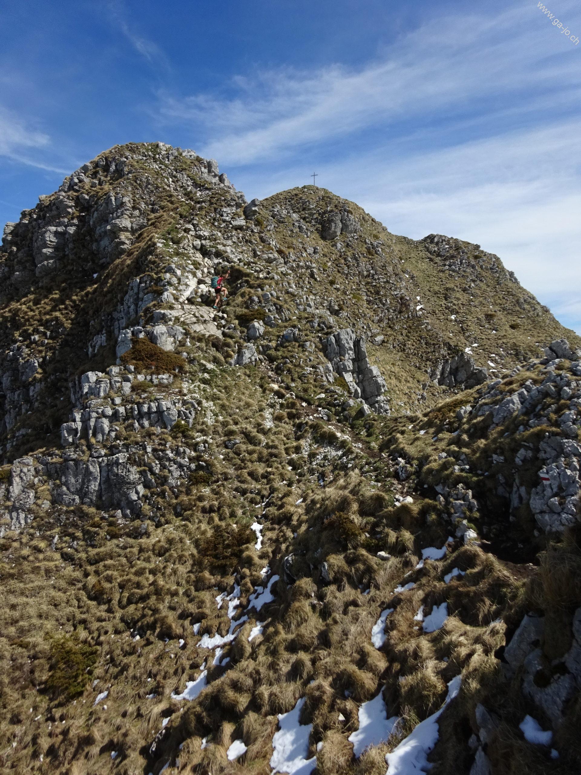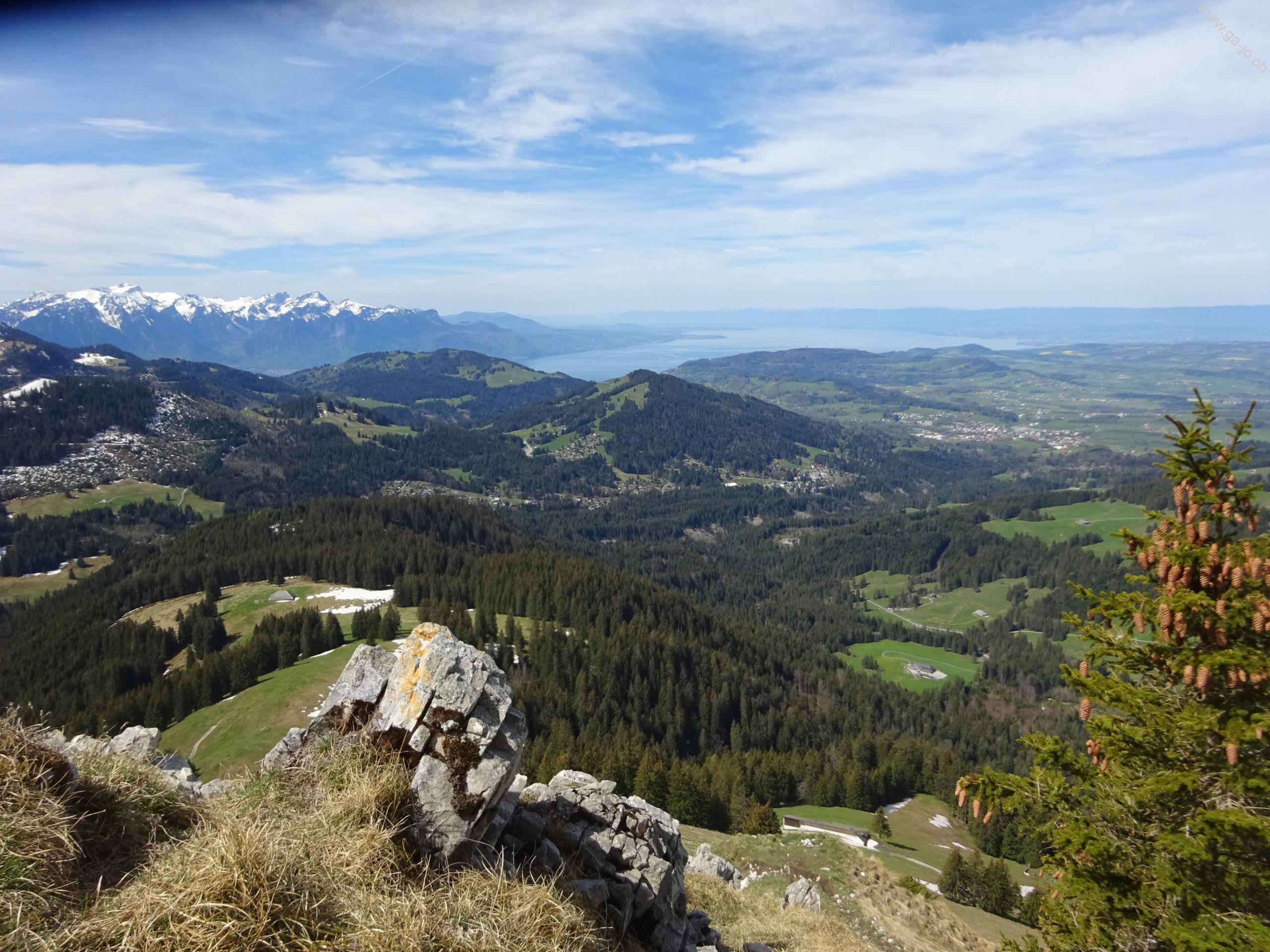 Peu après le Vuipay, les indications pour le Teysachaux apparaissent sur les panneaux et le chemin commence à bien monter, on change de catégorie. Après la forêt, on bifurque à droite pour suivre l’arrête avec de nombreuses vires. Le chemin devient de plus en plus technique, il faut un peu sortir les mains des poches et/ou ranger les bâtons. D’un côté on a une vue sur le plateau, le Léman et au loin le Jura et de l’autre, la chaine des Vanils. Le sommet est rejoint sans trop de problème, mais attention, certains passages sont quand même un peu exposés.