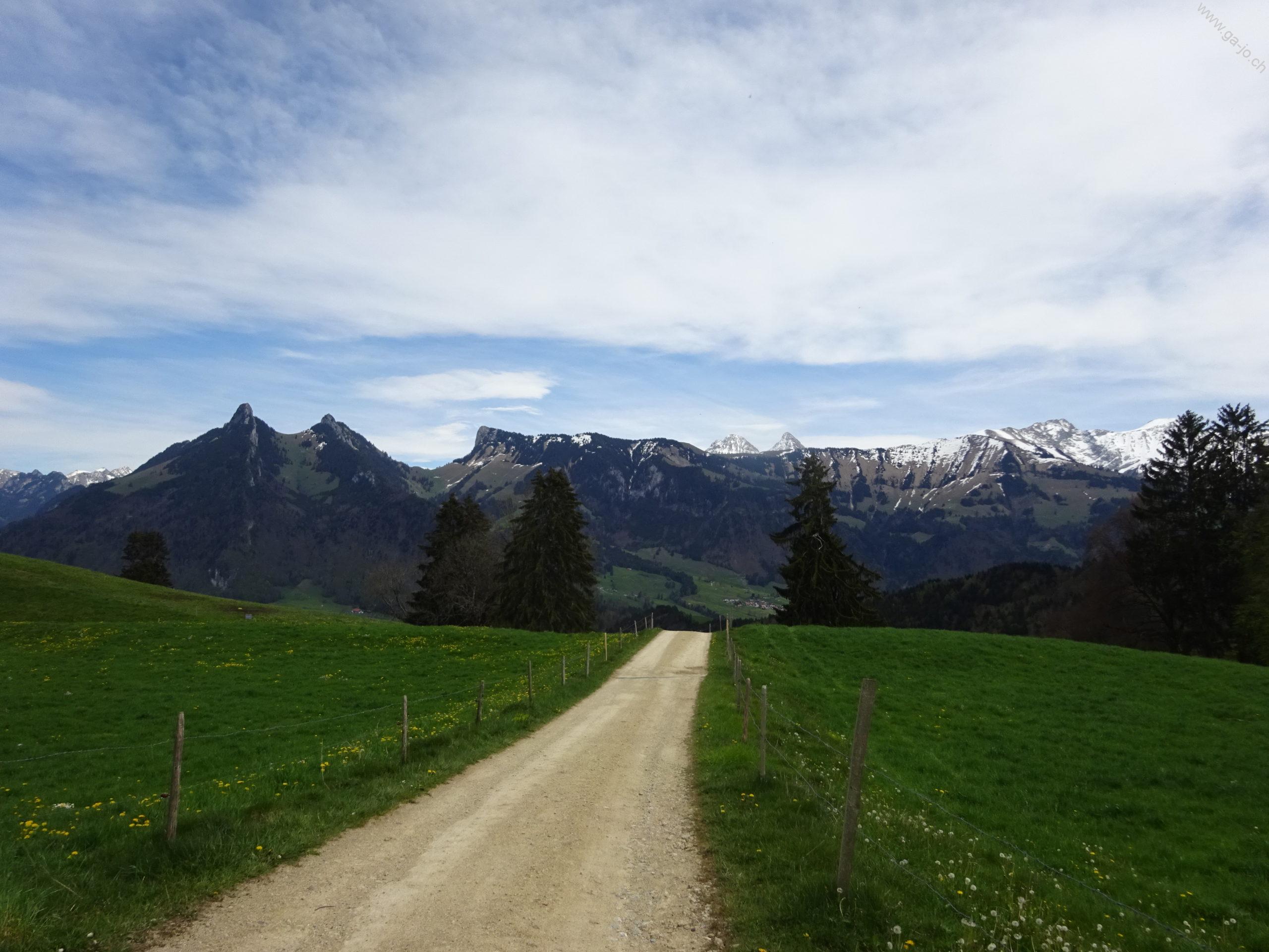 Depuis Plan-Francey, la descente vers Gruyères suit une route d’alpage sans grande surprise et bien fréquentée par nombre de promeneurs montés en funiculaires, qui eux, bifurqueront en direction de Moléson-Village.