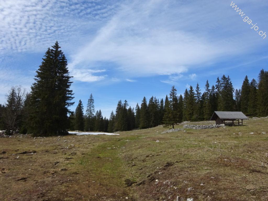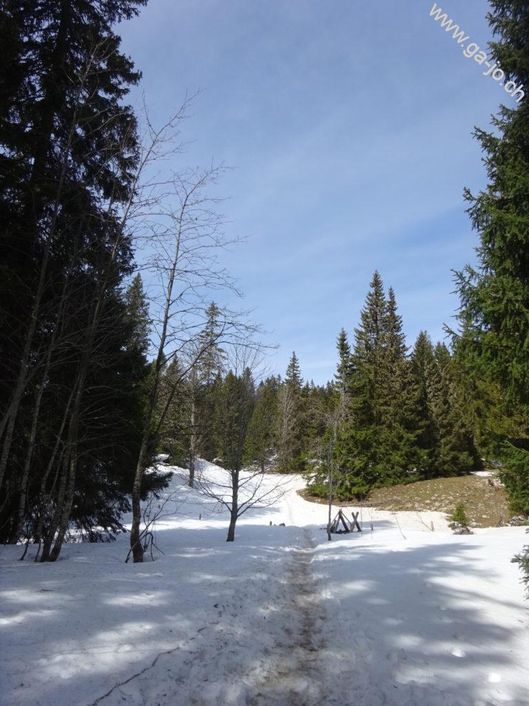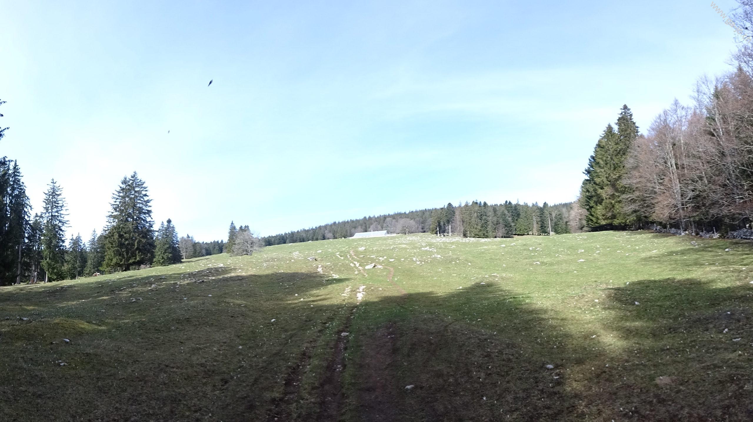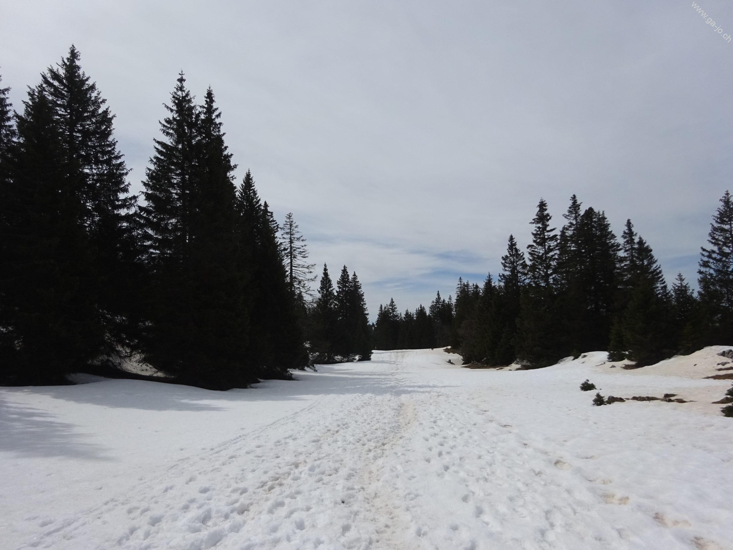 Le chemin se poursuit en montant dans la forêt où les premiers névés apparaissent. On débouche finalement à l’alpage du Mont Tendre, le sommet n’est plus très loin.
