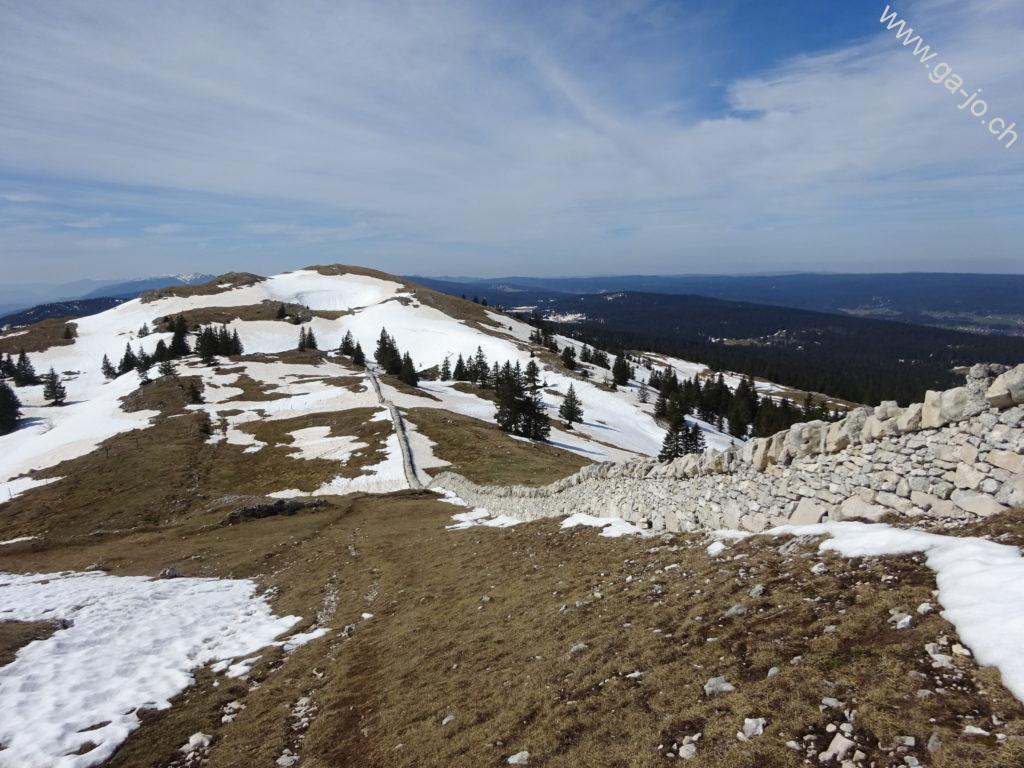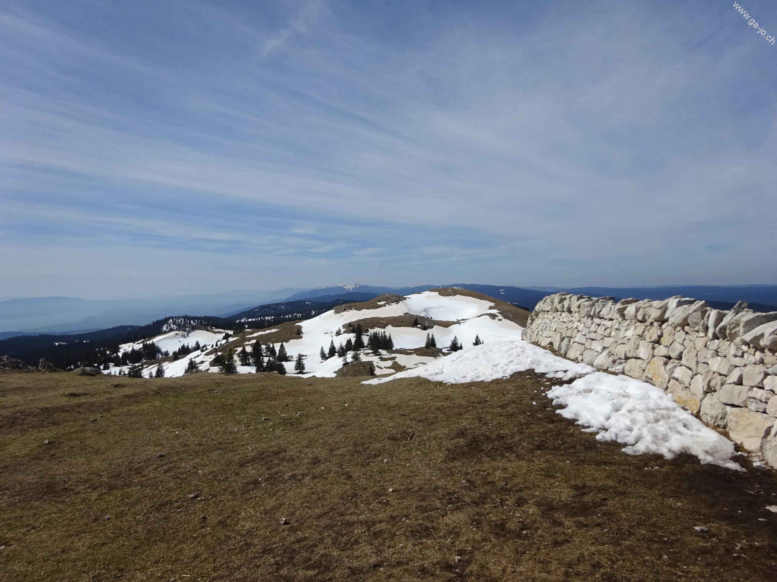 On ne restera pas très longtemps en haut, le vent glacial nous incite à une descente sans trop tarder. On longe alors le muret pour le traverser vers l’O en direction du Chelet de Yens.