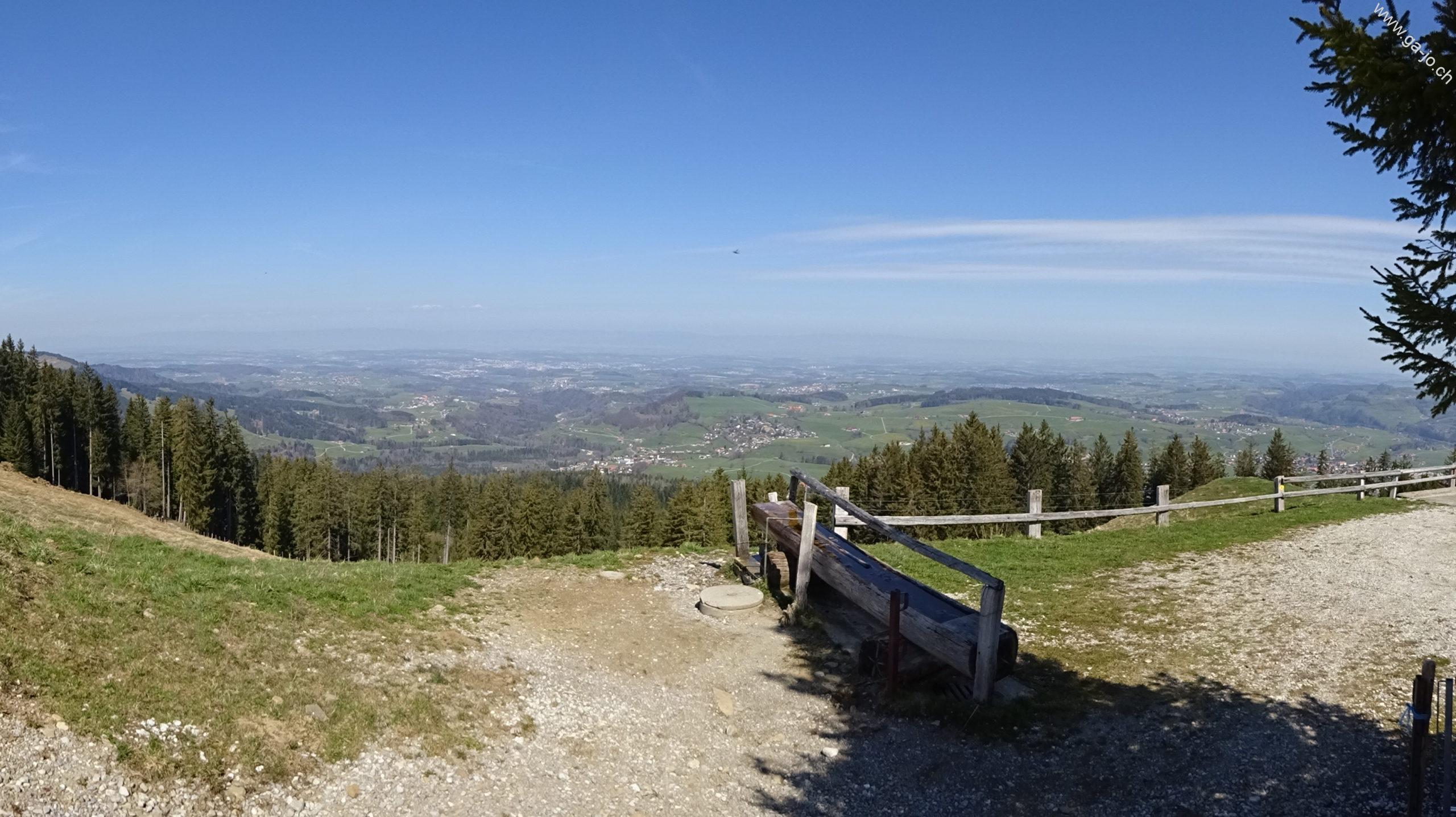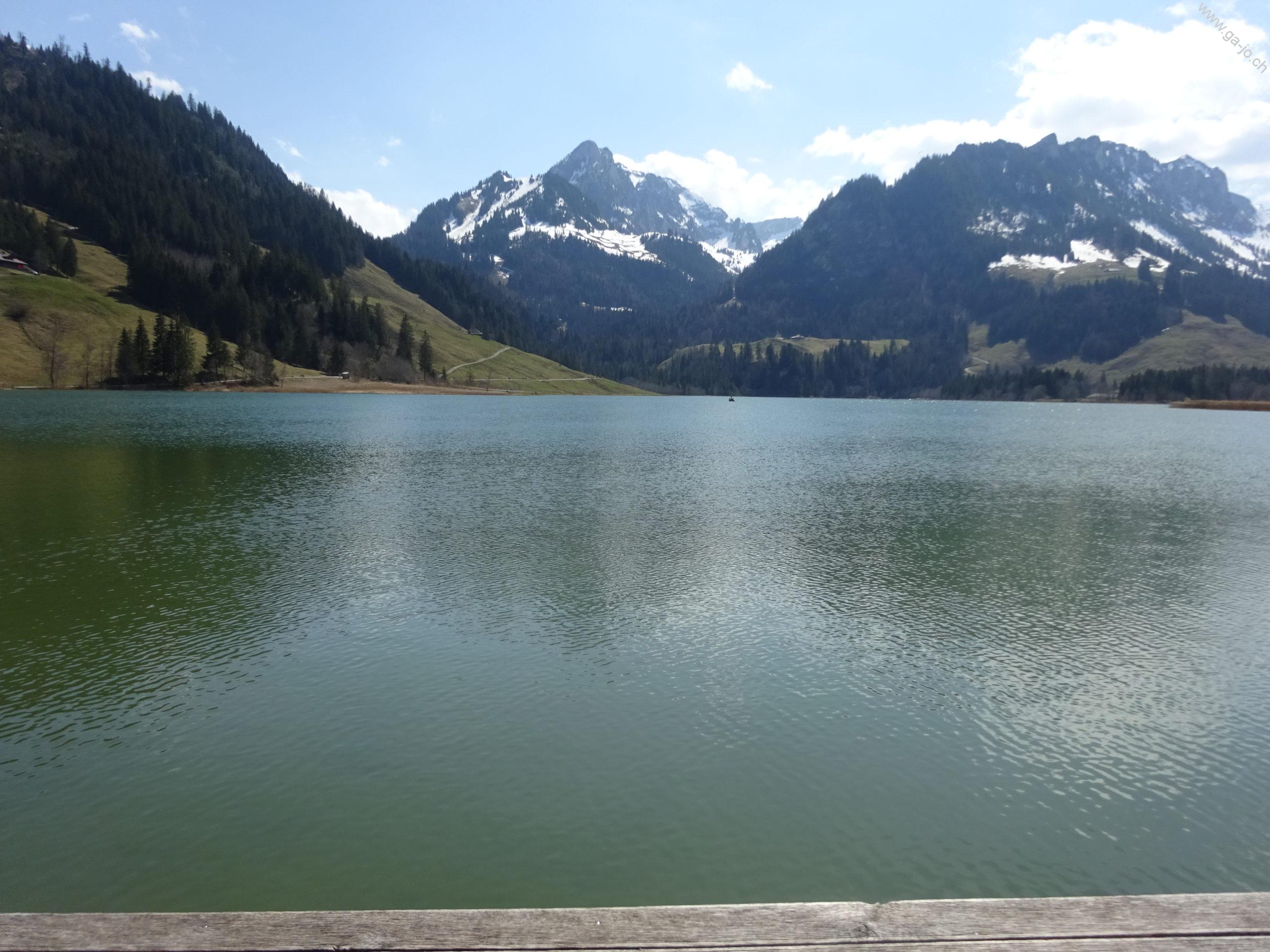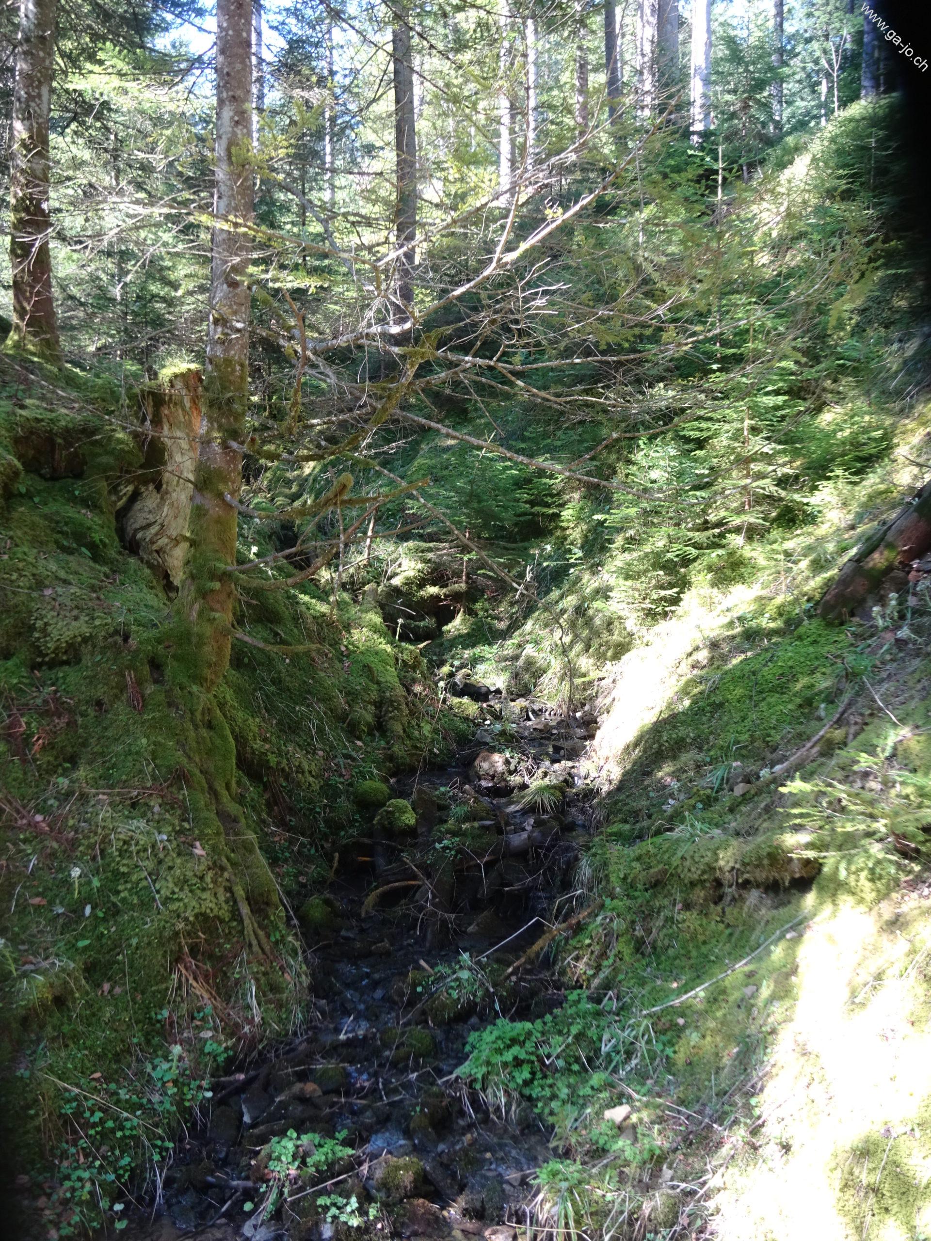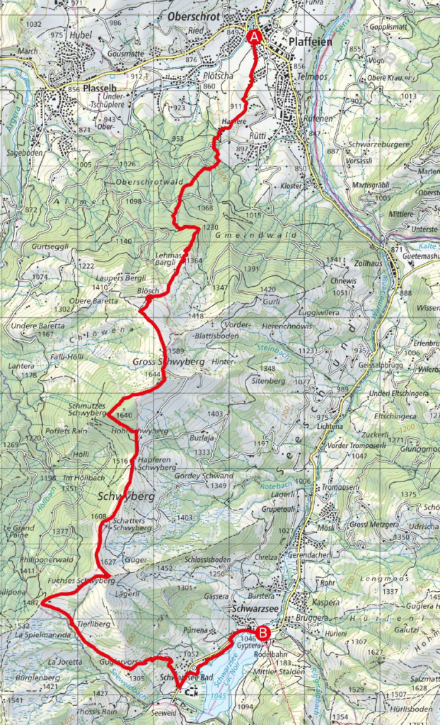 La route d’alpage continue alors en direction du sud, nous la suivons sur une centaine de mètres avant de bifurquer sur la droite en direction du sommet du Schwyberg (1645m). Le sentier redescend alors quelque peu pour contourner par la forêt le sommet sans nom (pt. 1640) et continue plus ou moins sur l’arrête jusqu’au promontoire (pt. 1620) offrant une vue dégagées sur les alentours. De là, la descente se fait tout d’abord vers l’ouest en passant par Fuchses Schwyberg puis à trabers alpages et forêts jusqu’à Schwarzsee Bad.