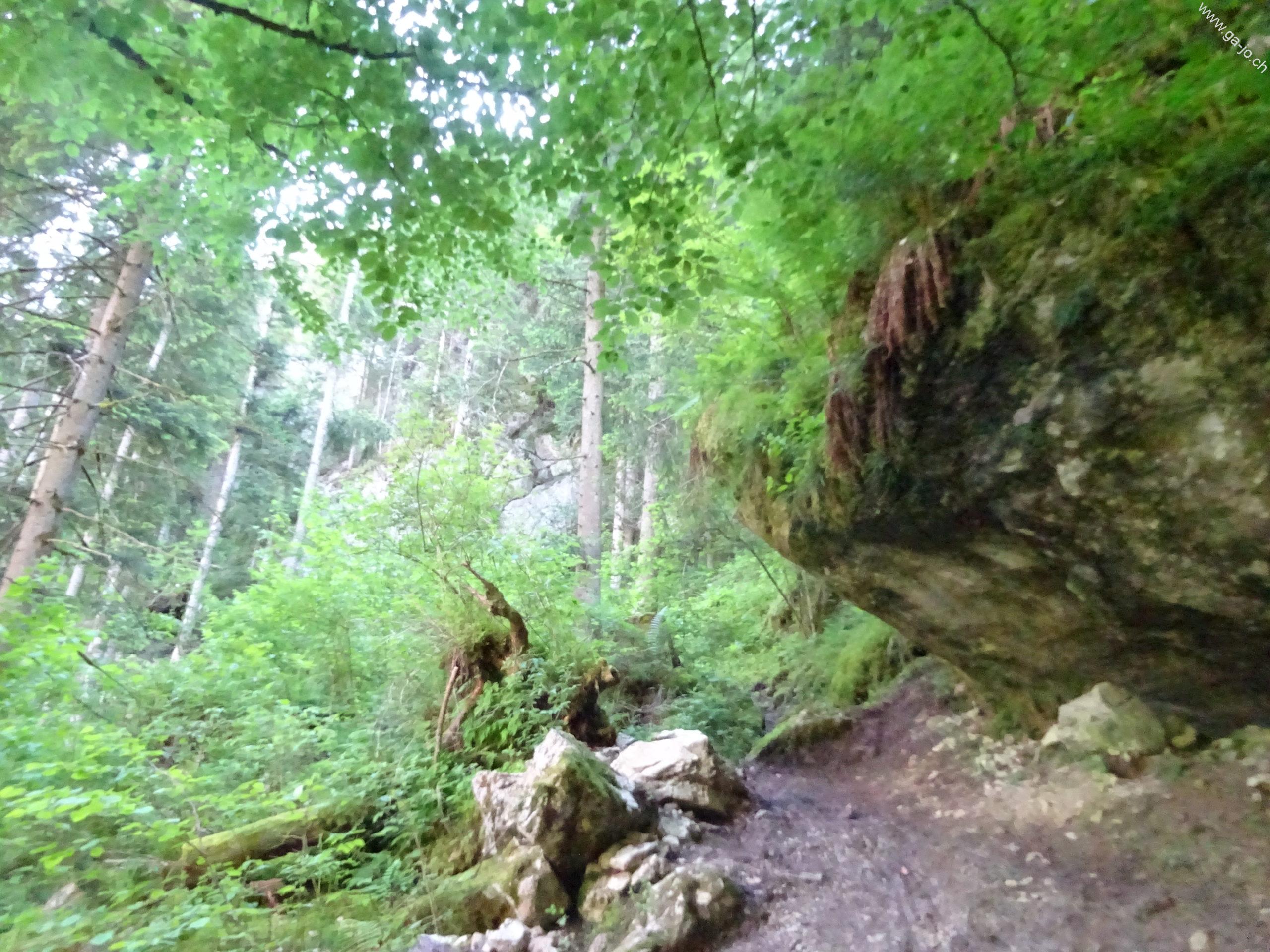 En haut de la crête, le chemin fait une vire assez large pour longer la paroi rocheuse jusqu’à y trouver un passage permettant de s’y introduire pour la passer finalement assez aisément.
