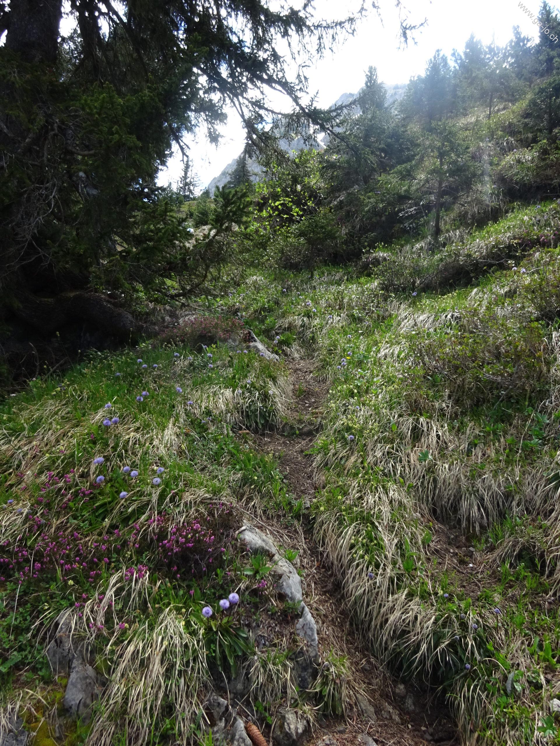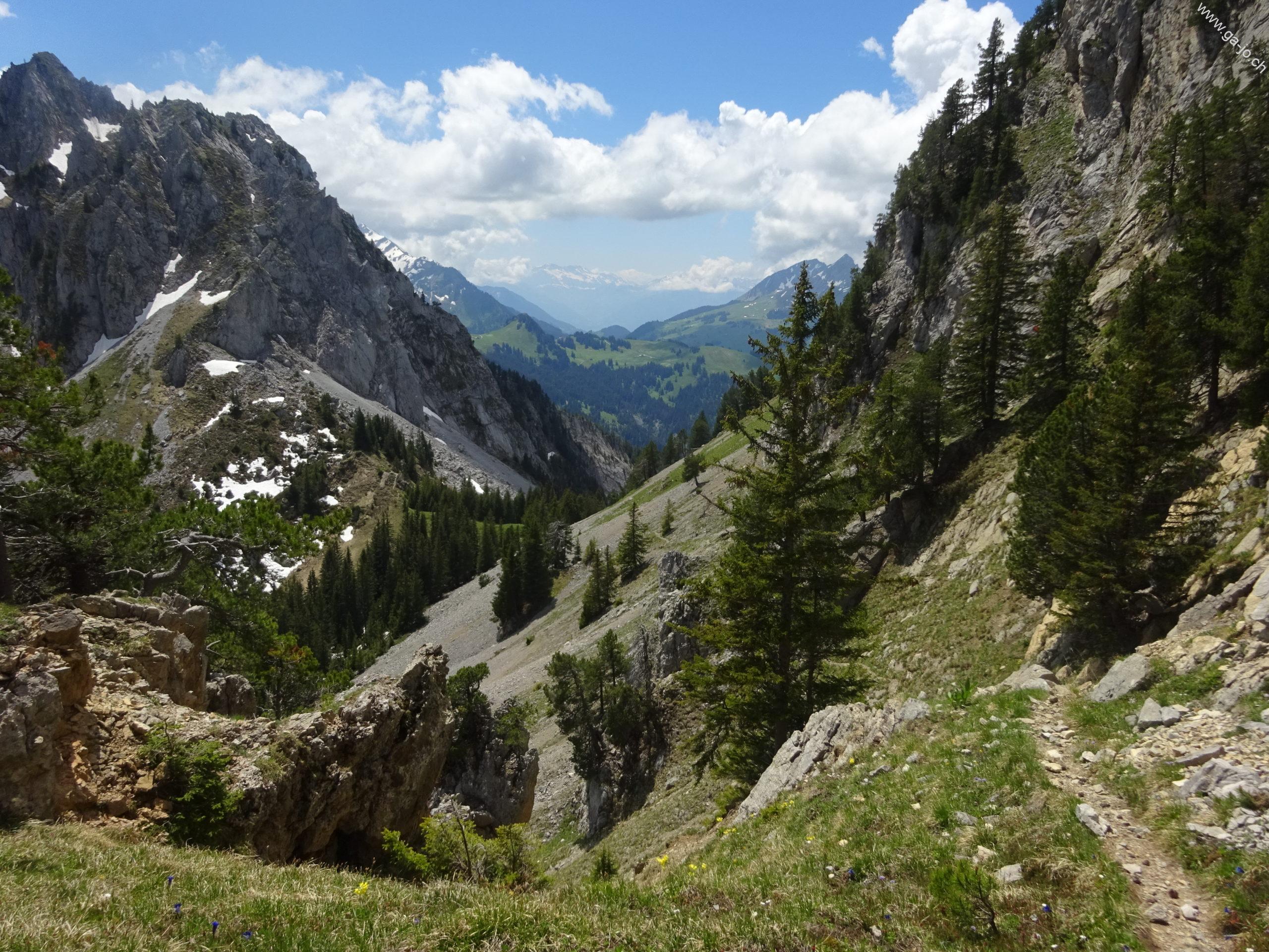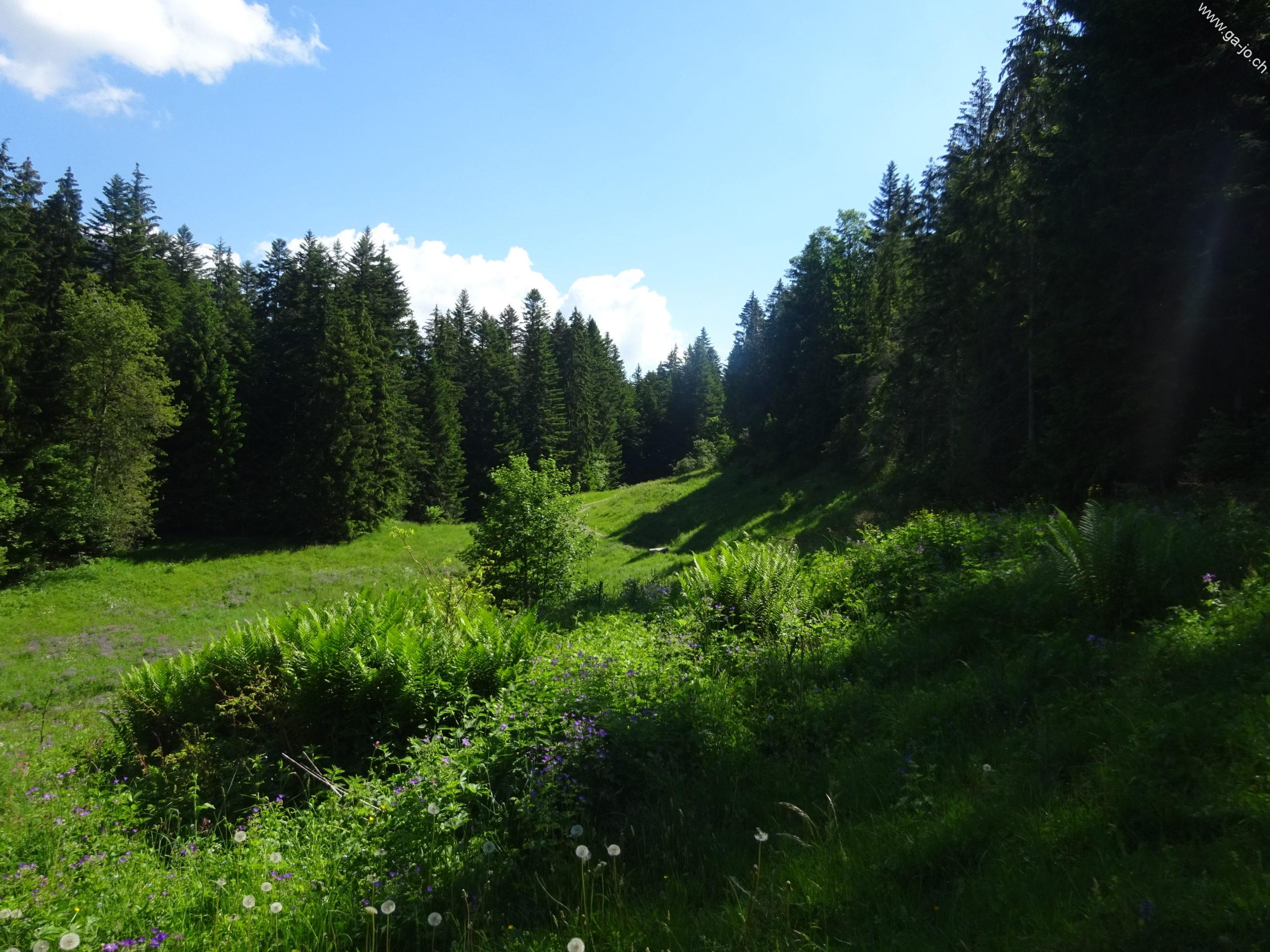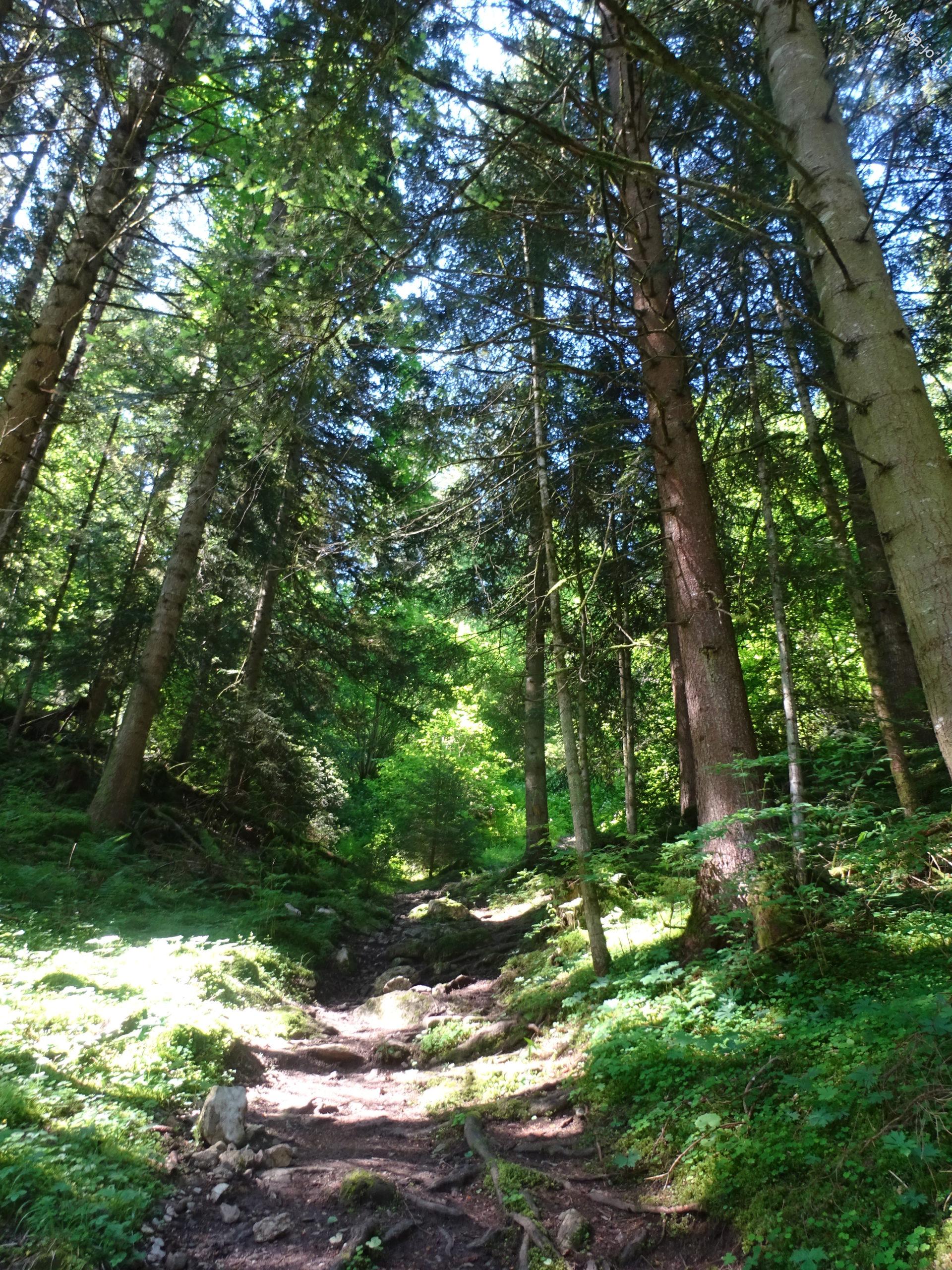 Une fois la rivière traversée, le chemin se sépare en trois il faut continuer tout droit en direction S et surtout ne pas suivre les indications pour le Rocher du Midi, dont le balisage à ce stade nous ferait passer par le Col de Base. On sort assez rapidement de la forêt et commençons à prendre de la hauteur. La suite est un mélange de forêts et pâturages jusqu’à l’arrivé du téléphérique hors service Pra-Perron.