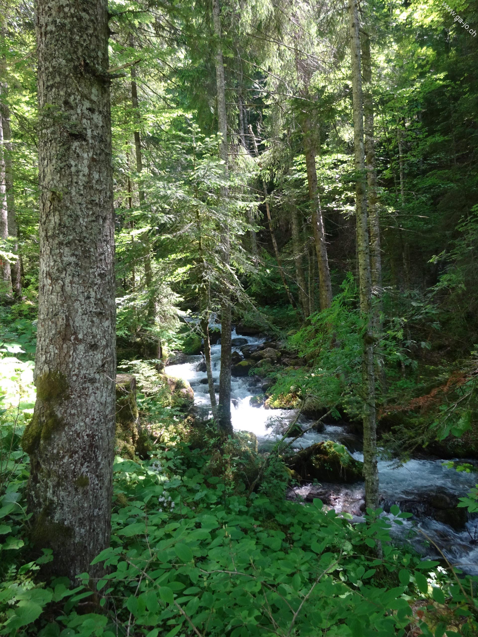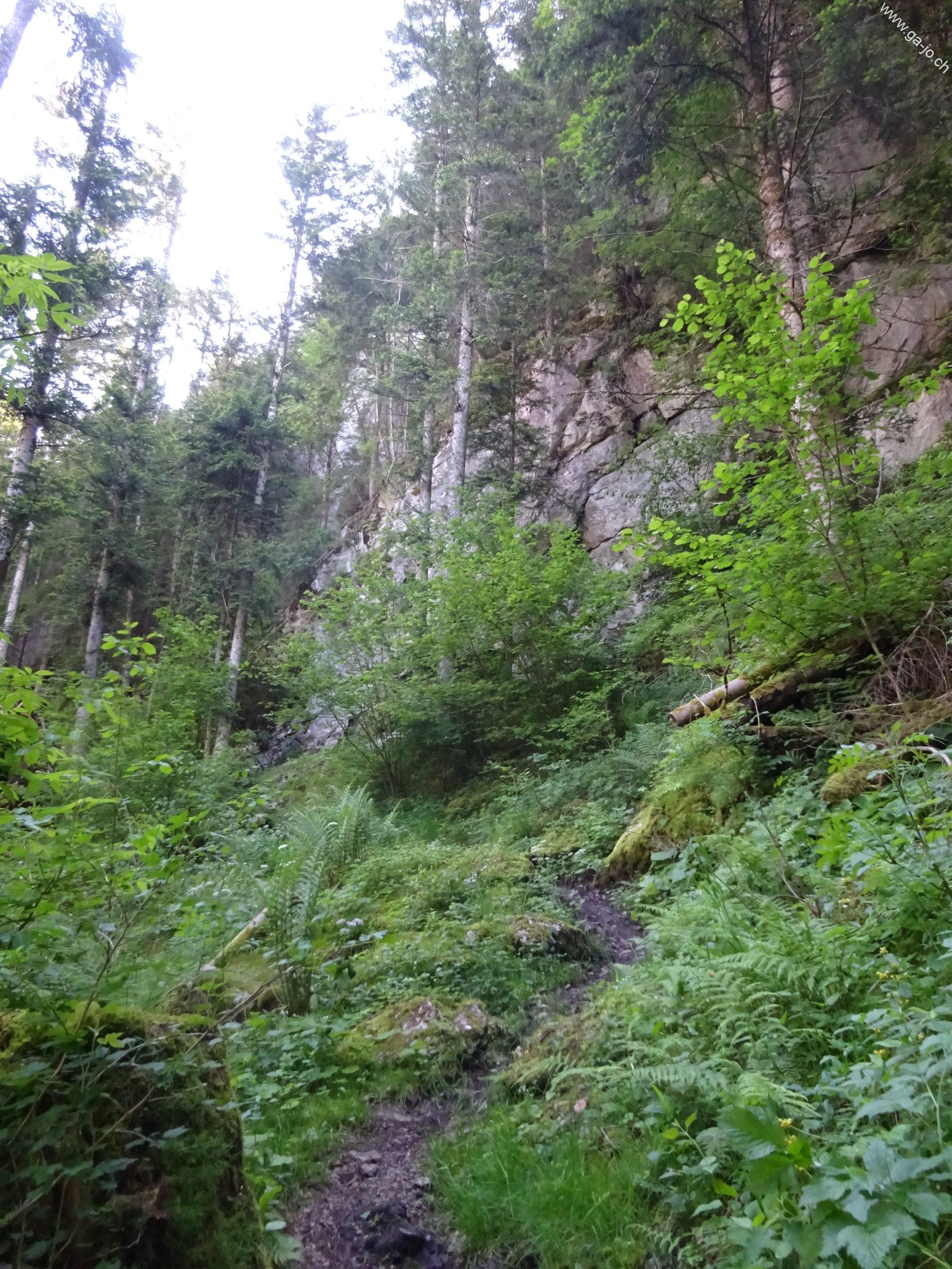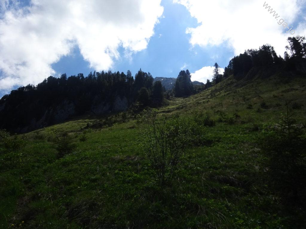 Une fois la rivière traversée, le chemin se sépare en trois il faut continuer tout droit en direction S et surtout ne pas suivre les indications pour le Rocher du Midi, dont le balisage à ce stade nous ferait passer par le Col de Base. On sort assez rapidement de la forêt et commençons à prendre de la hauteur. La suite est un mélange de forêts et pâturages jusqu’à l’arrivé du téléphérique hors service Pra-Perron.