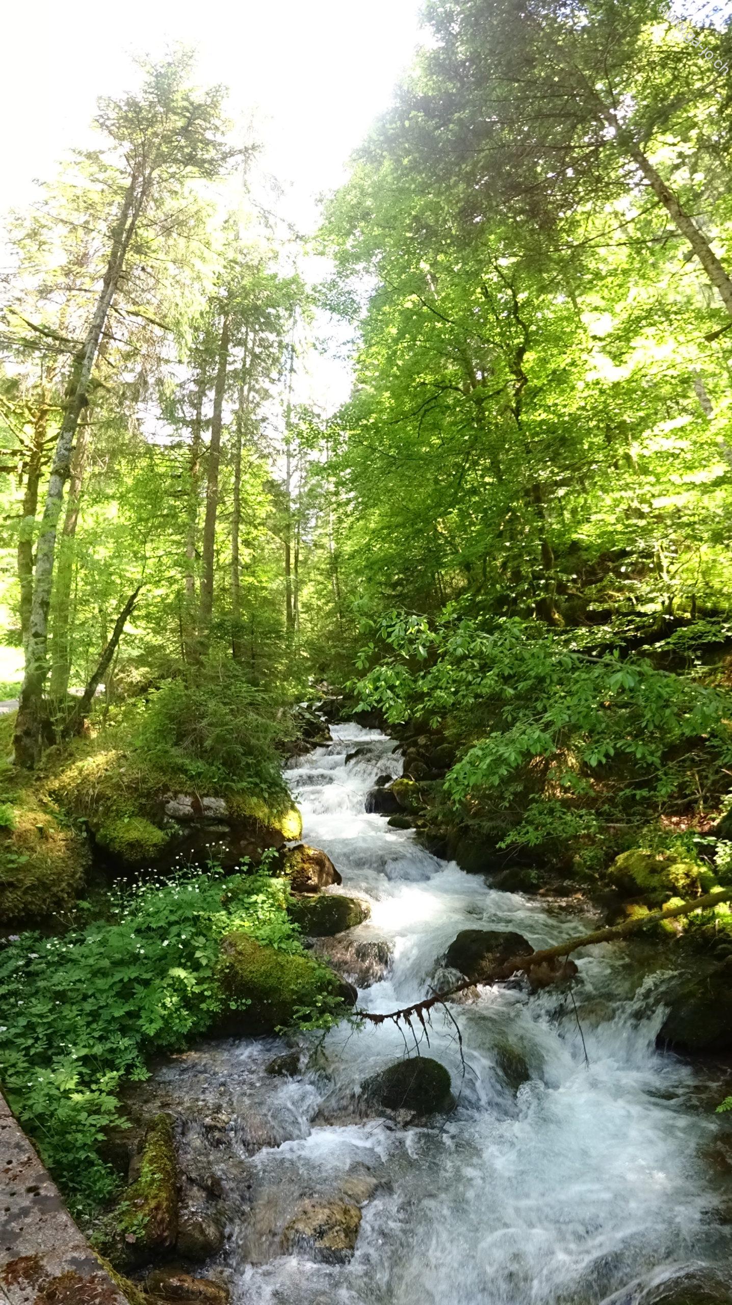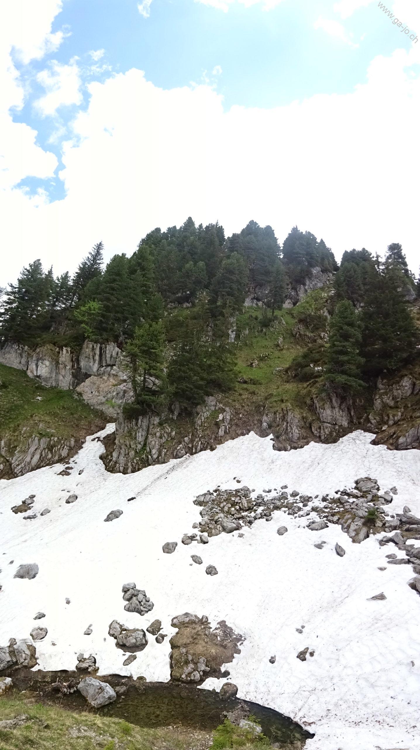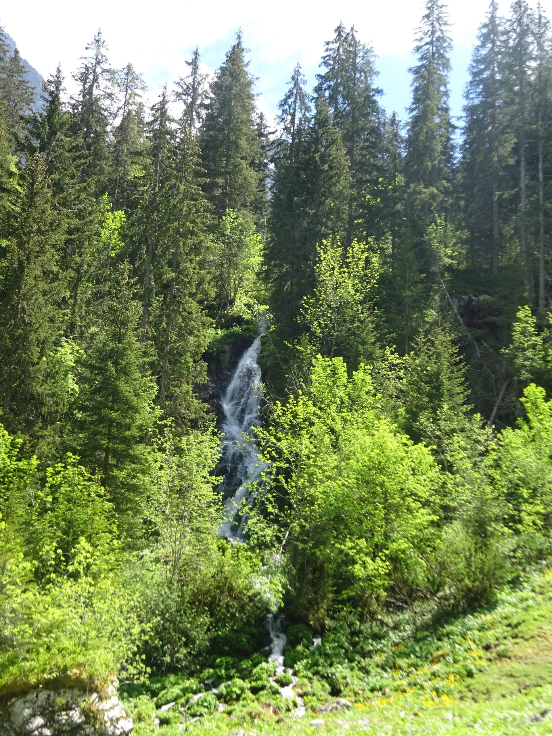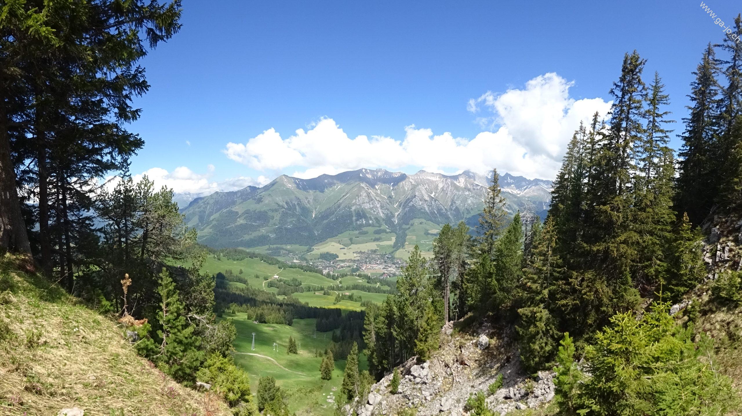Une fois la rivière traversée, le chemin se sépare en trois il faut continuer tout droit en direction S et surtout ne pas suivre les indications pour le Rocher du Midi, dont le balisage à ce stade nous ferait passer par le Col de Base. On sort assez rapidement de la forêt et commençons à prendre de la hauteur. La suite est un mélange de forêts et pâturages jusqu’à l’arrivé du téléphérique hors service Pra-Perron.