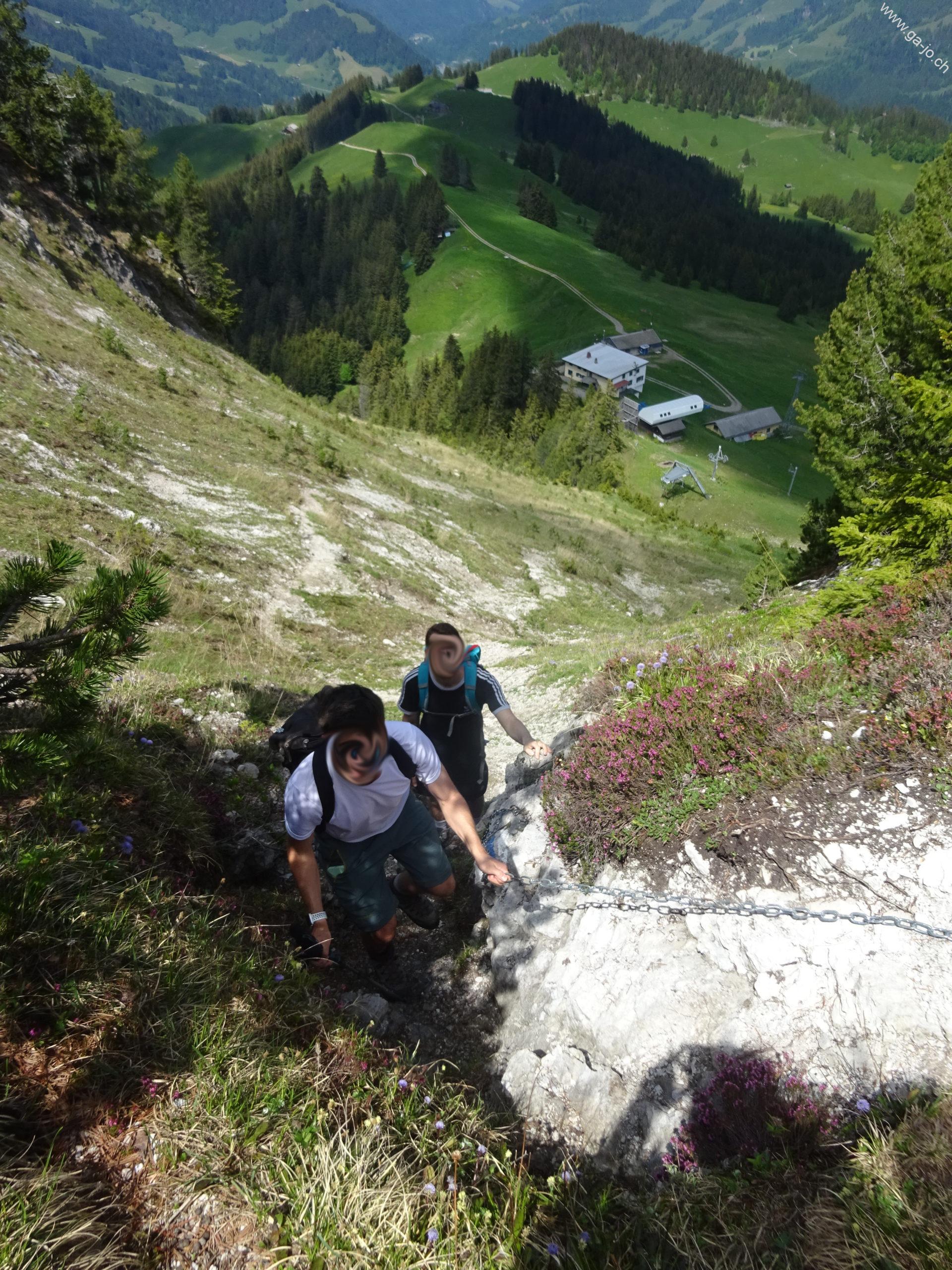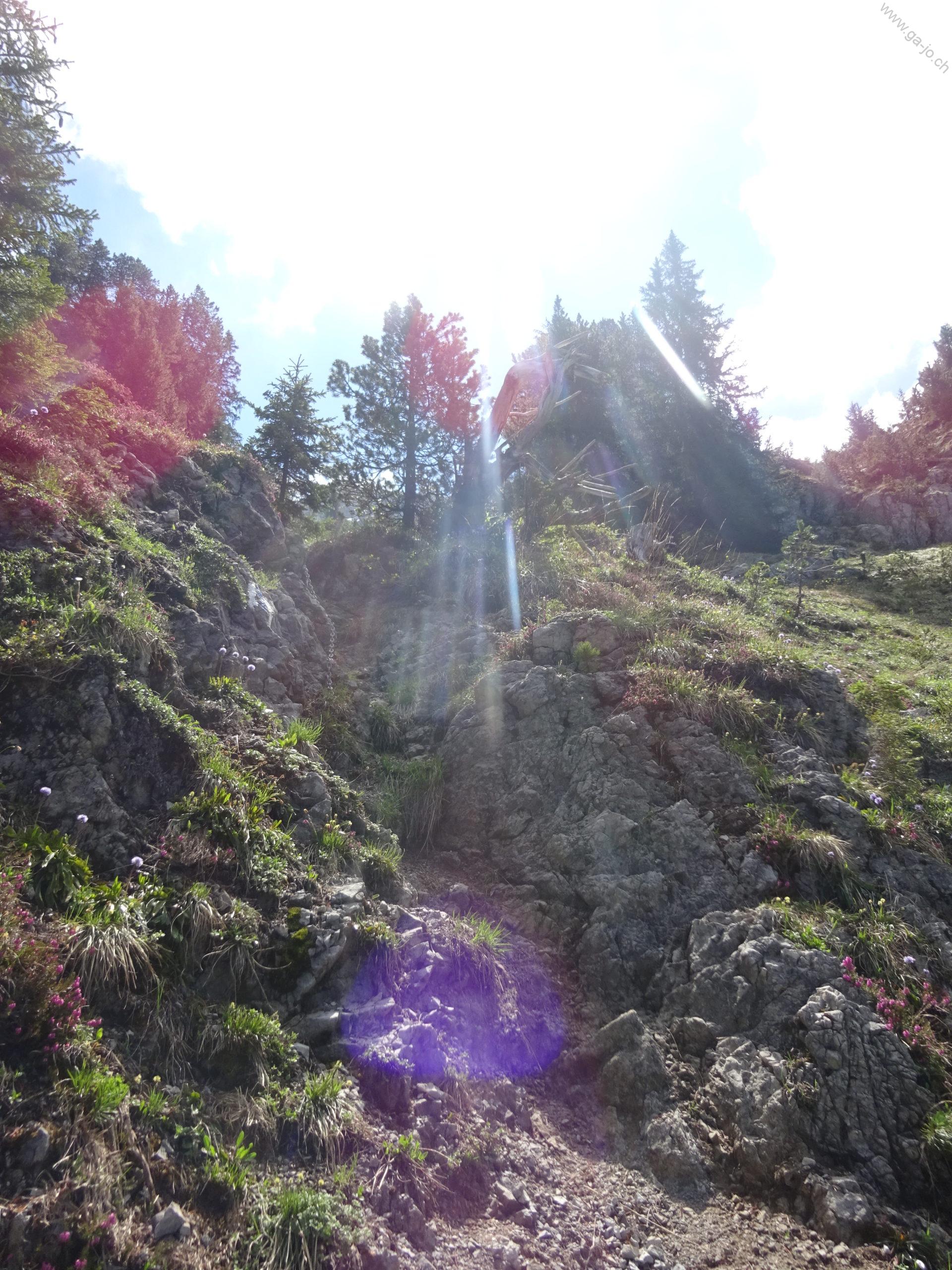 Ce sentier du versant nord est vraiment une réussite ; le balisage est très bon et les aménagements judicieusement placés aux endroits exposés. Un pieds sûr et l’absence de vertige sont néanmoins des prérequis essentiels, certains passages pouvant être impressionnants. Au delà de la difficulté physique (la pente est assez prononcée, on prend rapidement de la hauteur, mais chacun peut adapter son rythme) certains passage demandent quelques pas d’escalade facile sans être dangereux pour autant alors que d’autres sont très exposés mais simple à franchir avec le plus souvent un câble ou une chaîne pour se tenir. Bien évidement tout cela sur un sentier sec ; par temps pluvieux ou juste après la pluie, je ne me risquerais probablement pas.