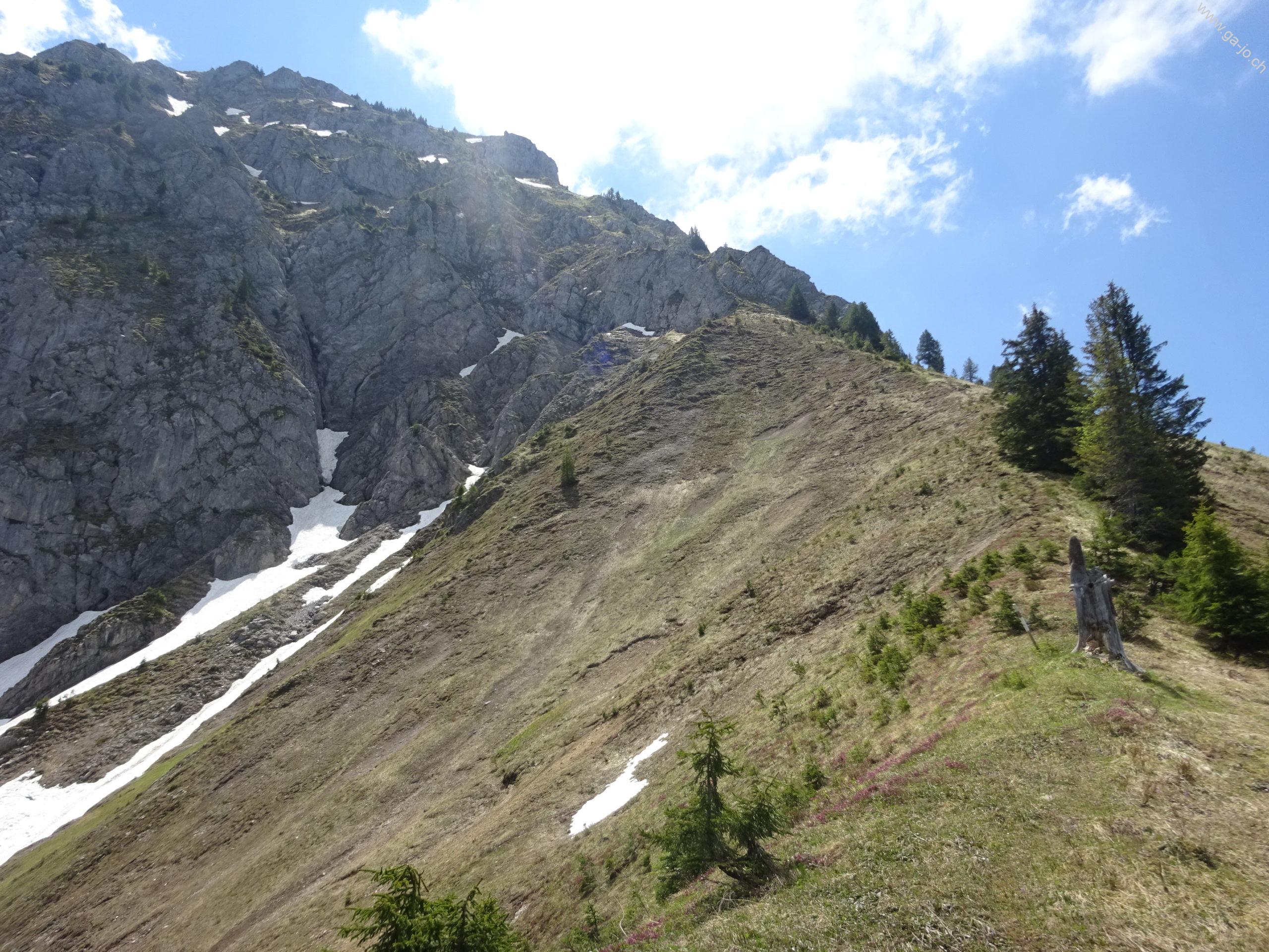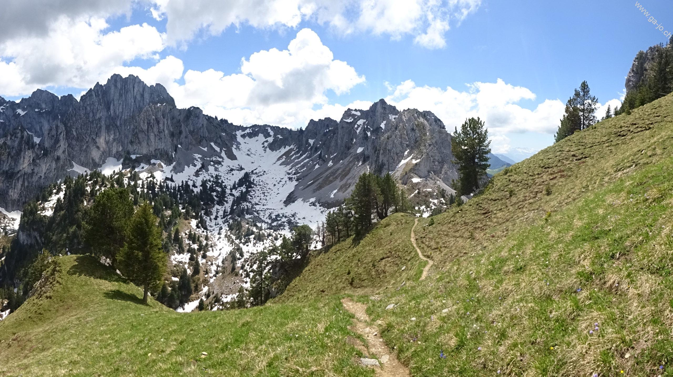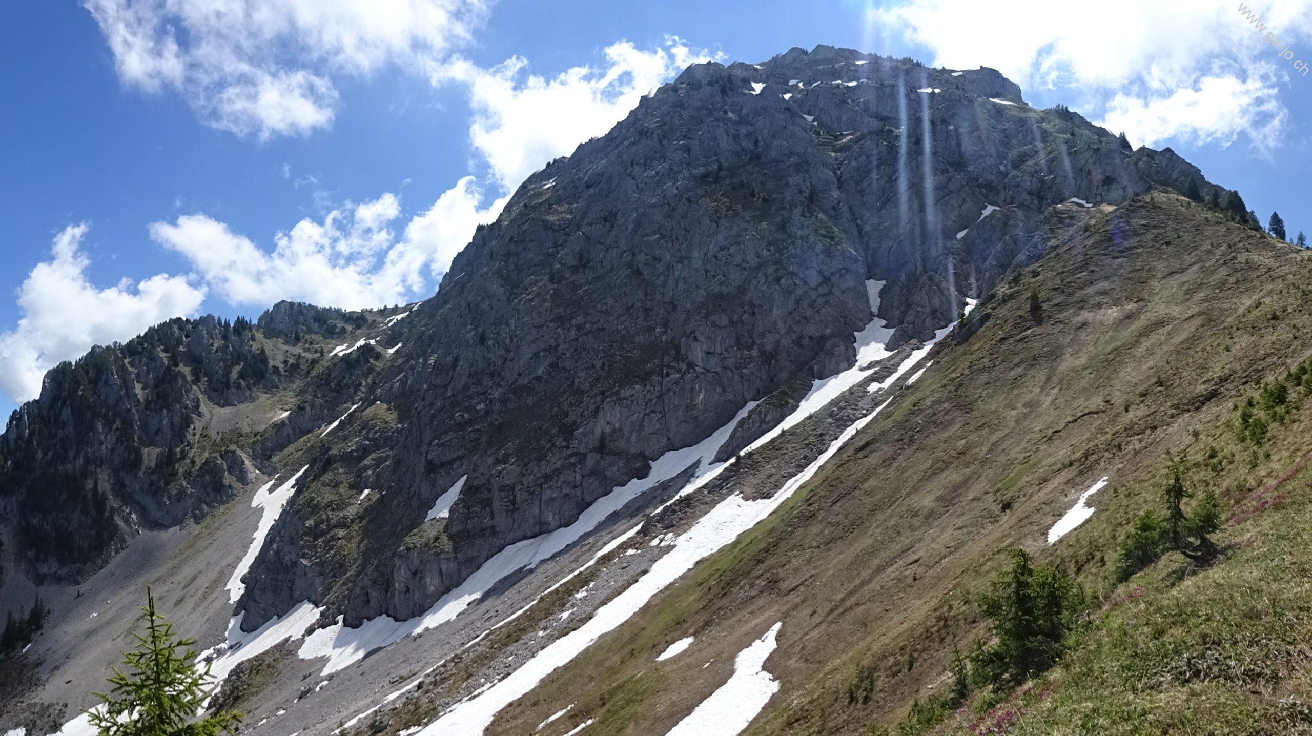 A ce stade, on suit toujours les indications pour La Montagnette / La Braye, le chemin le plus direct est le sentier de randonnée de montagne (blanc-rouge-blanc) qui commence par longer le ruisseau avant de rejoindre la route d’alpage. En face de nous apparaît de nouveau le sommet du Rocher du Midi et sa face nord. On peine à ce stade à déterminer où passe exactement le chemin.