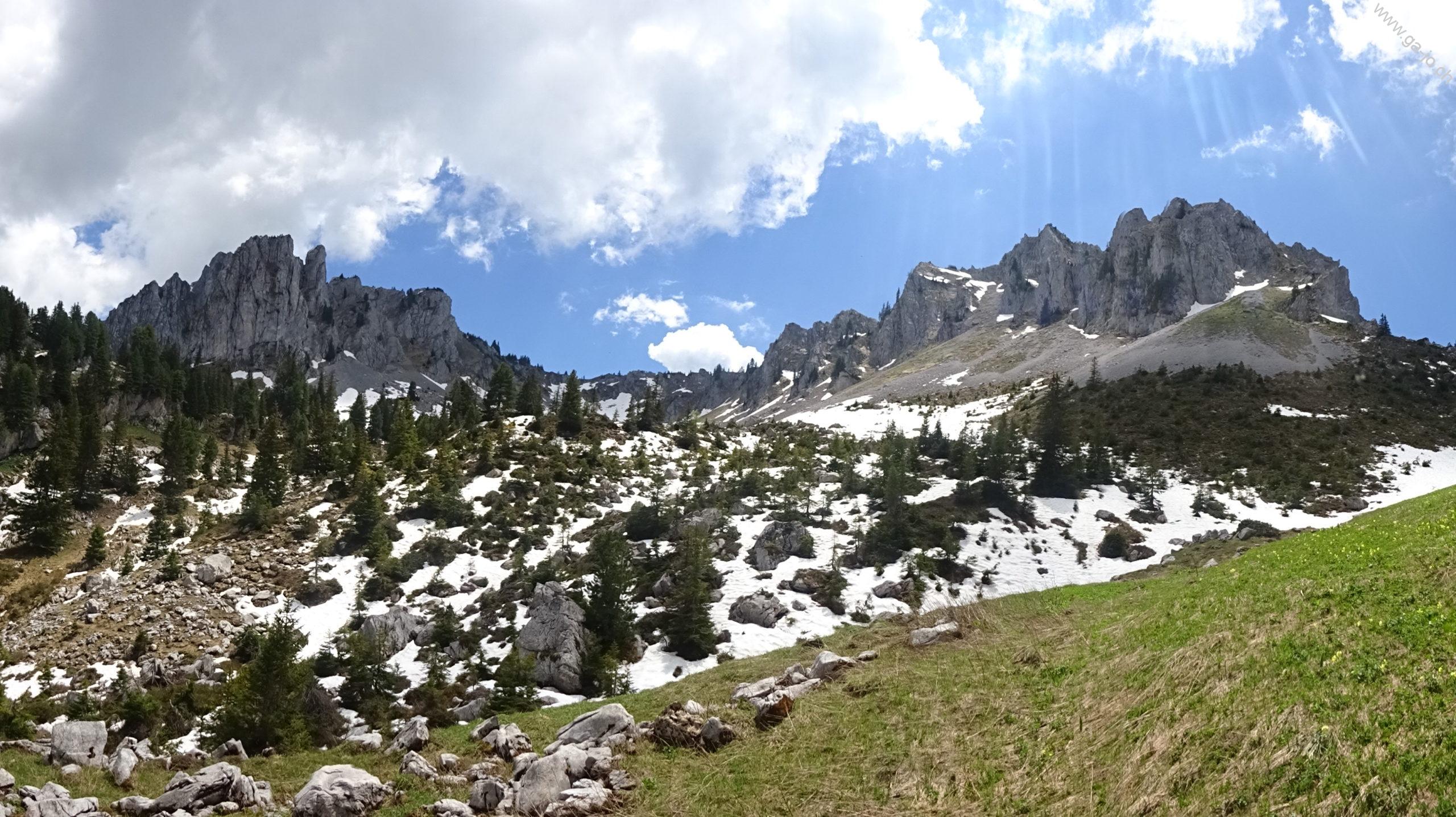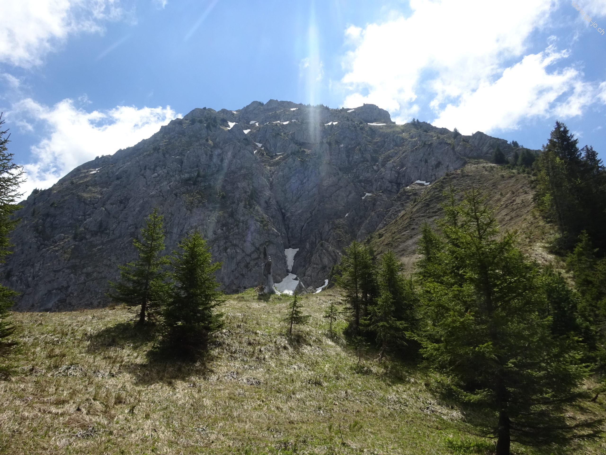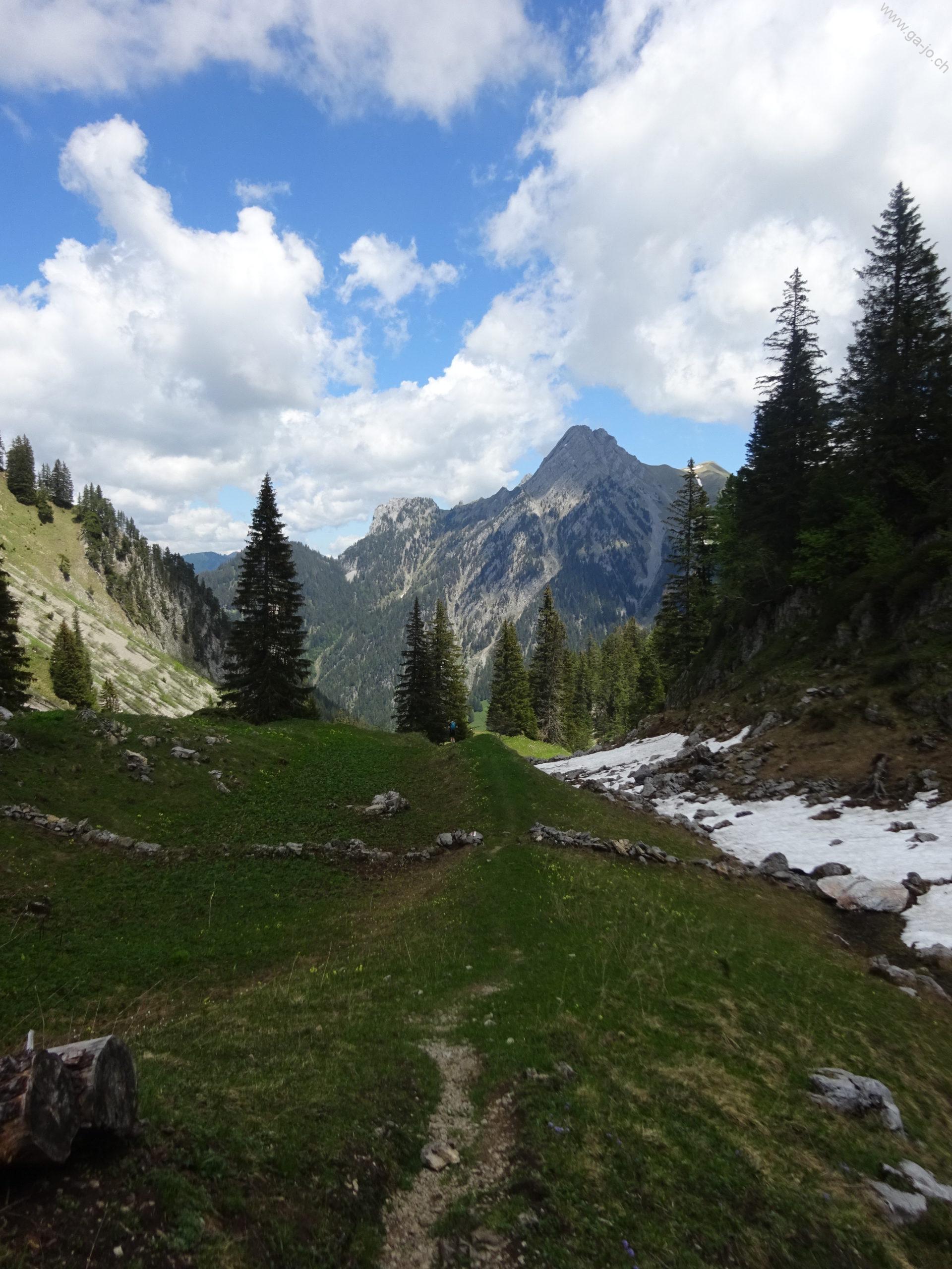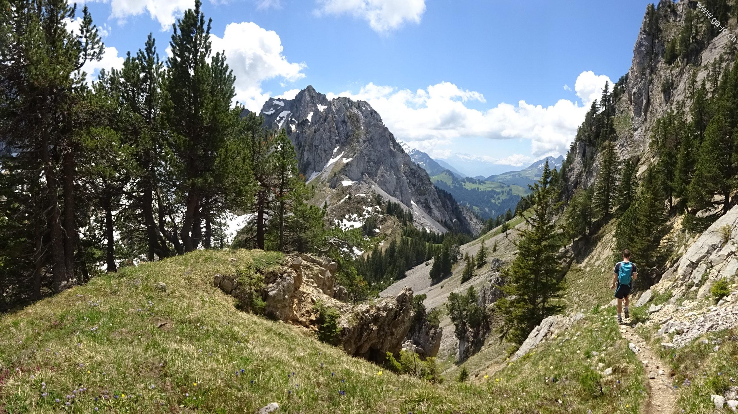 A ce stade, on suit toujours les indications pour La Montagnette / La Braye, le chemin le plus direct est le sentier de randonnée de montagne (blanc-rouge-blanc) qui commence par longer le ruisseau avant de rejoindre la route d’alpage. En face de nous apparaît de nouveau le sommet du Rocher du Midi et sa face nord. On peine à ce stade à déterminer où passe exactement le chemin.