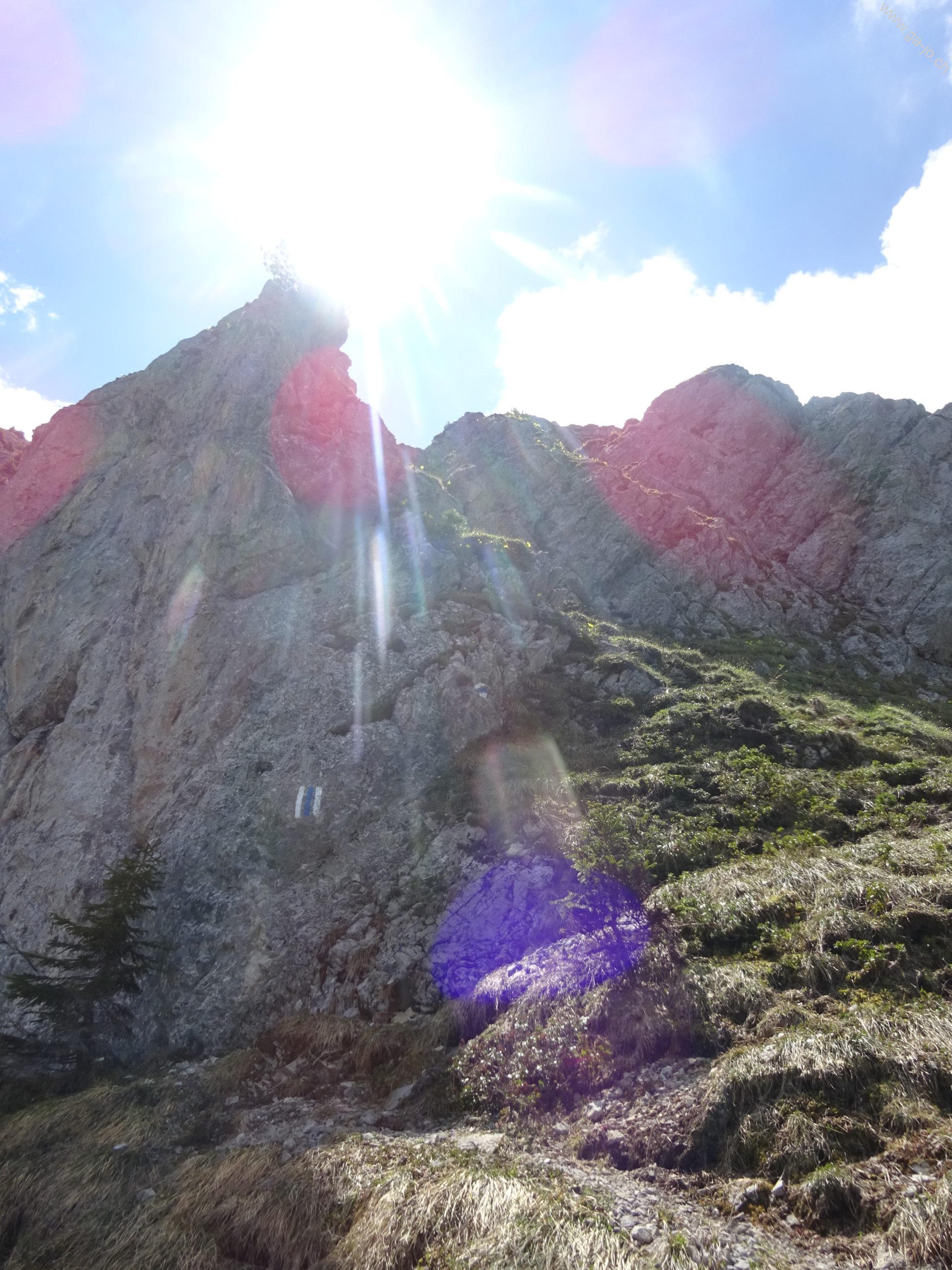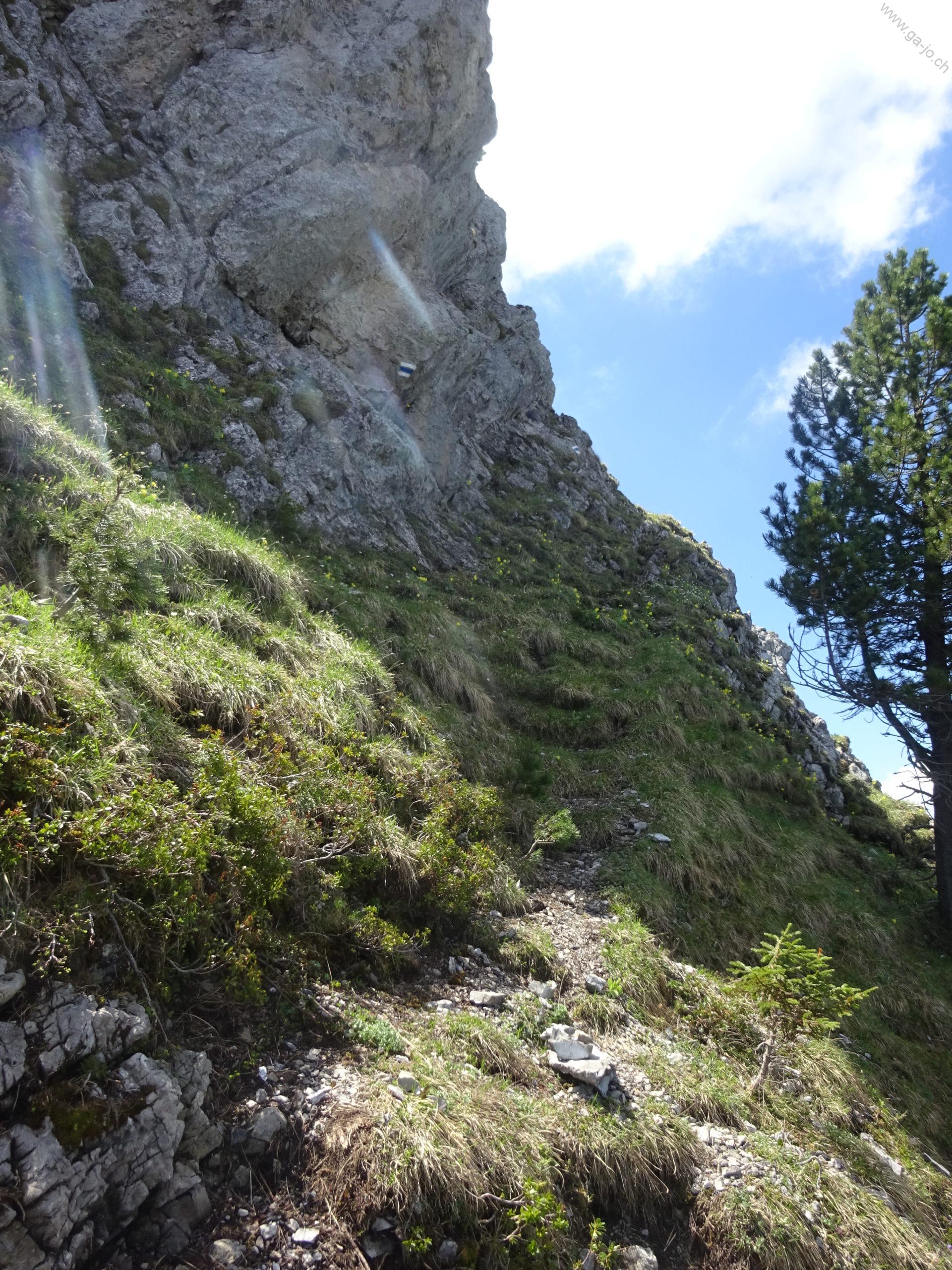 Une fois à la montagnette les panneaux blanc-bleu-blanc pour le Rocher du Midi et leur plaquette d’informations apparaissent. Le sentier commence l’ascension et bifurque juste derrière les installations de ski et monte d’abord en faisant de nombreuses vires dans la pente herbeuse et caillouteuse. Par temps sec et non boueux, cela ne pose aucun soucis si ce n’est de tenir le rythme. On arrive à à la première barre rocheuse qui se franchit aisément par un passage équipé d’un câble.