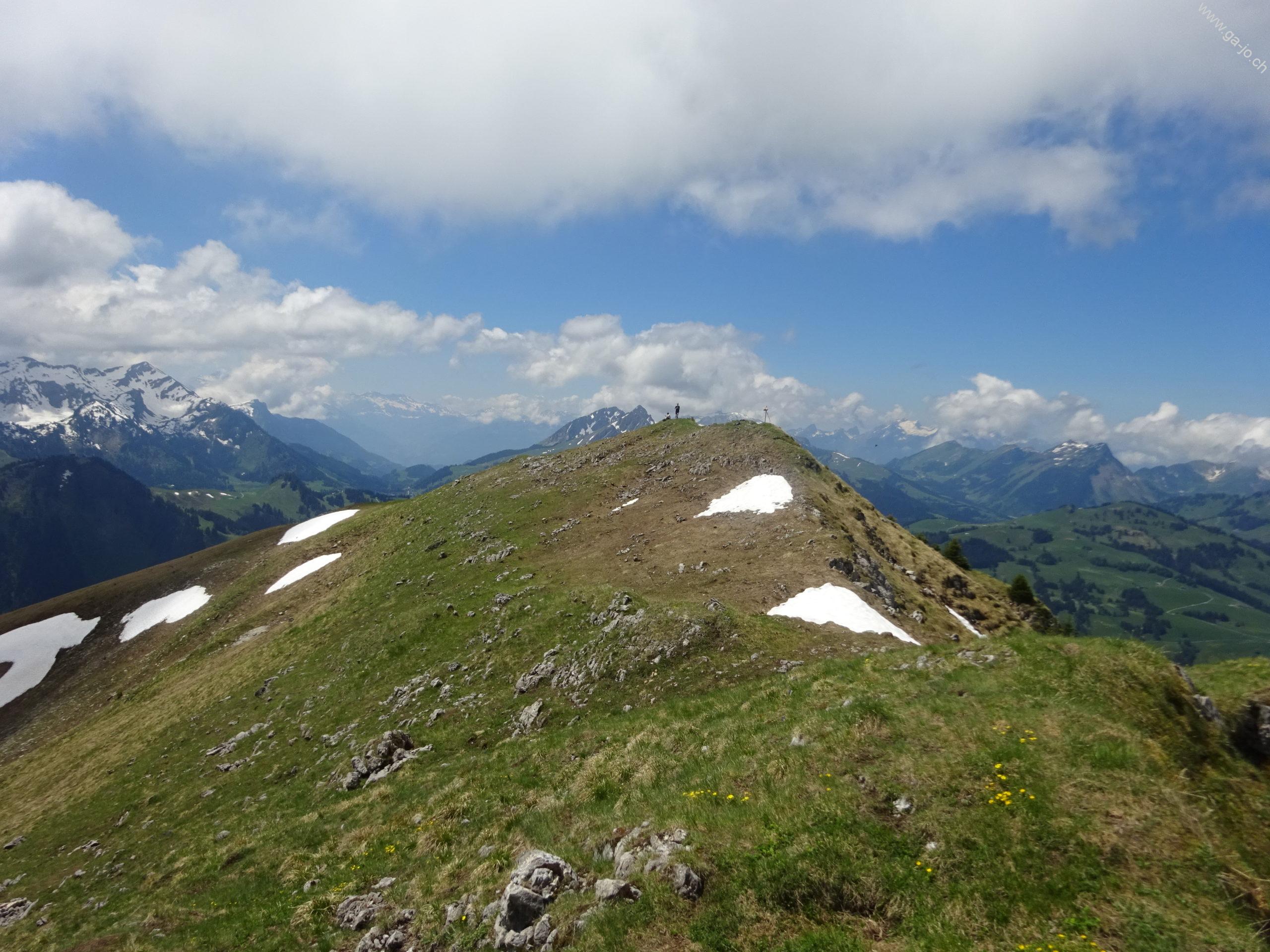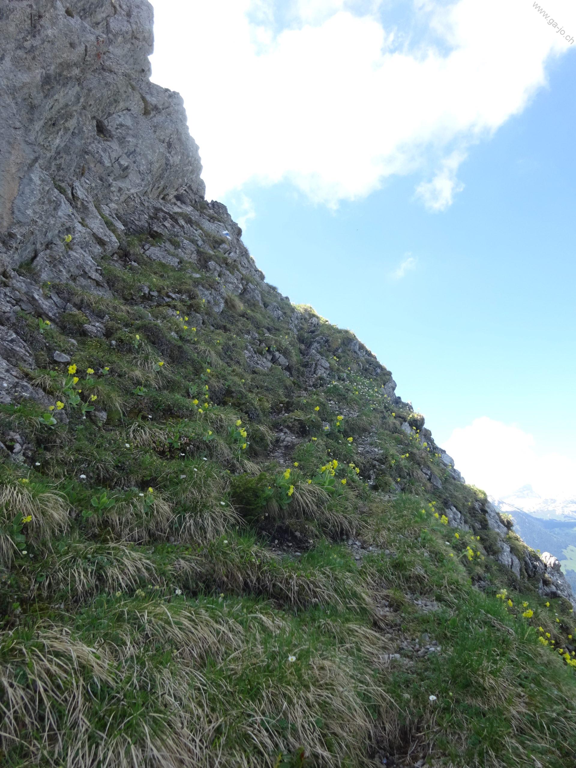 La suite se compose de nombreuse vires entre herbe, caillasse et rochers avec parfois quelques passage d’escalade facile, ces derniers n’étant jamais vraiment exposés. On y traverse le seul petit névé (heureusement) de l’ascension et nous arrivons finalement au sommet… sans trop de photos car on doit quand même parfois mettre les mains pour se tenir, et rester attentifs où on met les pieds.