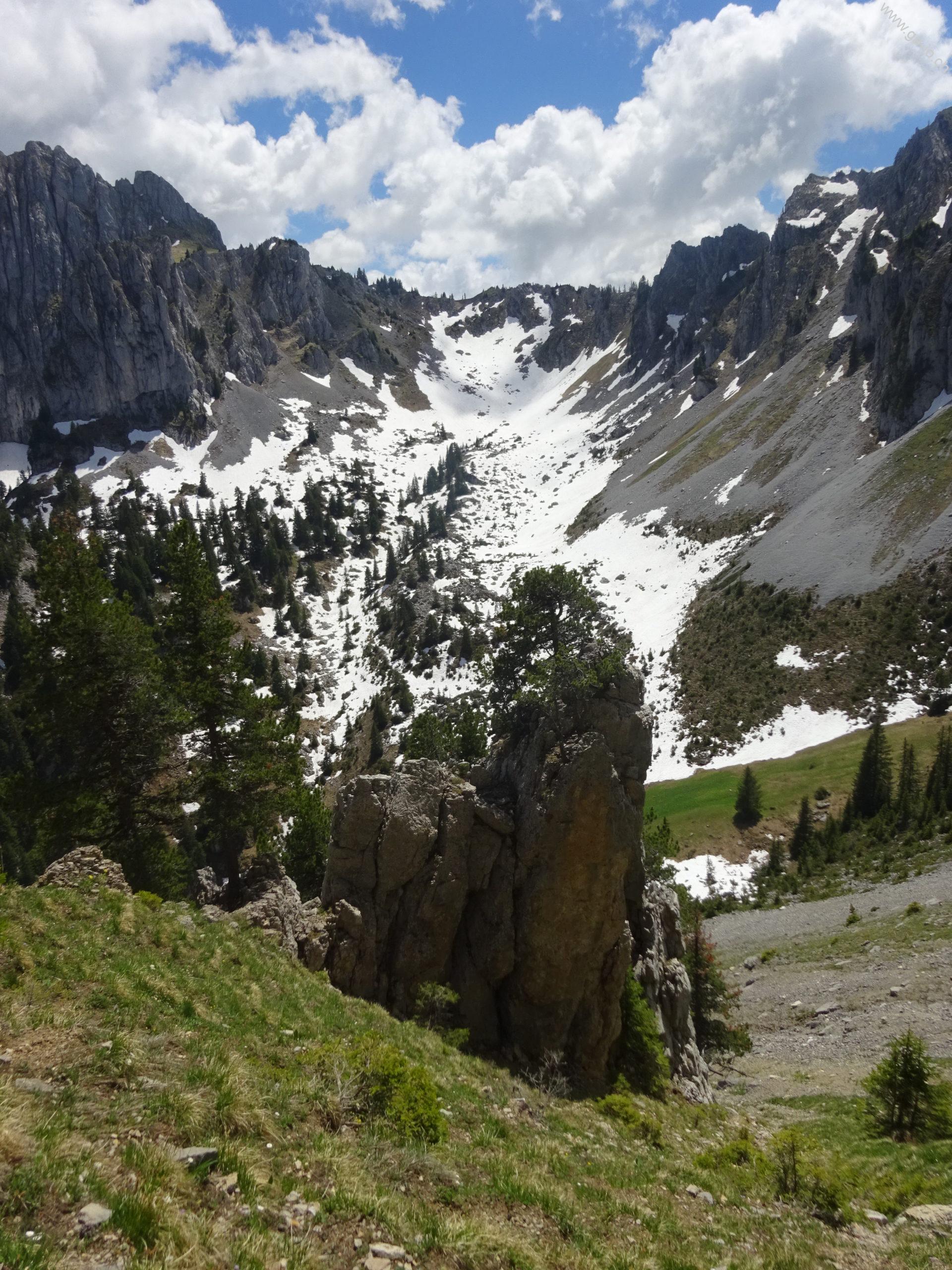 La descente se fait par le versant sud en suivant tout d’abord l’arête large SO, puis à flanc de coteau jusqu’au Col de Base. Le chemin est mine de rien assez caillouteux mais ne pose pas plus de problème que ça par temps sec.
