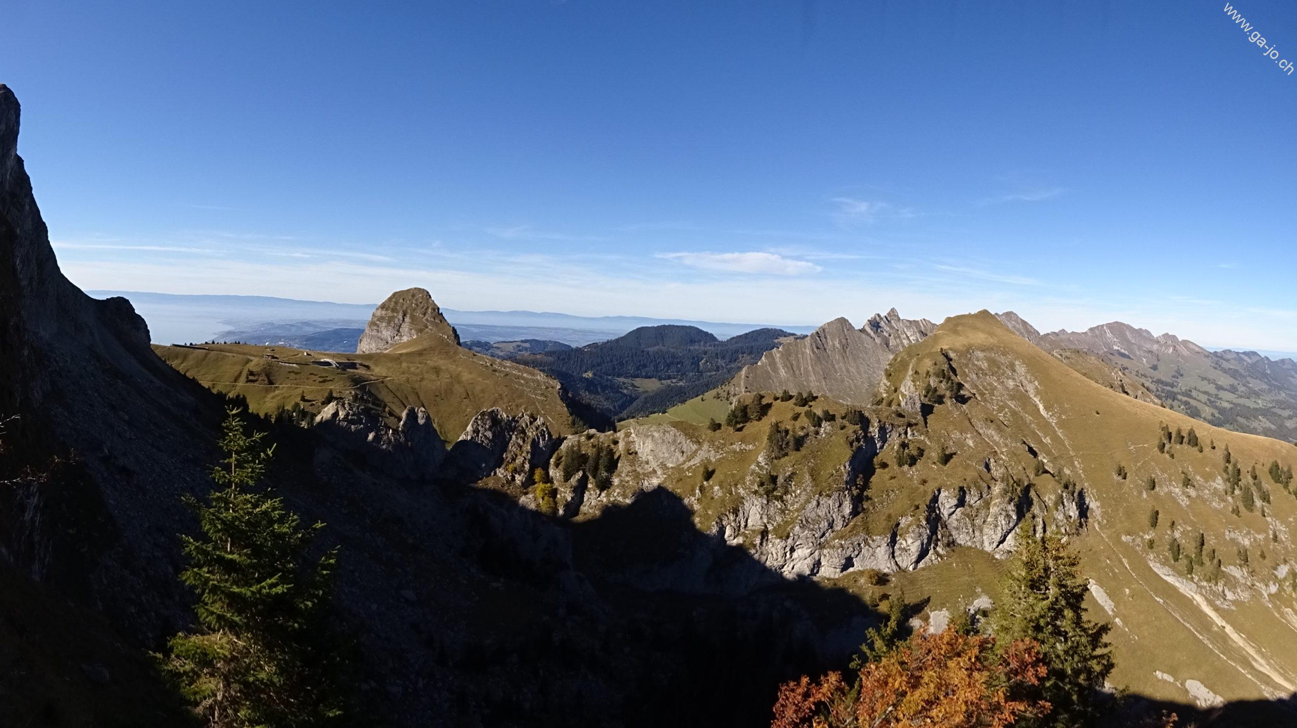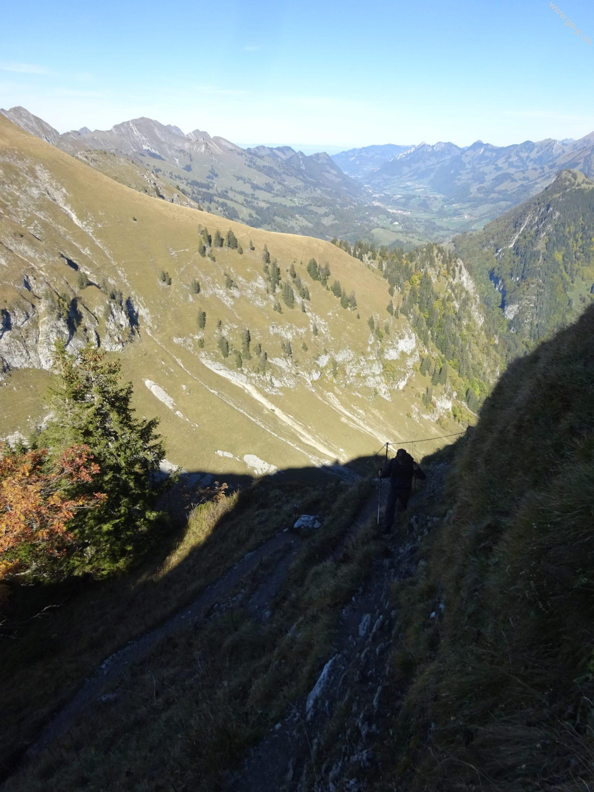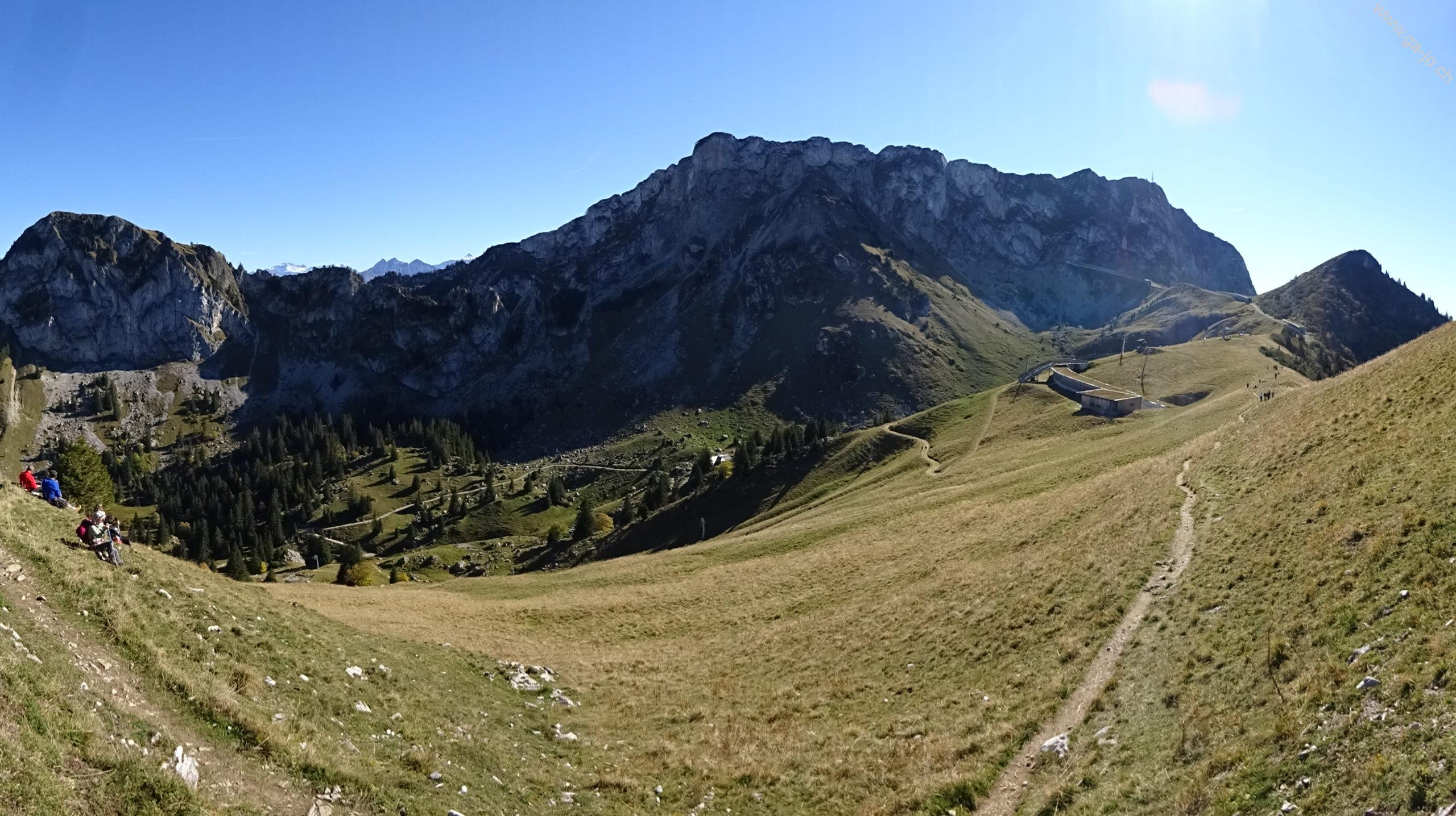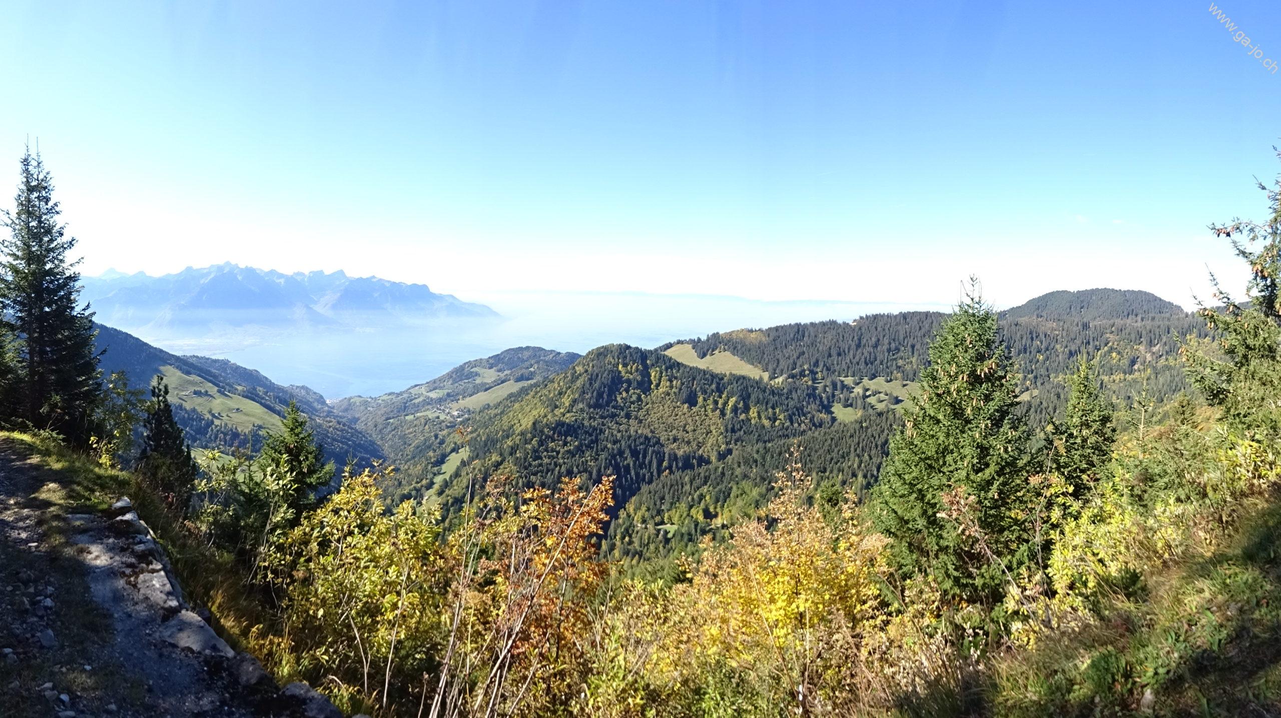Arrivés au col, on va quitter le panarama de la vallée de l’Intyamon pour celui du Léman. On suit alors le sentier en direction du col de Jaman, en traversée descendante sur le flanc ouest de la Cape au Moine.