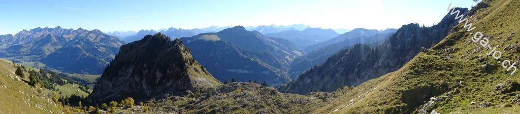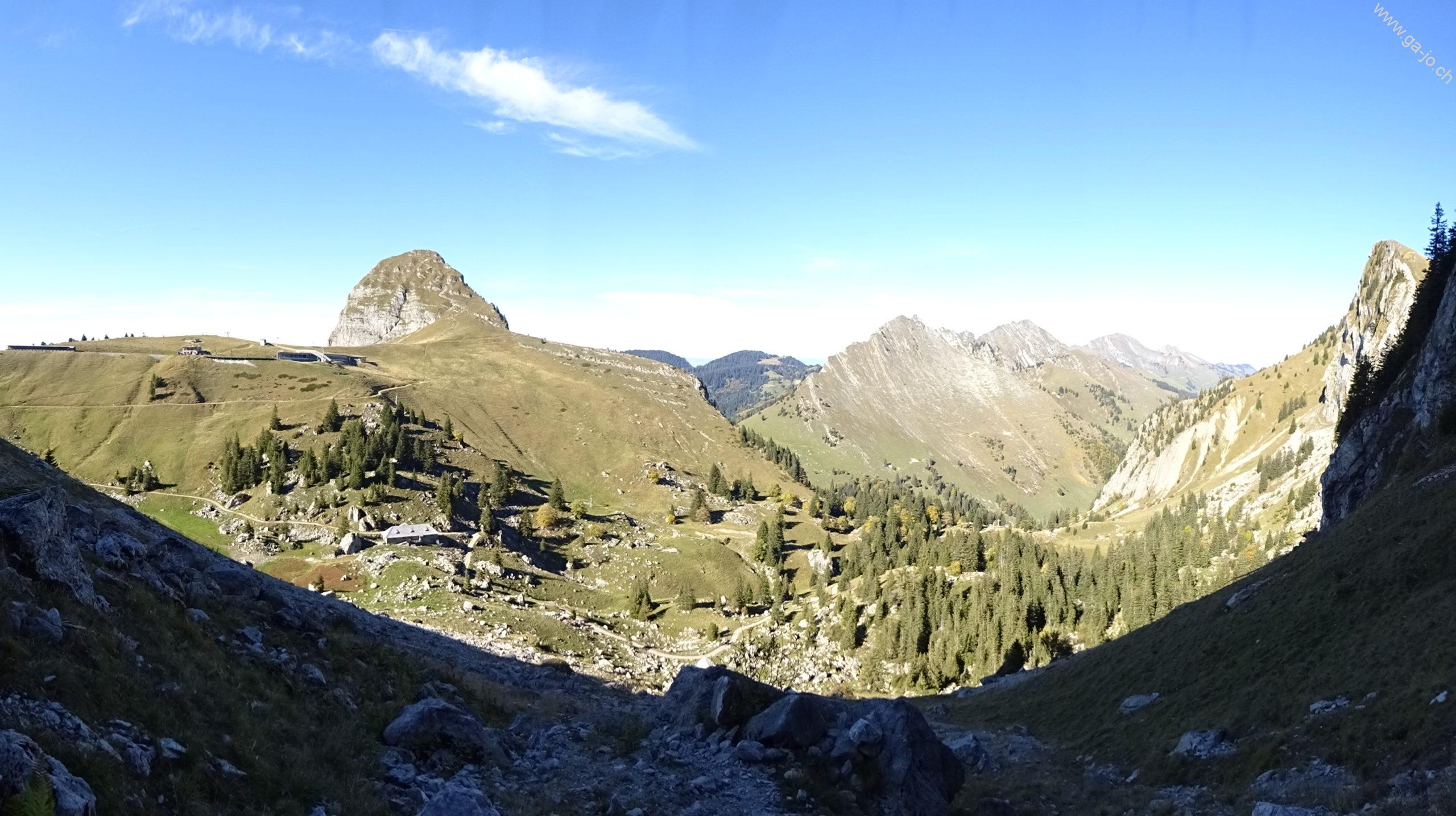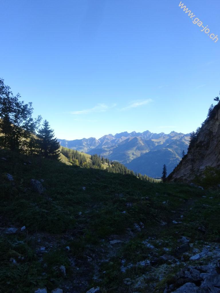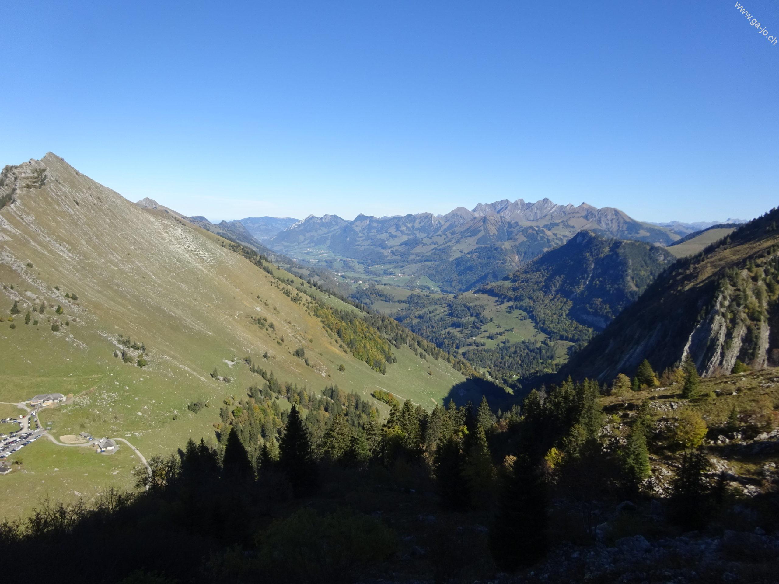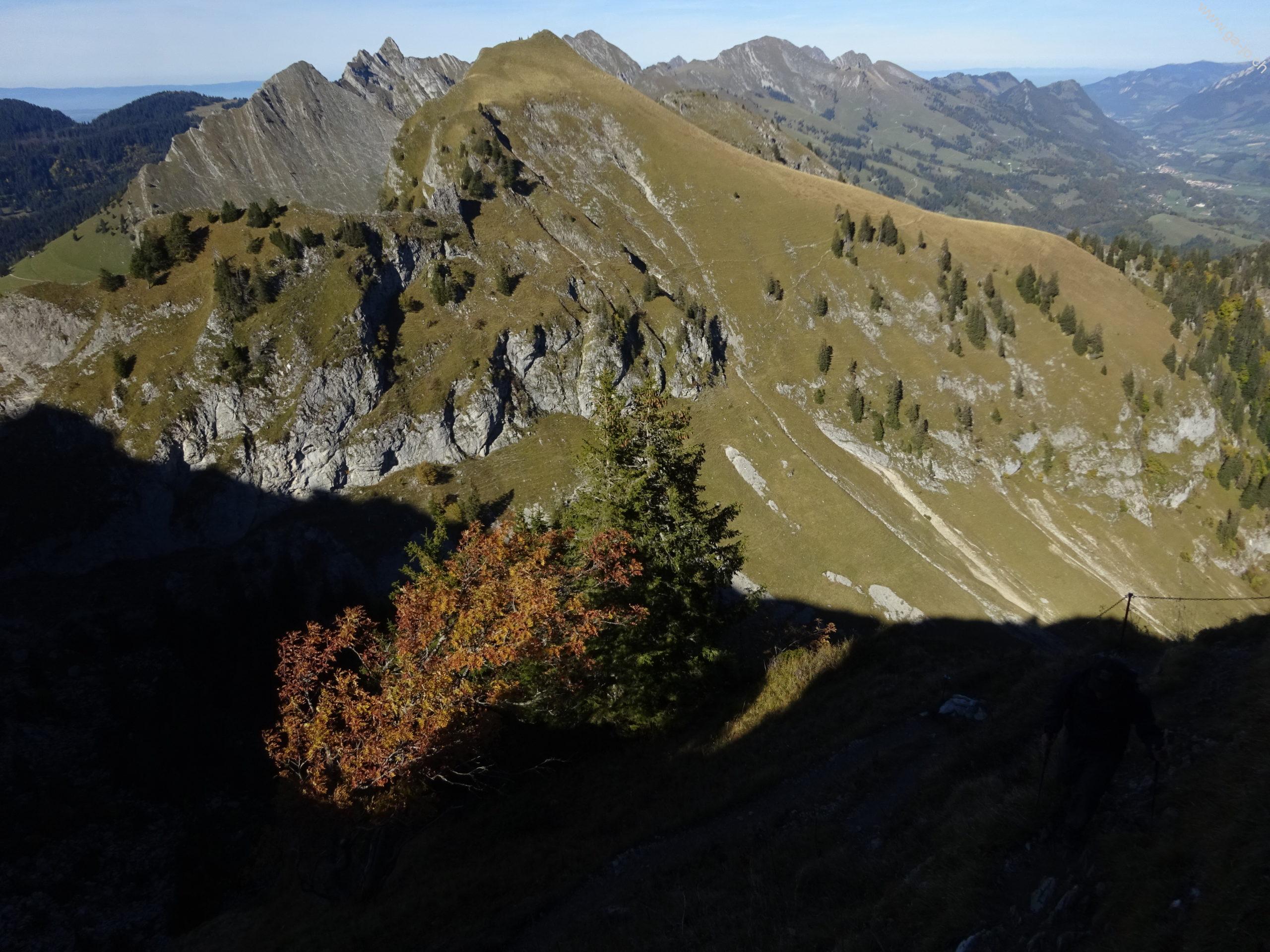 Arrivés au col, on va quitter le panarama de la vallée de l’Intyamon pour celui du Léman. On suit alors le sentier en direction du col de Jaman, en traversée descendante sur le flanc ouest de la Cape au Moine.