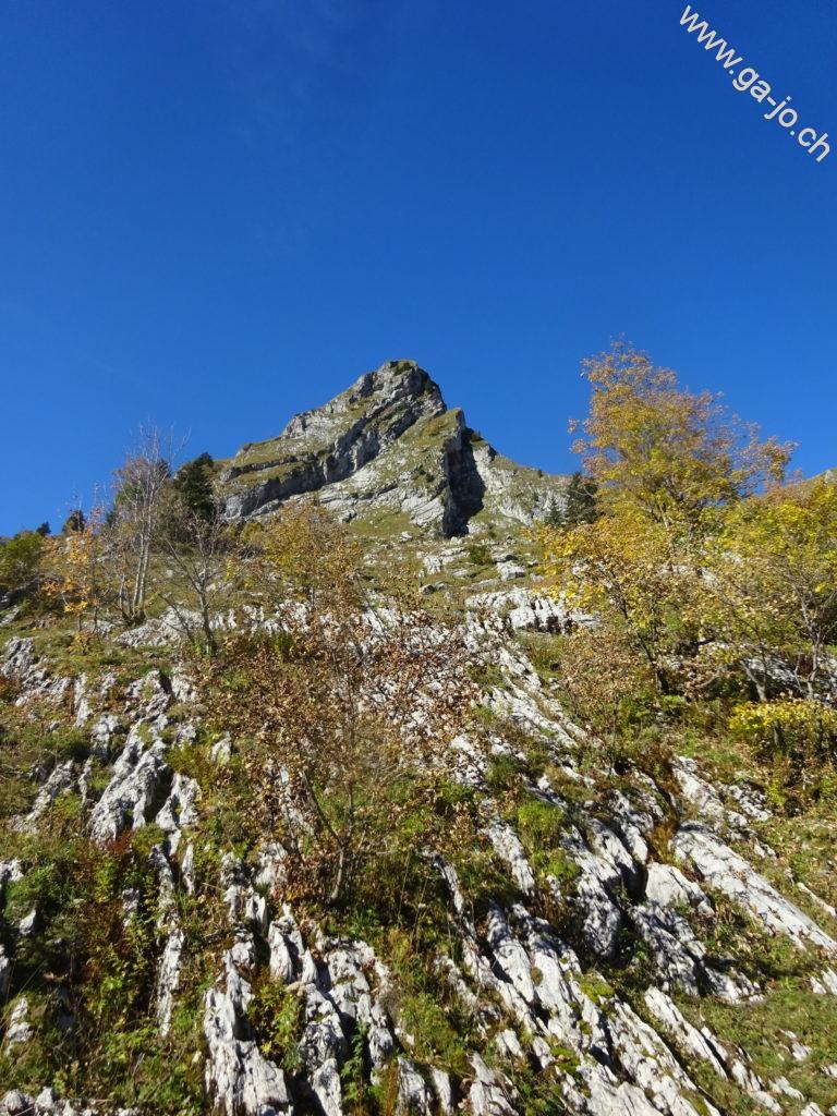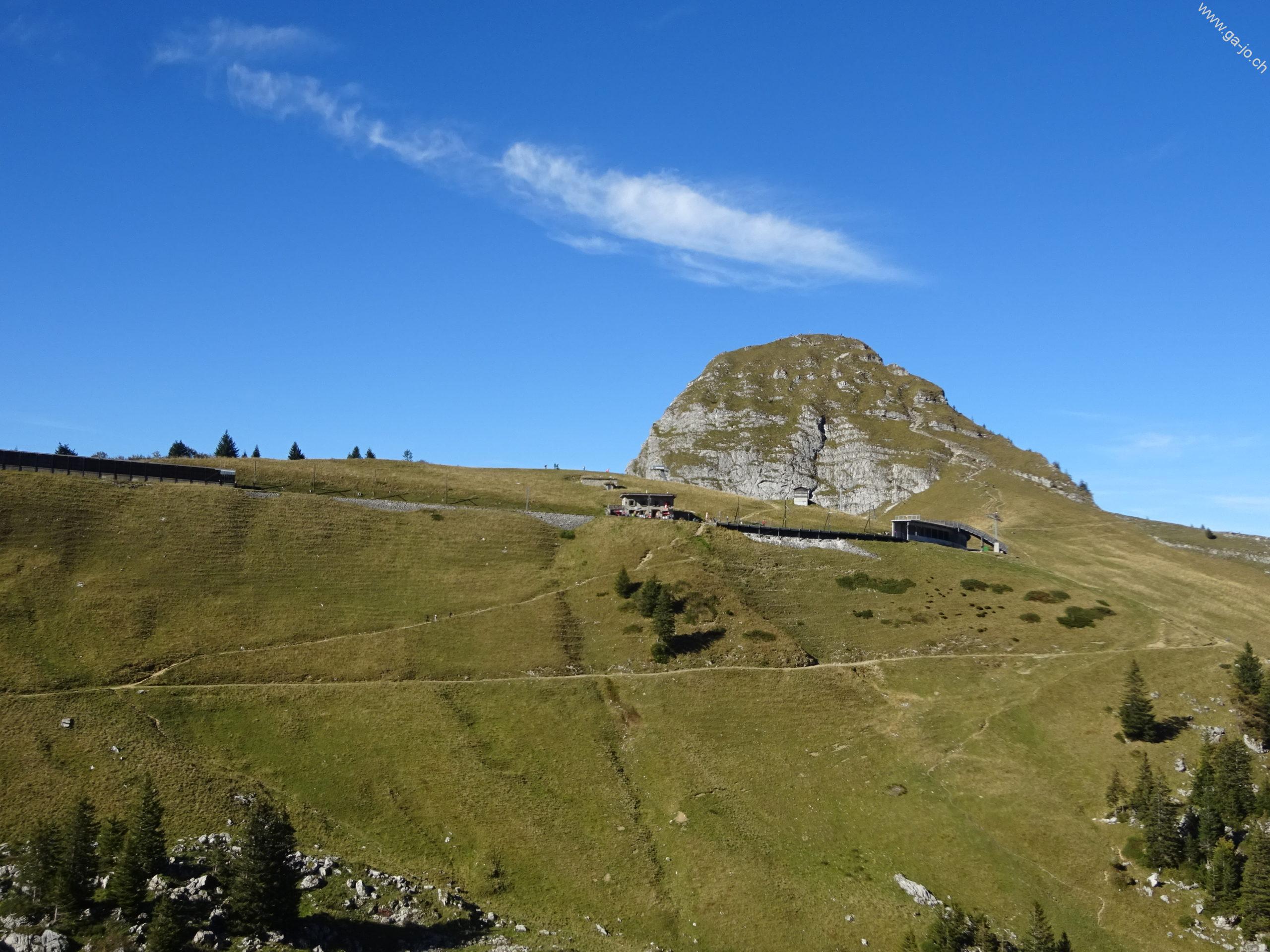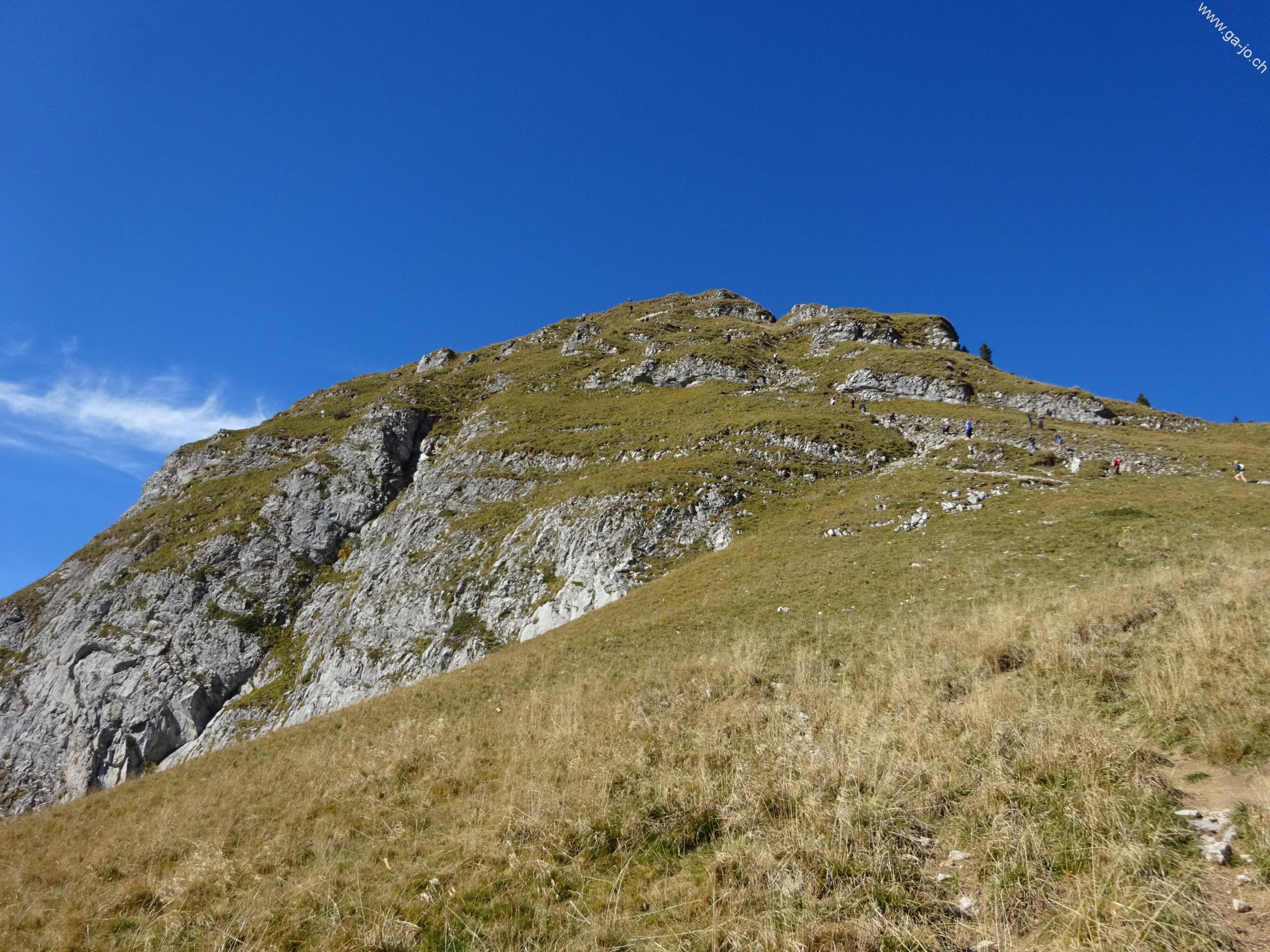 Une fois au col de Jaman, il s’agit de suivre le sentier non balisé mais très fréquenté qui monte sur petite crête, au bout du parking. L’idée est de rester sur le versant NE de la dent afin de rejoindre le pt. 1759. De là, la montée de la dent est assez évidente, bien que pas balisée. C’est une sommet ultra fréquenté grâce (ou à cause, c’est selon) de l’accès en train au pieds de la montée.