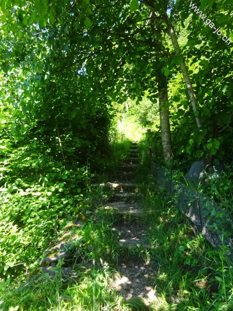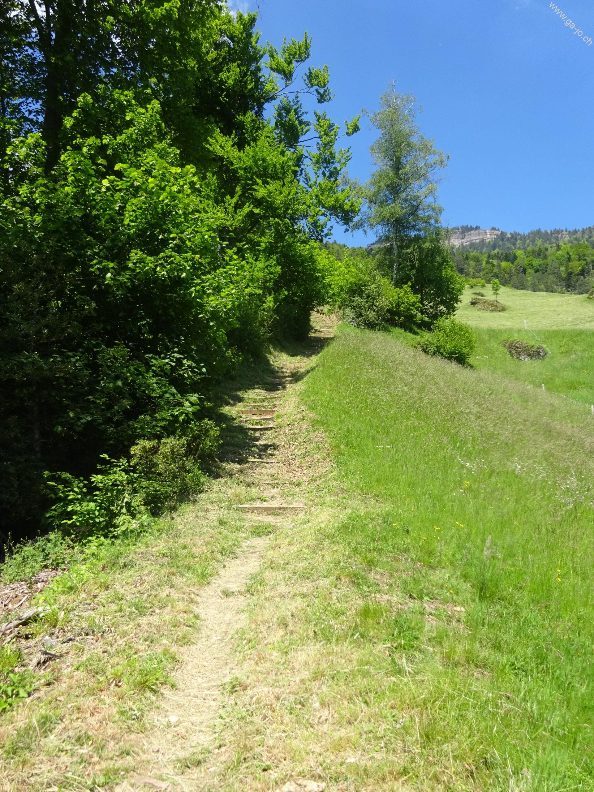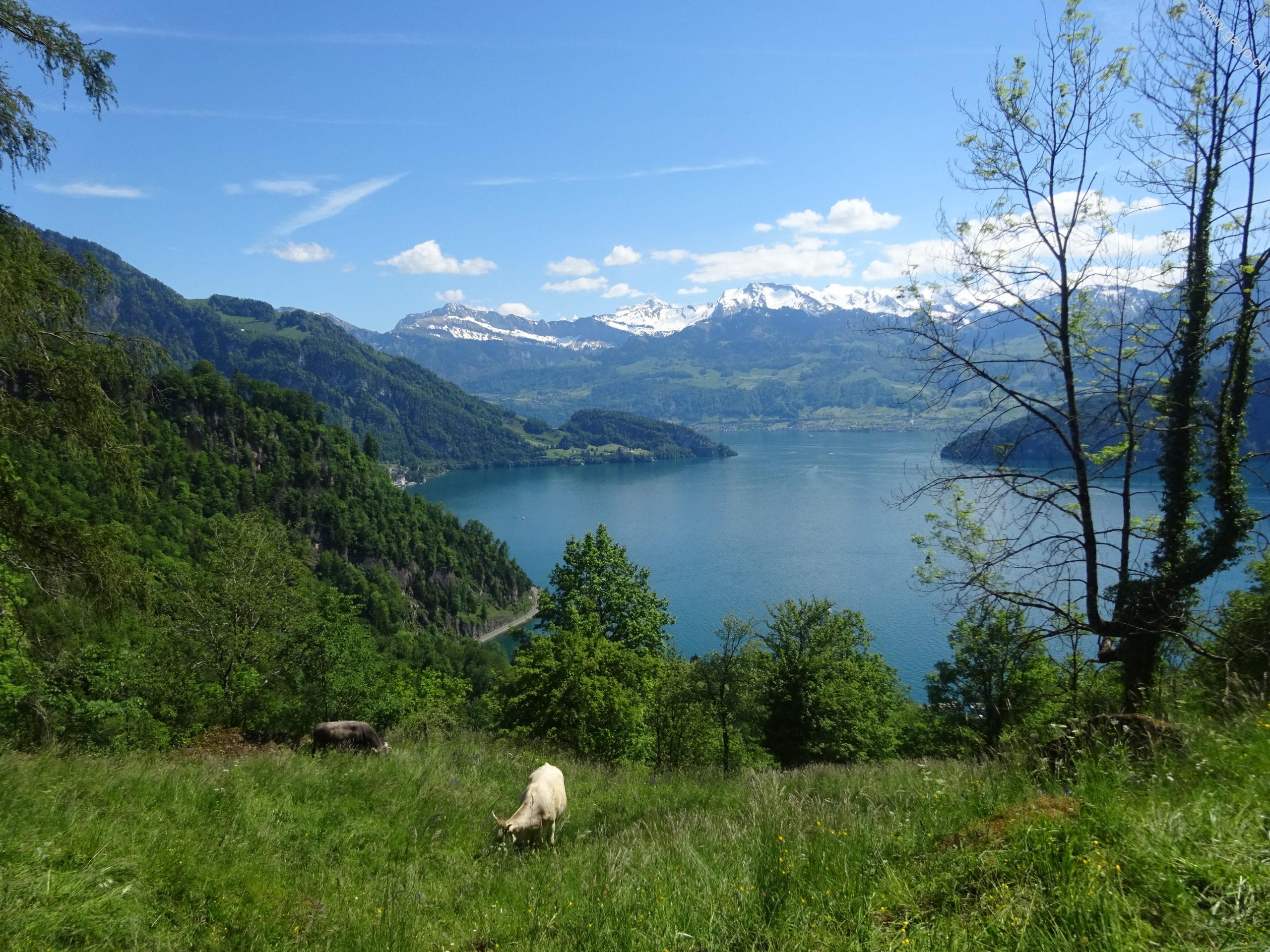 De Vitznau, le chemin monte sur les hauts de la ville jusqu’à un quartier d’habitation et s’oriente au nord à travers les pâturages avec un montée assez raide et éprouvante, surtout juste après le repas. Ce chemin change de catégorie et traverse la forêt à flanc de coteau jusqu’à rejoindre une route peu fréquentée jusqu’à Weggis. C’est là le seul passage à peine plus “technique” qui vaut la cotation T2 à cette randonnée, tout en restant tout à fait accessible.