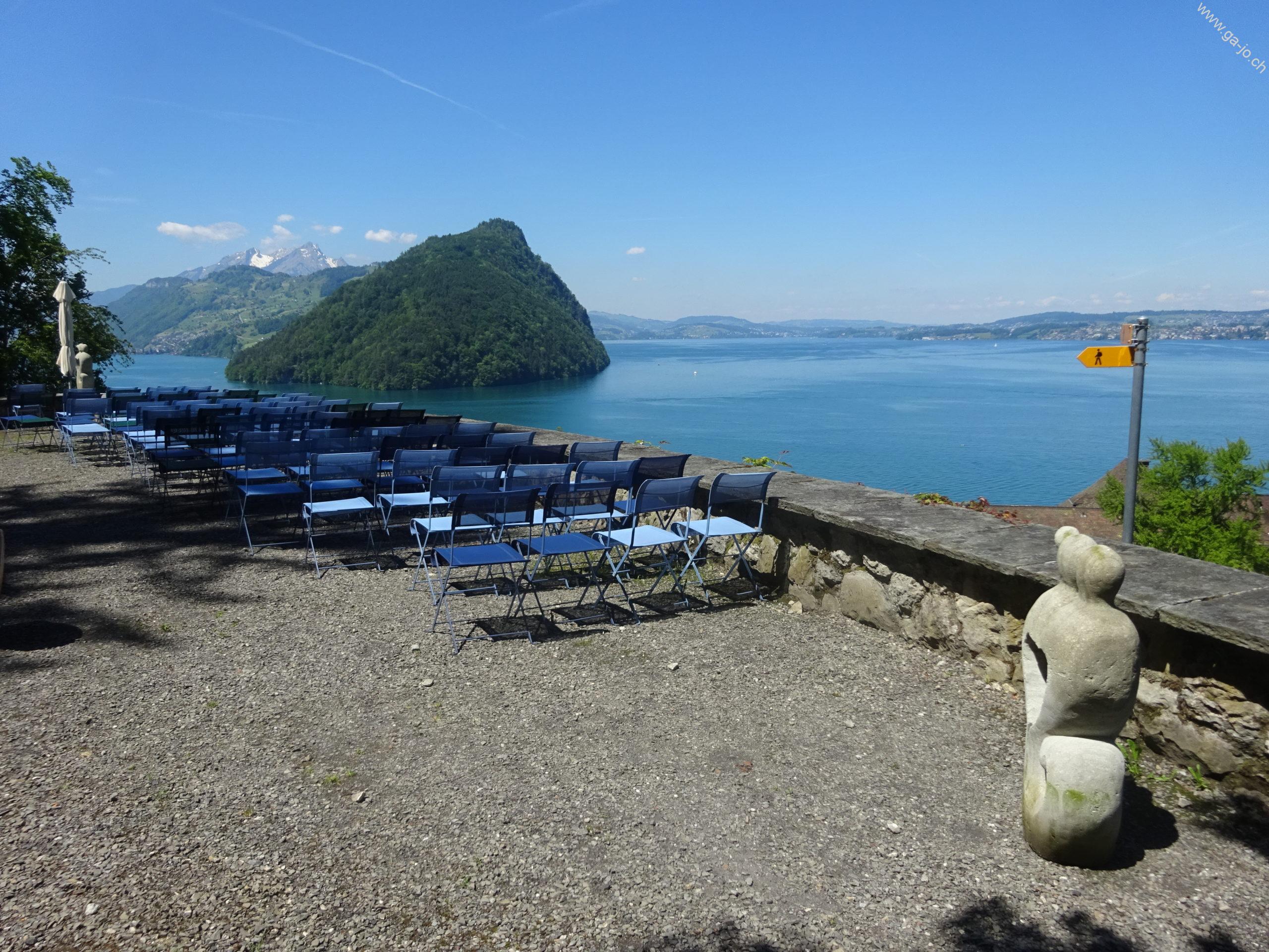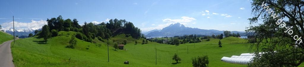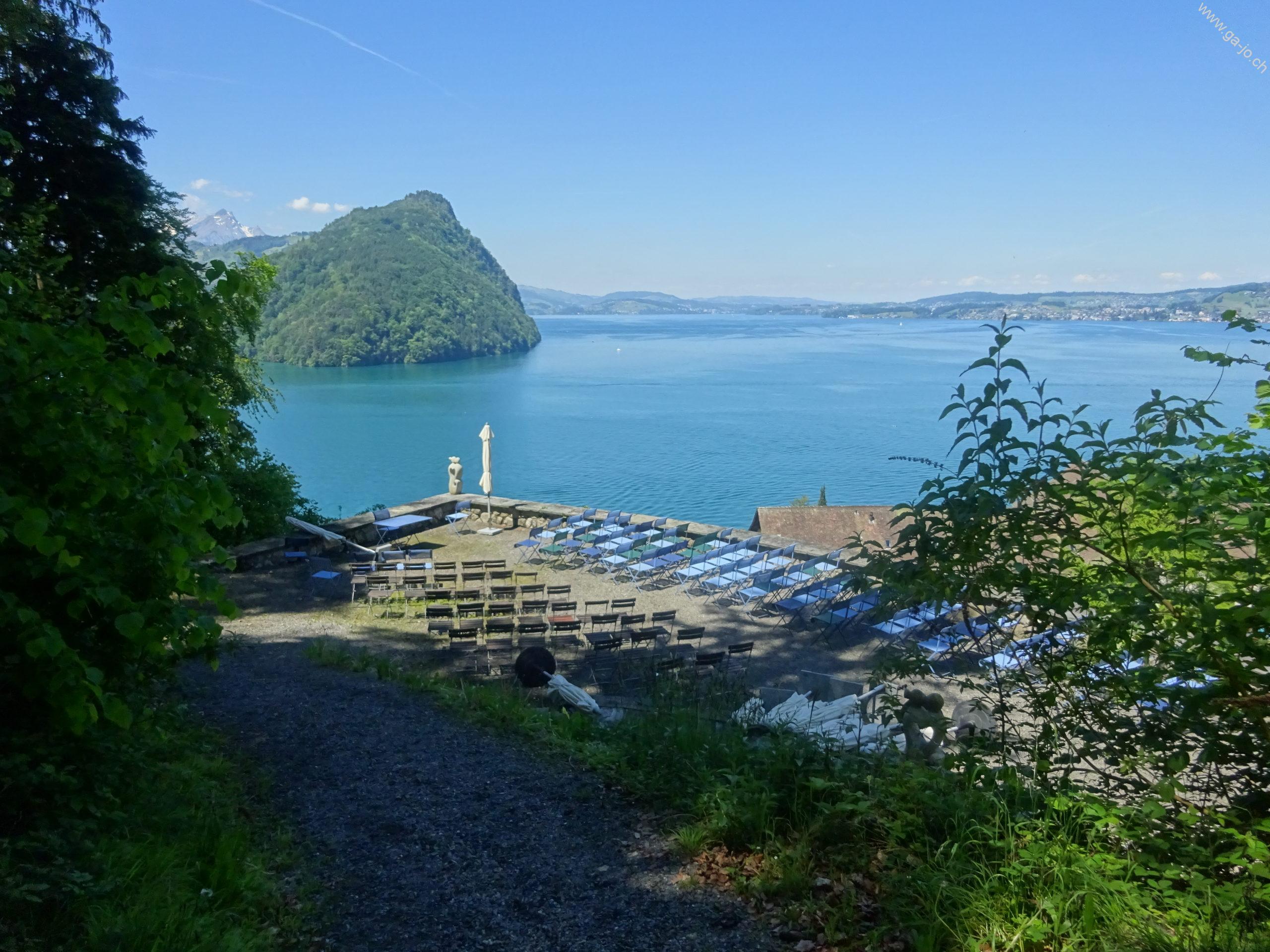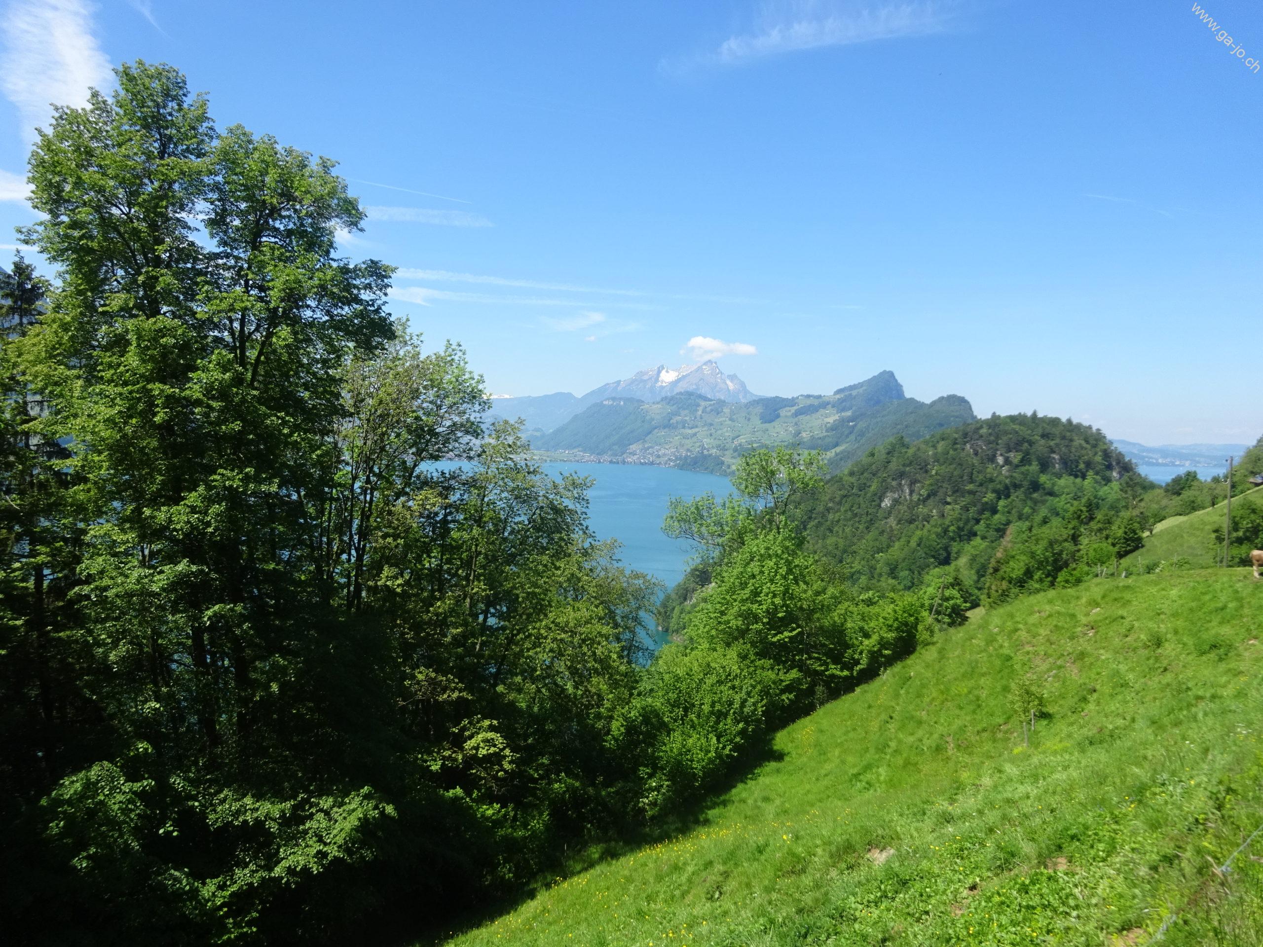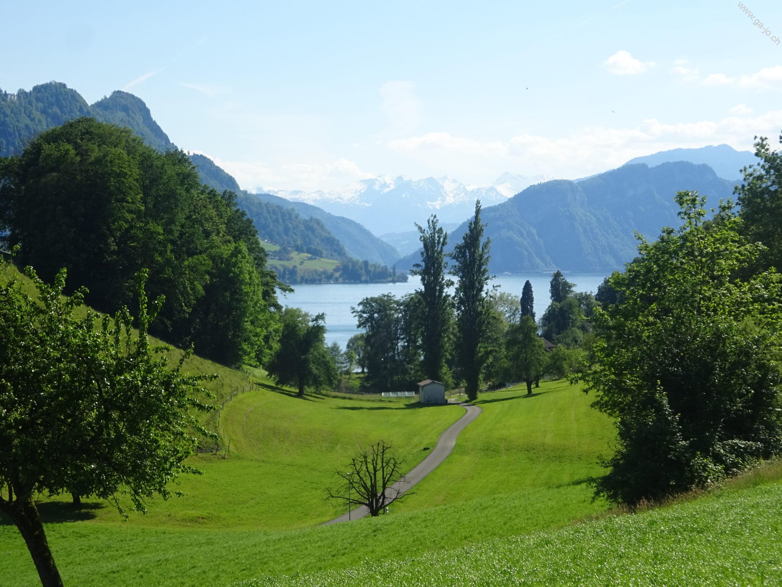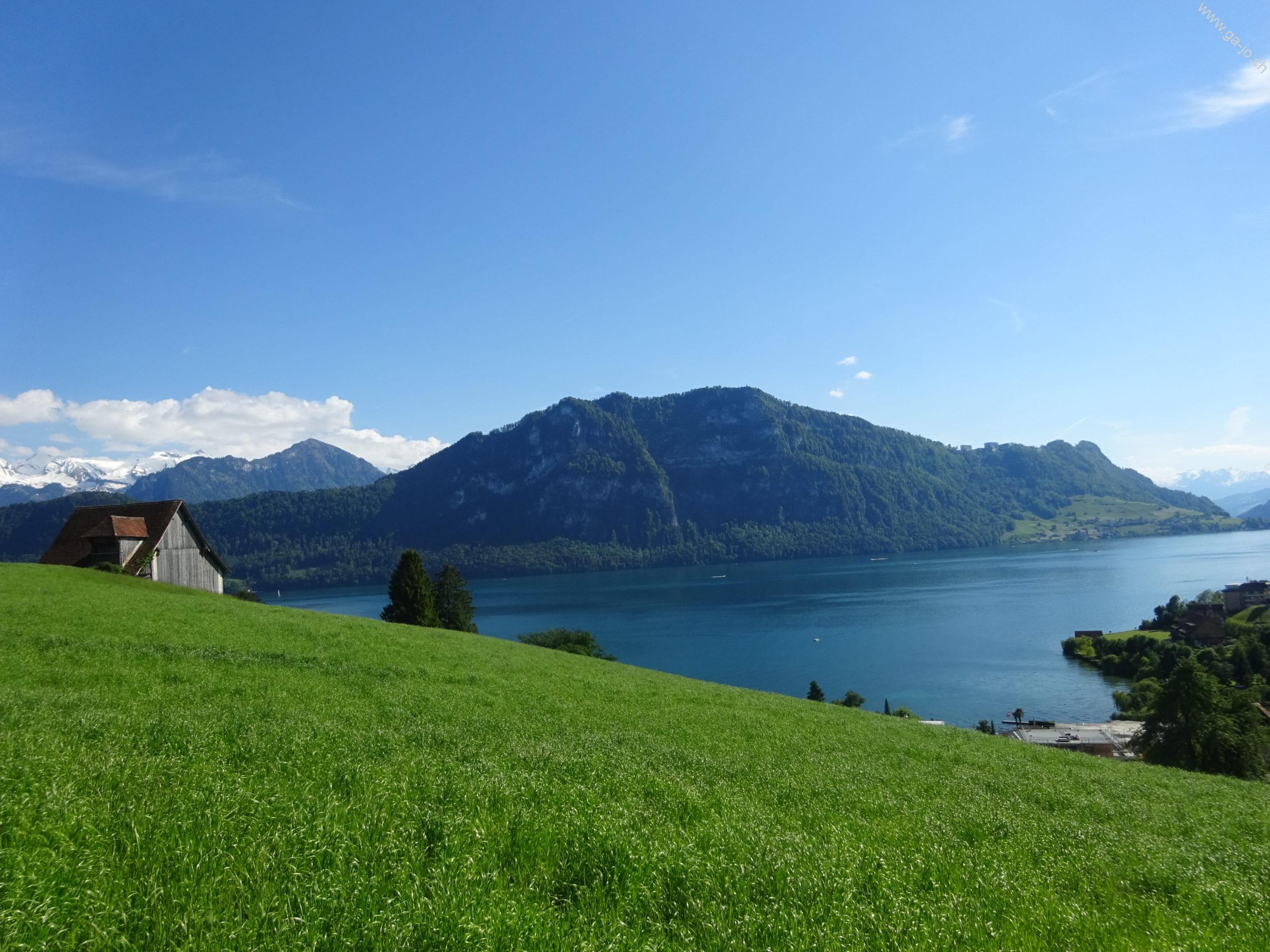 A Gersau, le chemin monte à droite en suivant le canal, puis bifurque à gauche, pour nous emmener vers l’ouest à flanc de coteau jusqu’à Bürglen où l’on rejoint la route cantonale menant à Vitznau. Un petit détour par le bord du lac à Vitznau pour le pique-nique et on repart, on a encore un petit peu de chemin à parcourir.