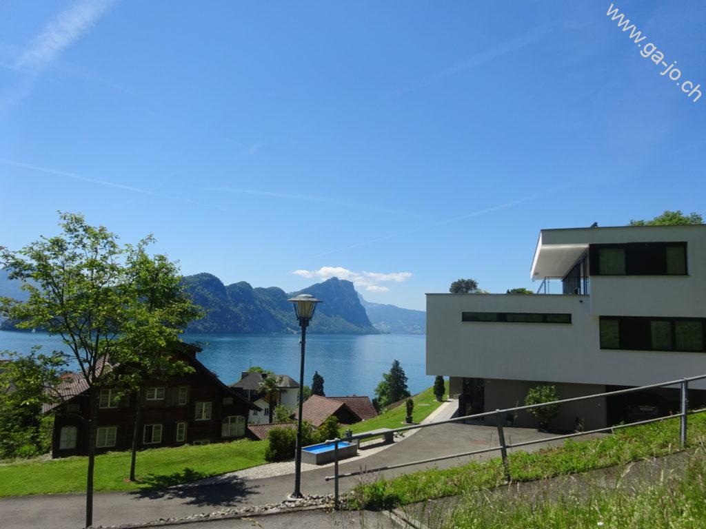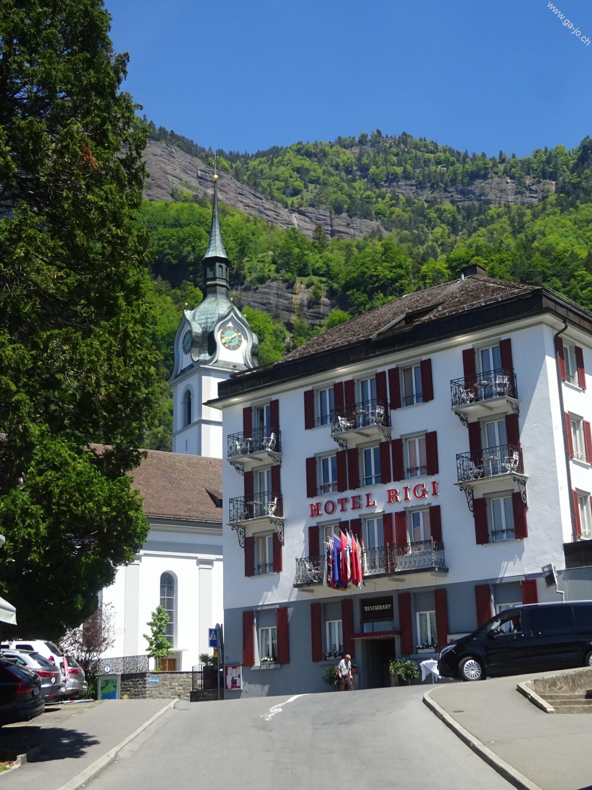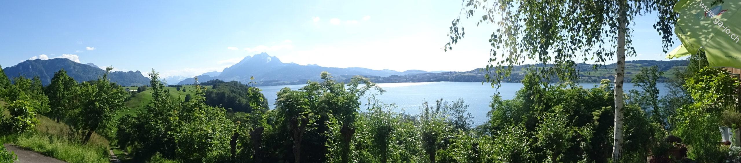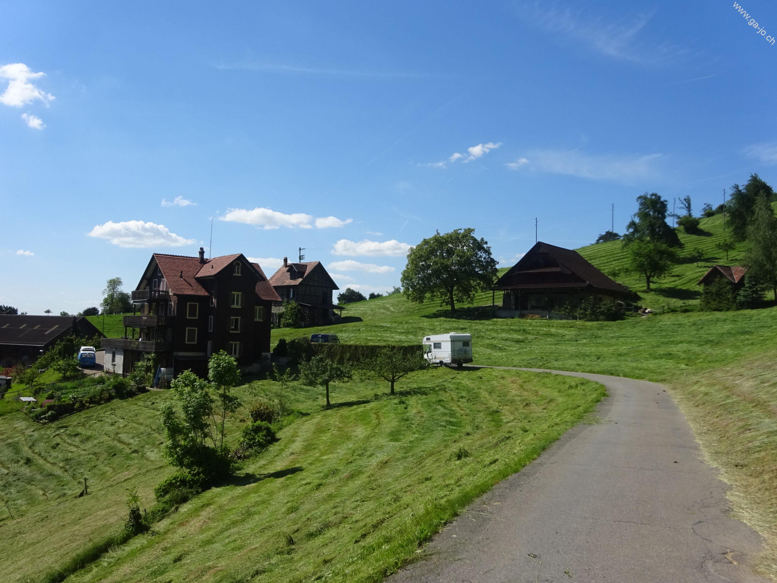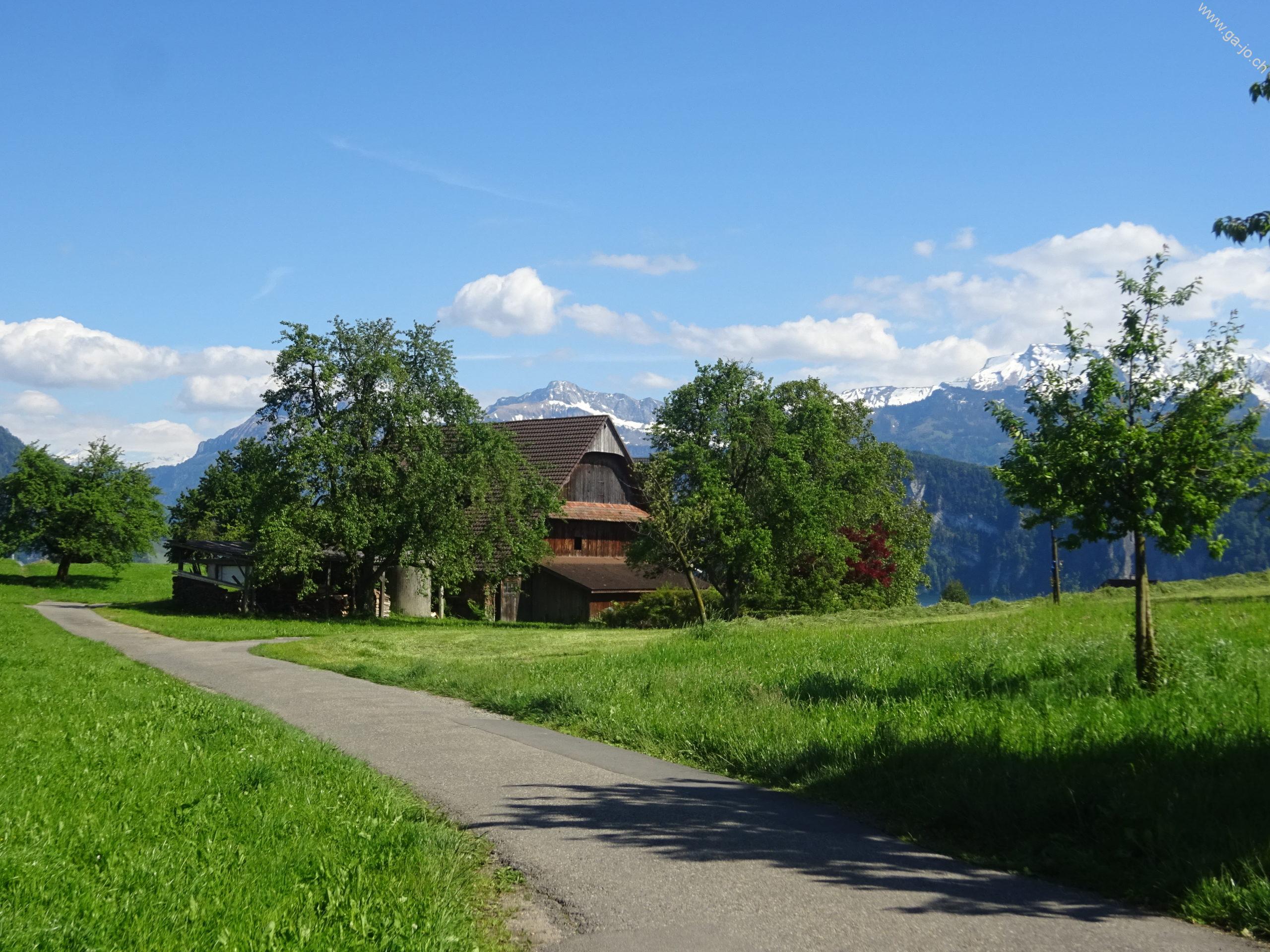 A Gersau, le chemin monte à droite en suivant le canal, puis bifurque à gauche, pour nous emmener vers l’ouest à flanc de coteau jusqu’à Bürglen où l’on rejoint la route cantonale menant à Vitznau. Un petit détour par le bord du lac à Vitznau pour le pique-nique et on repart, on a encore un petit peu de chemin à parcourir.