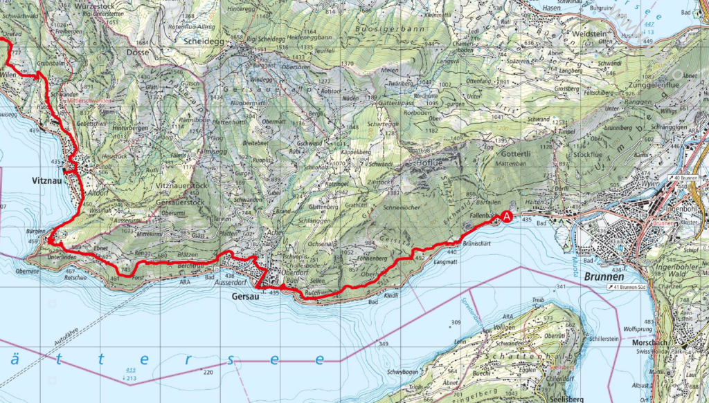 Ce tronçon entre Brunnen et Küssnacht am Rigi est assez long. Il s’agit en fait de deux des tronçons du Waldstätterweg que nous avons décidé de parcourir en une journée. Afin de raccourcir un petit peu ces derniers, le début entre Brunnen centre et Fallenbach ainsi que la fin entre Greppen et Küssnacht on été faits en bus. Il faut dire que ces bouts de chemin ne sont pas très intéressant et longent principalement la route cantonale.